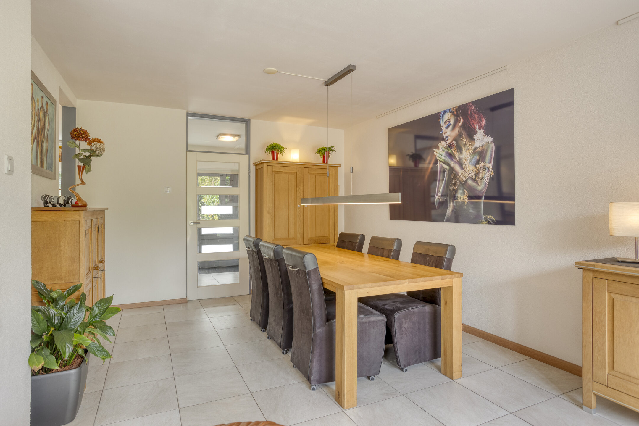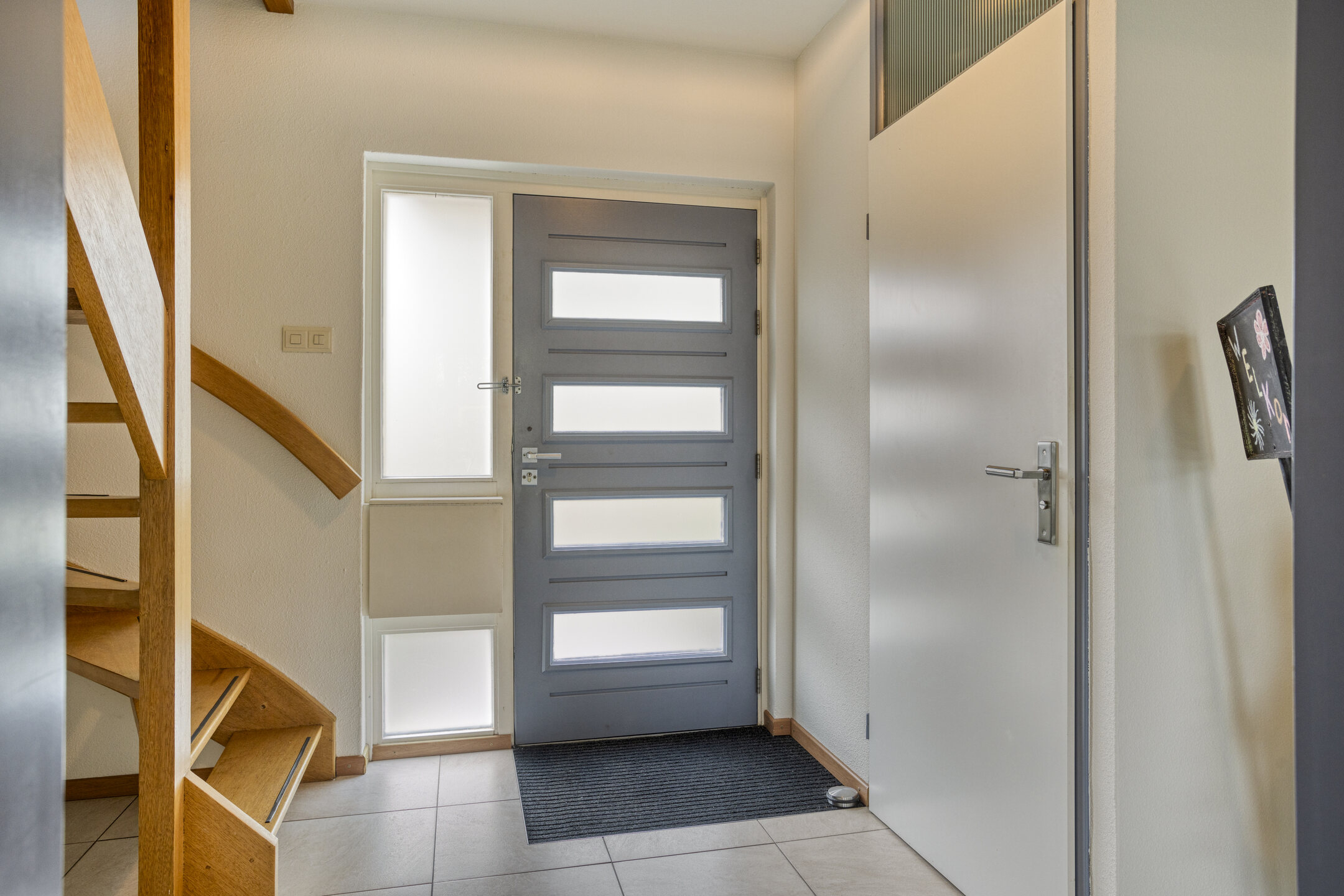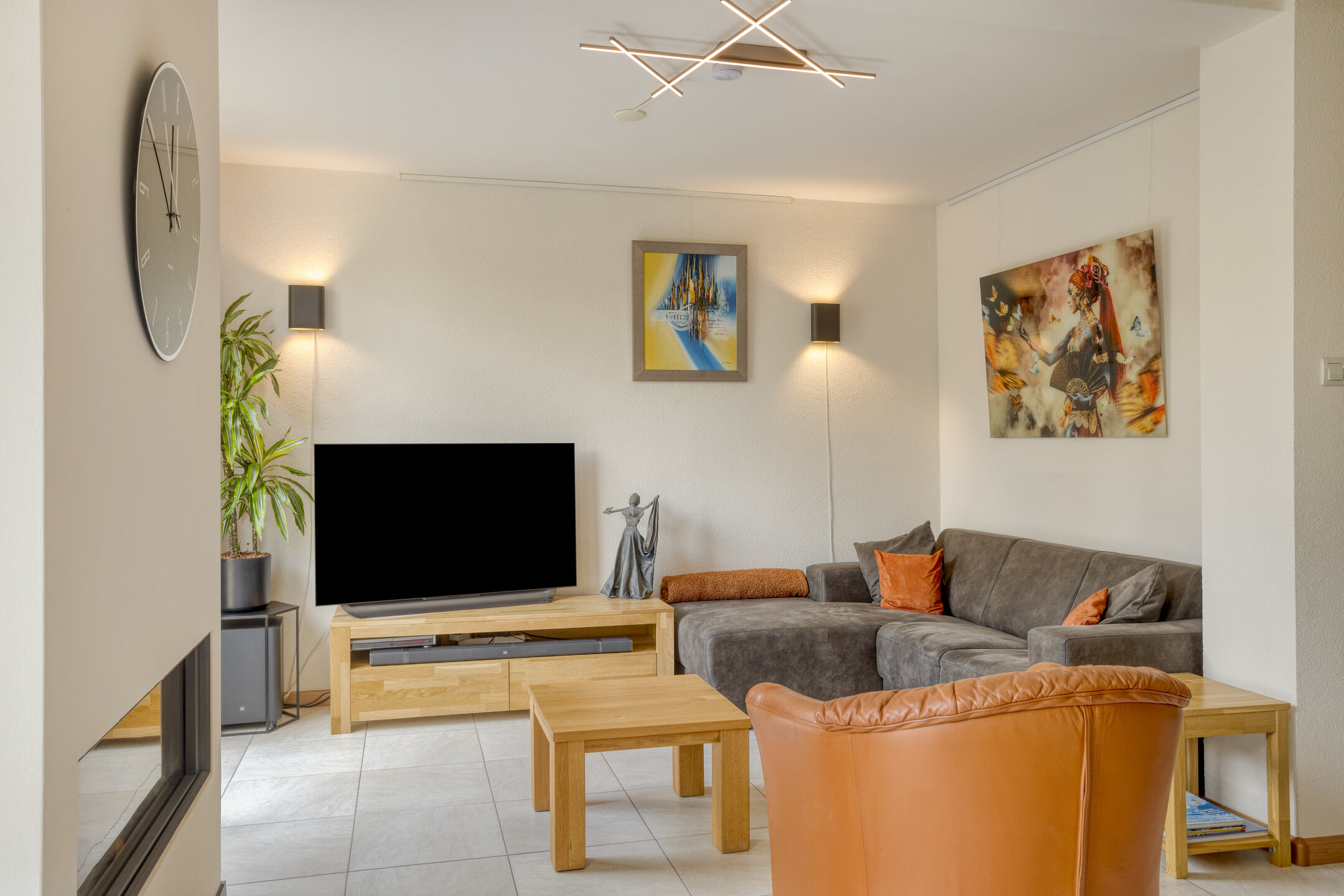 Je komt binnen in een ruime hal met garderobenis en toilet, die toegang geeft tot de woonkamer. Hier ervaar je meteen het gevoel van ruimte en licht. De royale living is sfeervol ingericht met een gashaard en grote raampartijen die zorgen voor een prettige lichtinval. De tegelvloer met vloerverwarming maakt het geheel comfortabel en aangenaam in elk seizoen.