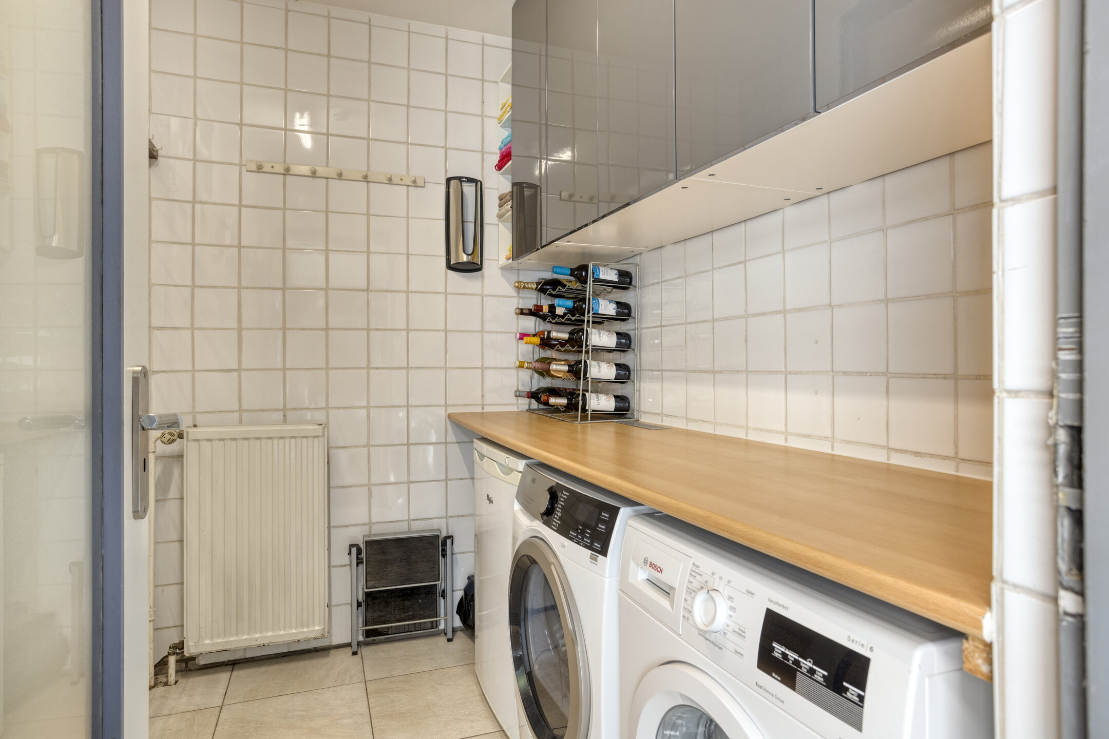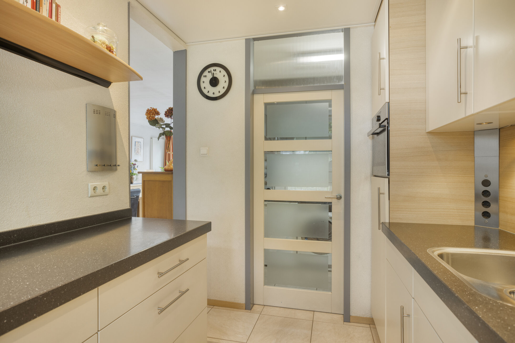 Aan de voorzijde van de woning bevindt zich de open keuken in een moderne U-opstelling. Deze is compleet uitgevoerd met diverse inbouwapparatuur, waaronder een combimagnetron (2023), vaatwasser (2020), koelkast, vriezer, inductiekookplaat, afzuigkap en een Quookerkraan met kokend, bruisend en gekoeld water (2018). Aansluitend vind je een praktische bijkeuken met aansluitingen voor wasapparatuur en extra bergruimte.