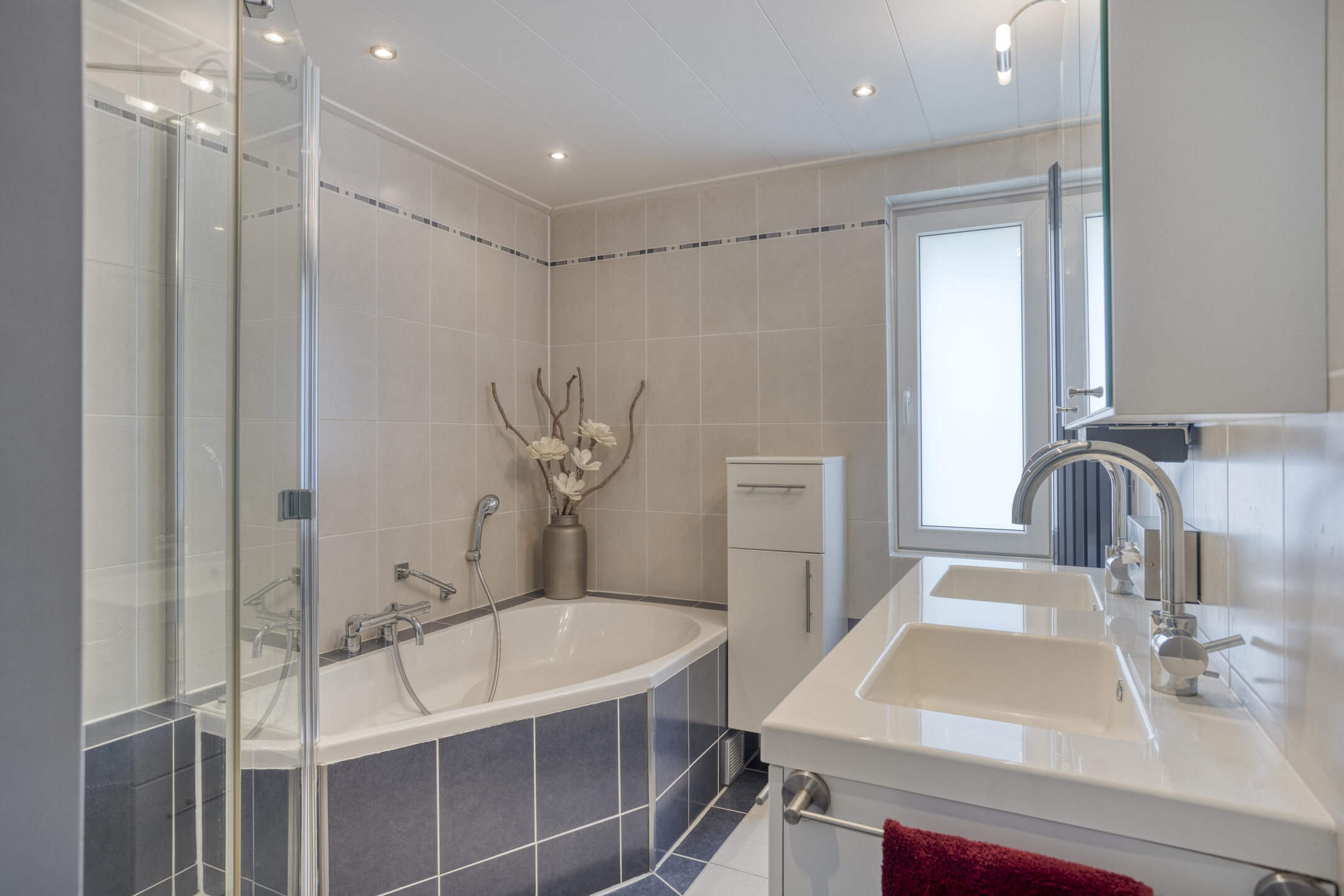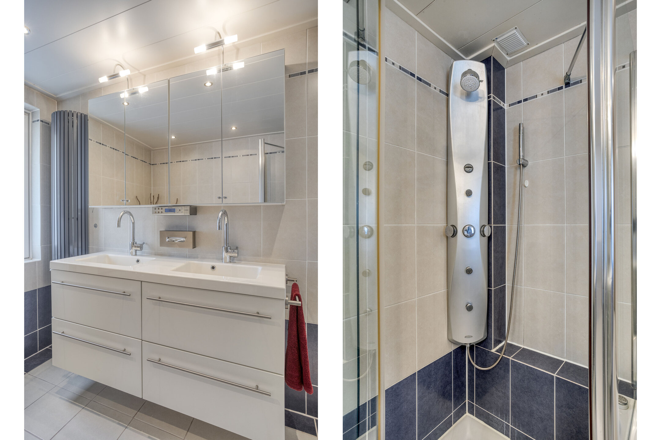 - Badkamervoorzieningen Ligbad, douche, dubbele wastafel, vloerverwarming