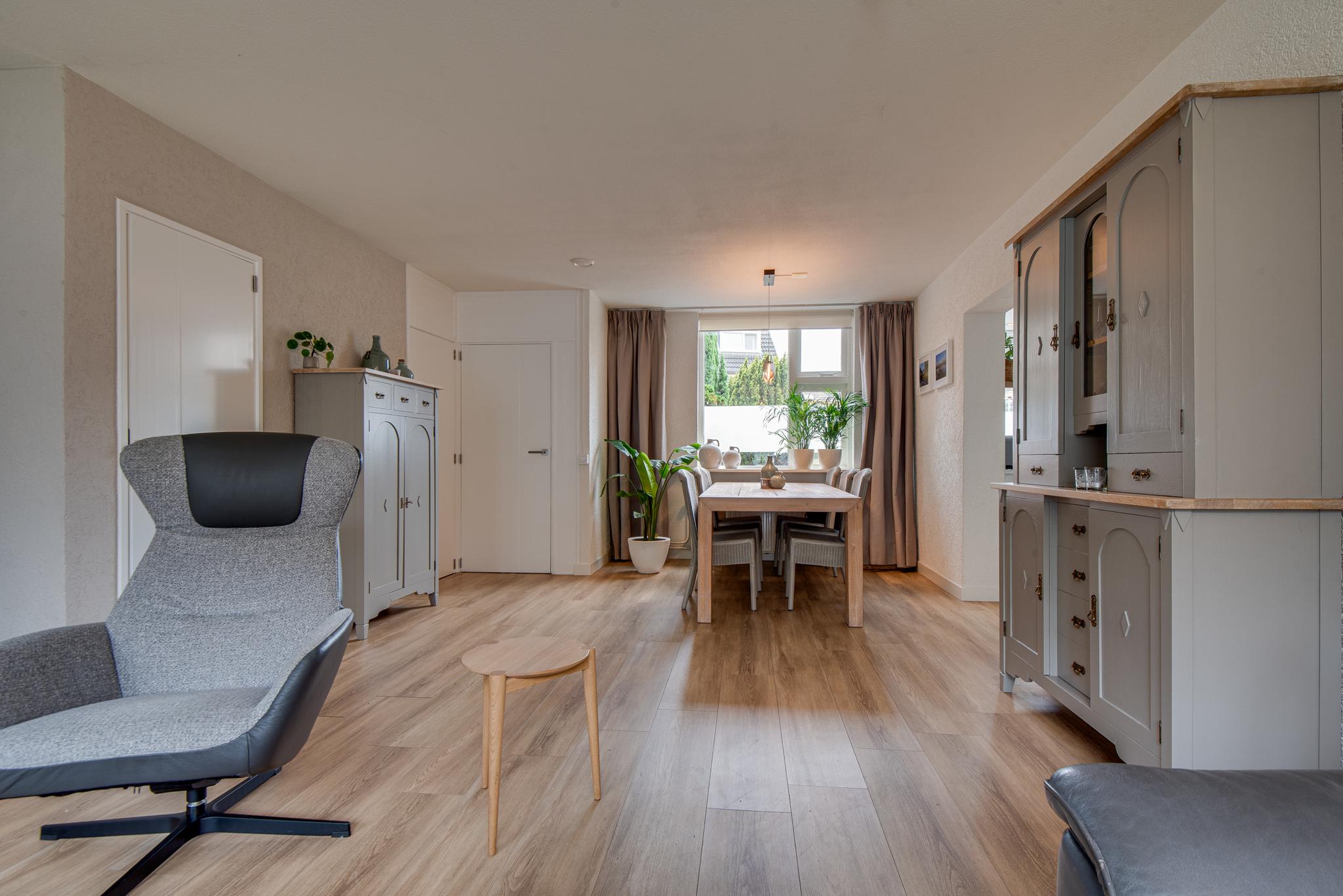 – de woonkamer is voorzien van laminaat met vloerverwarming, een stucwerk wand- en plafondafwerking en een achterdeur die toegang geeft naar de tuin;