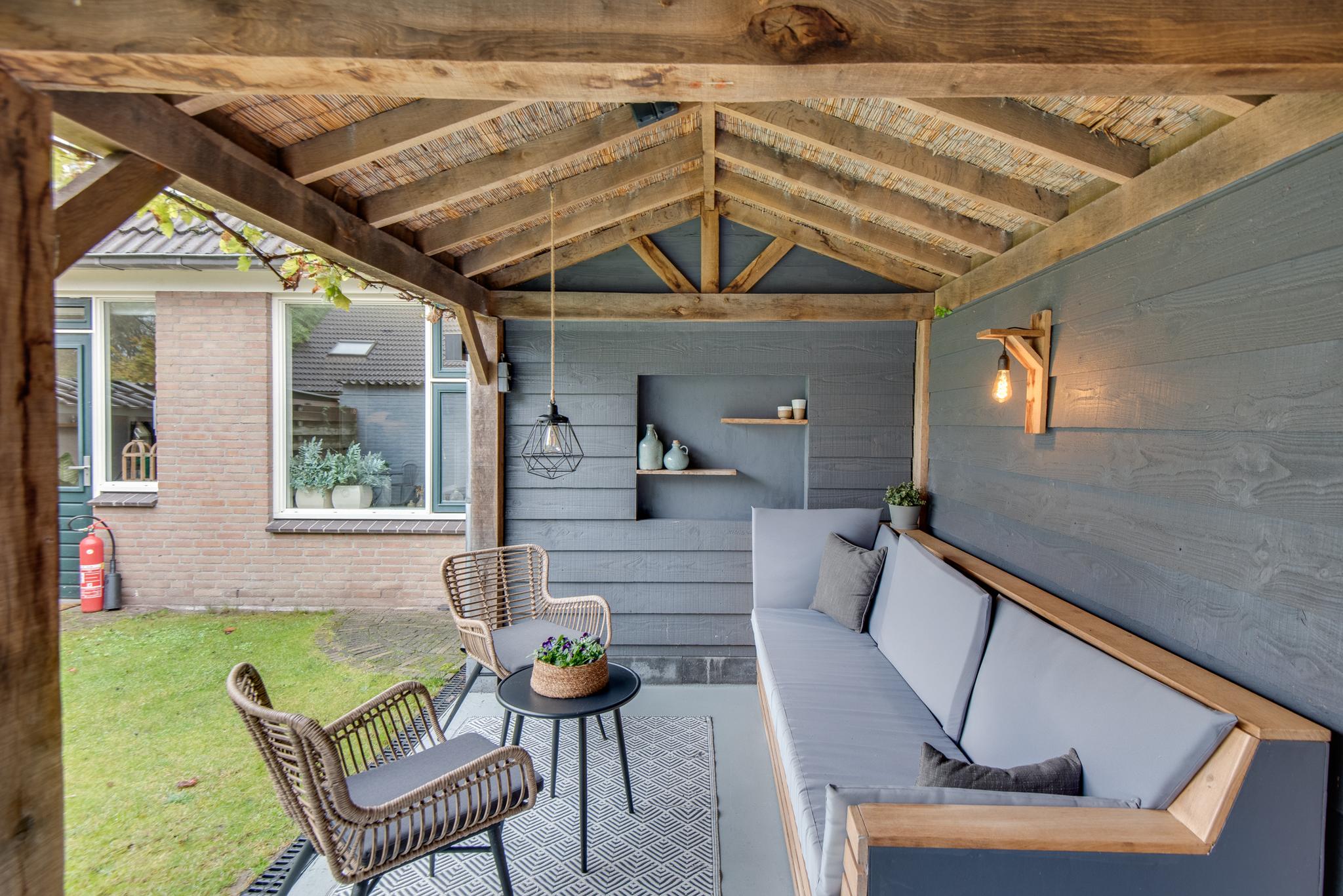 – de tuin is op het noordoosten gelegen en ingedeeld met een grasmat en een riante overkapping met keukenblok;