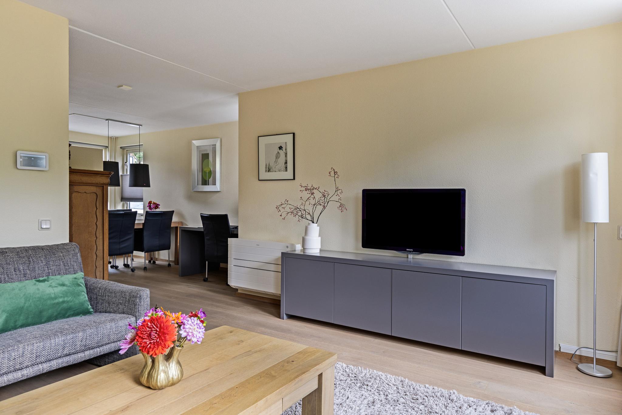 Bij binnenkomst via de hal, met toegang tot de meterkast, het toilet, de trappenkast, lichte woonkamer en een moderne keuken aan de voorzijde, ervaar je direct een ruimtelijke en aangename sfeer. De begane grond is voorzien van een eiken houten vloer die de ruimtes naadloos met elkaar verbindt. De woonkamer voorzien van airconditioning is tuingericht en heeft grote raampartijen die veel licht binnenlaten, met uitzicht op de verzorgde tuin op het zuiden. Aan de achtergevel is een elektrisch zonnescherm geplaatst, waardoor je optimaal van het buitenleven kunt genieten. De keuken is praktisch en goed onderhouden, met een 4-pits kookplaat, koel-/vriescombinatie, afzuigkap en vaatwasser.