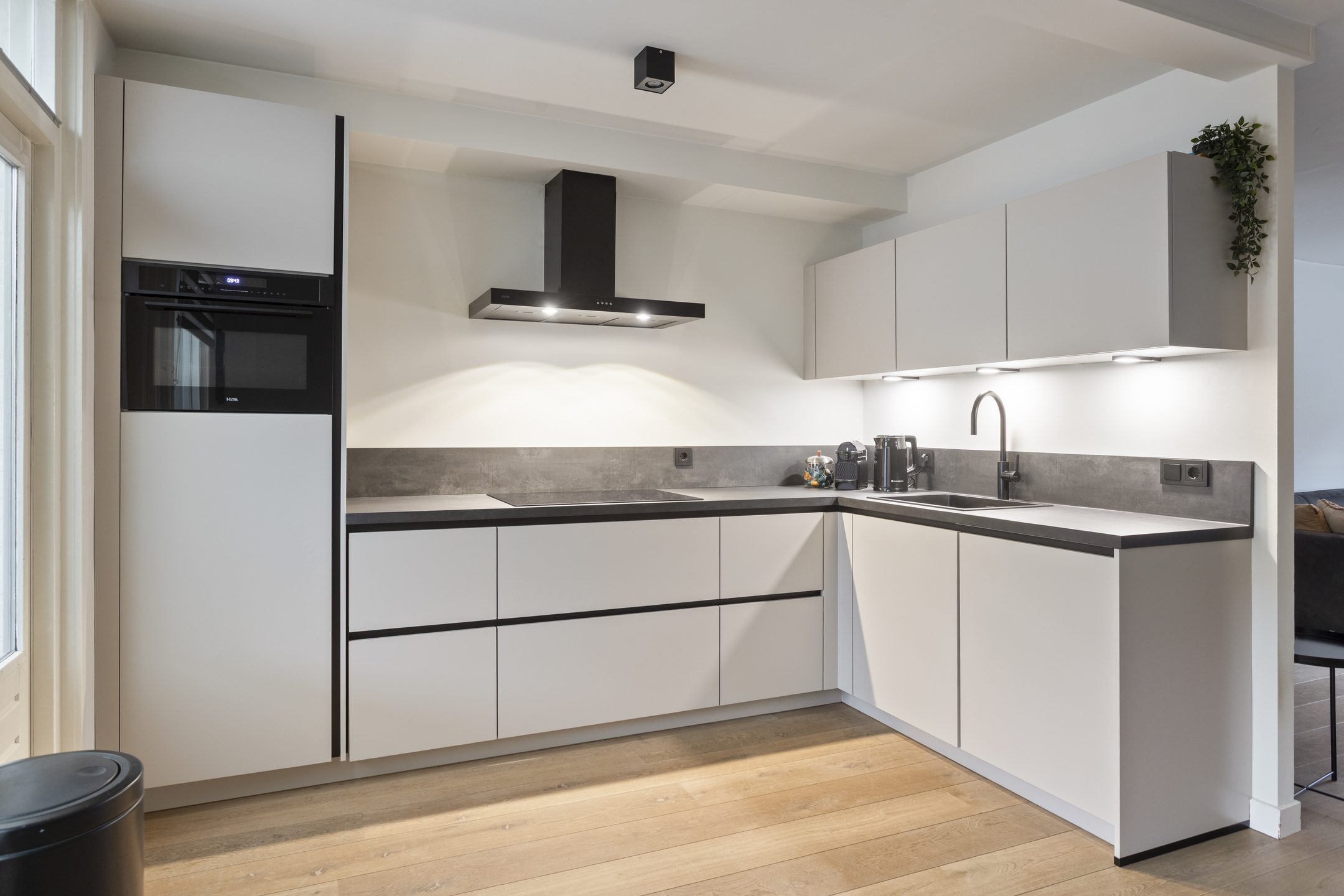 – moderne open keuken (2025) met inductiekookplaat, afzuigkap, combioven, koelkast, vaatwasser en een directe doorgang naar de tuin;