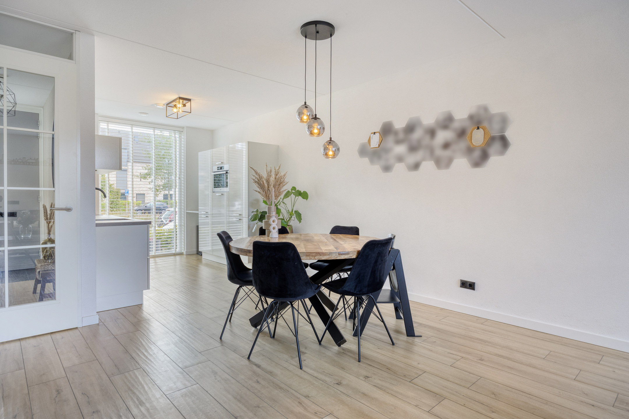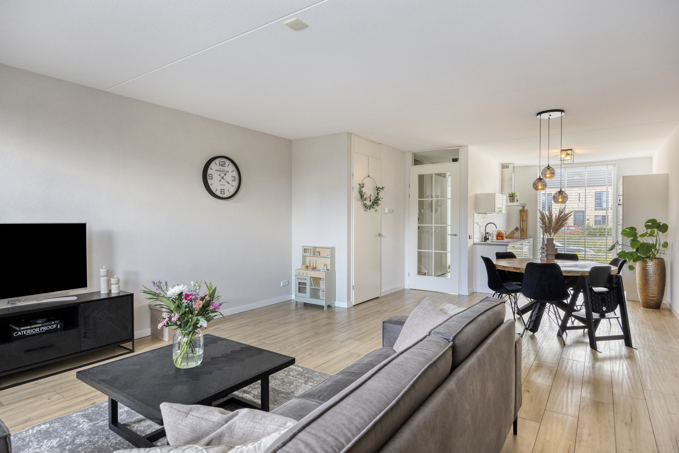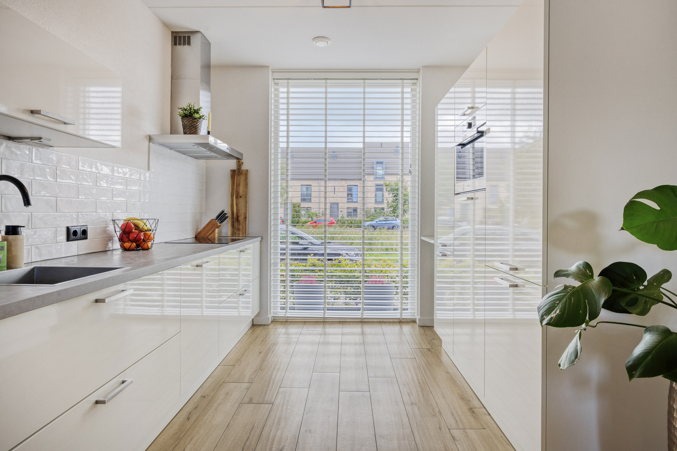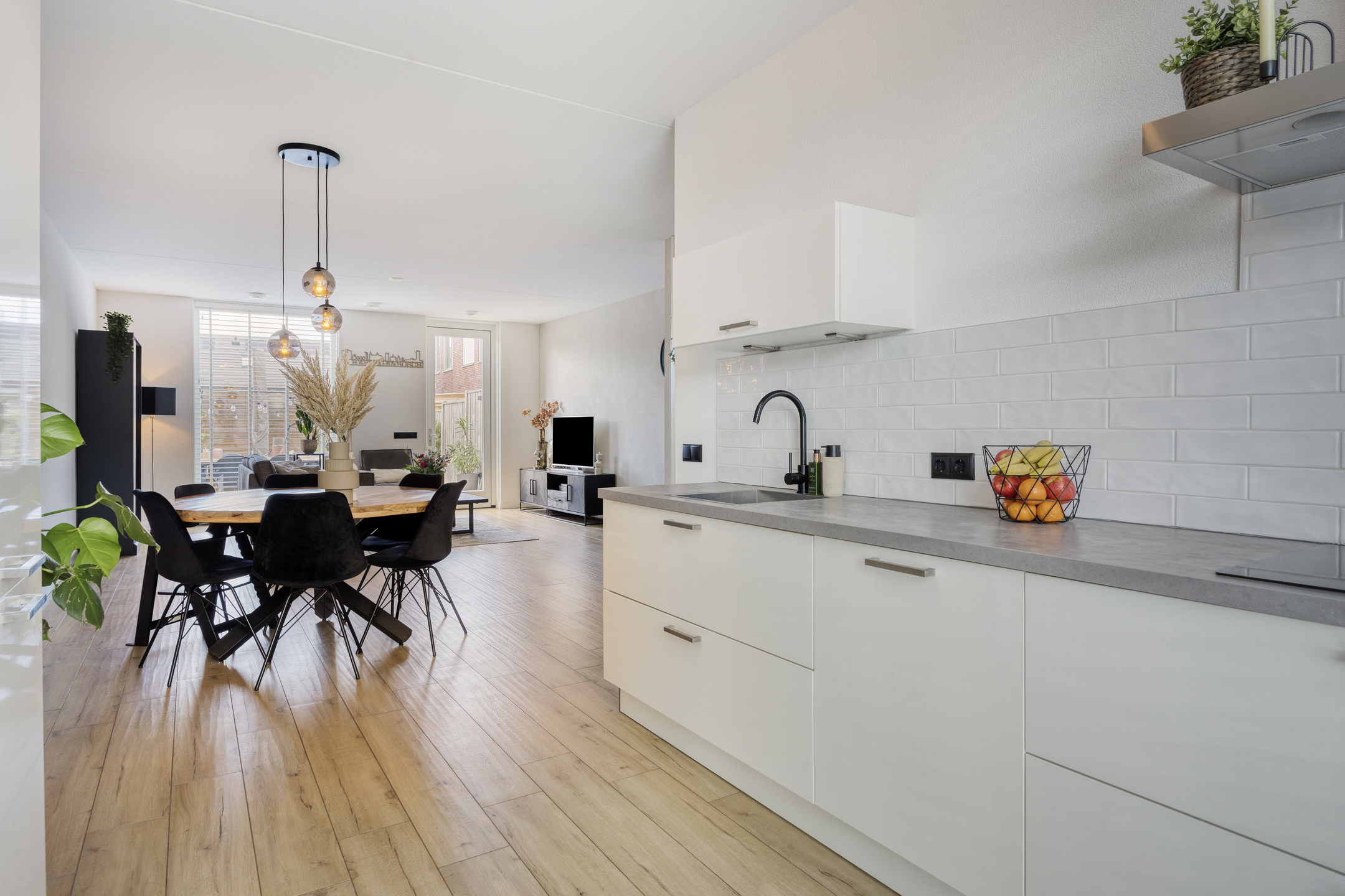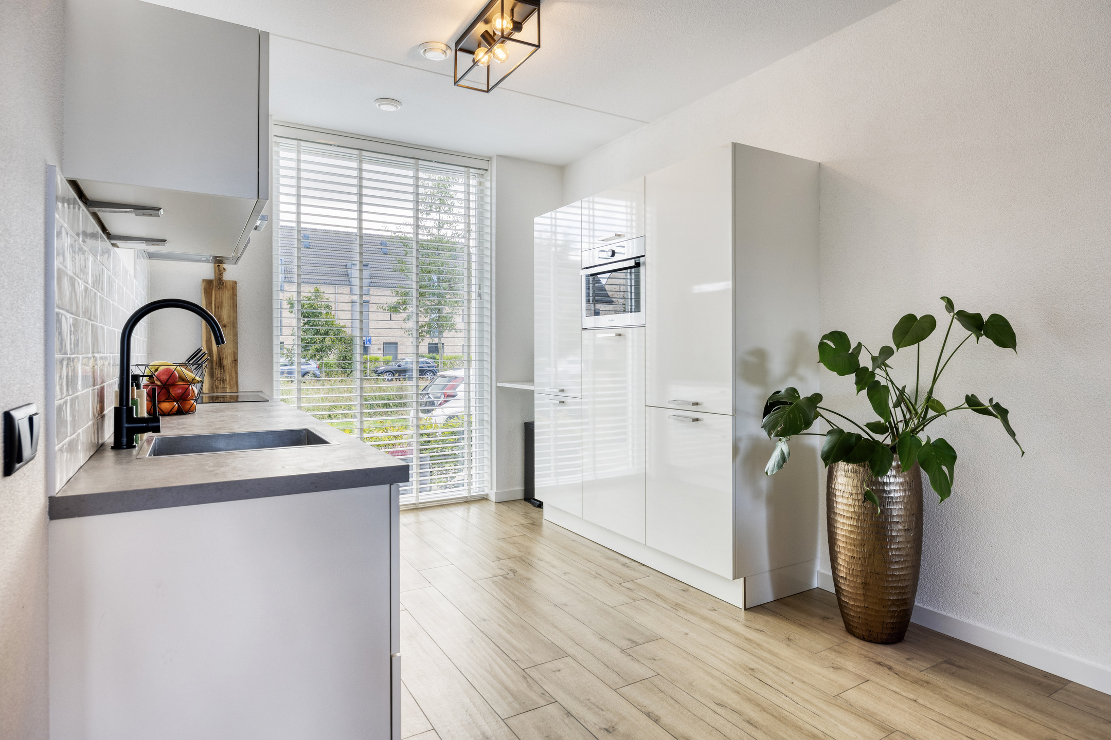 – de (half)open keuken is voorzien van diverse inbouwapparatuur, zoals een koelvriescombinatie, combi-magnetron, vaatwasser, inductiekookplaat en afzuigkap;