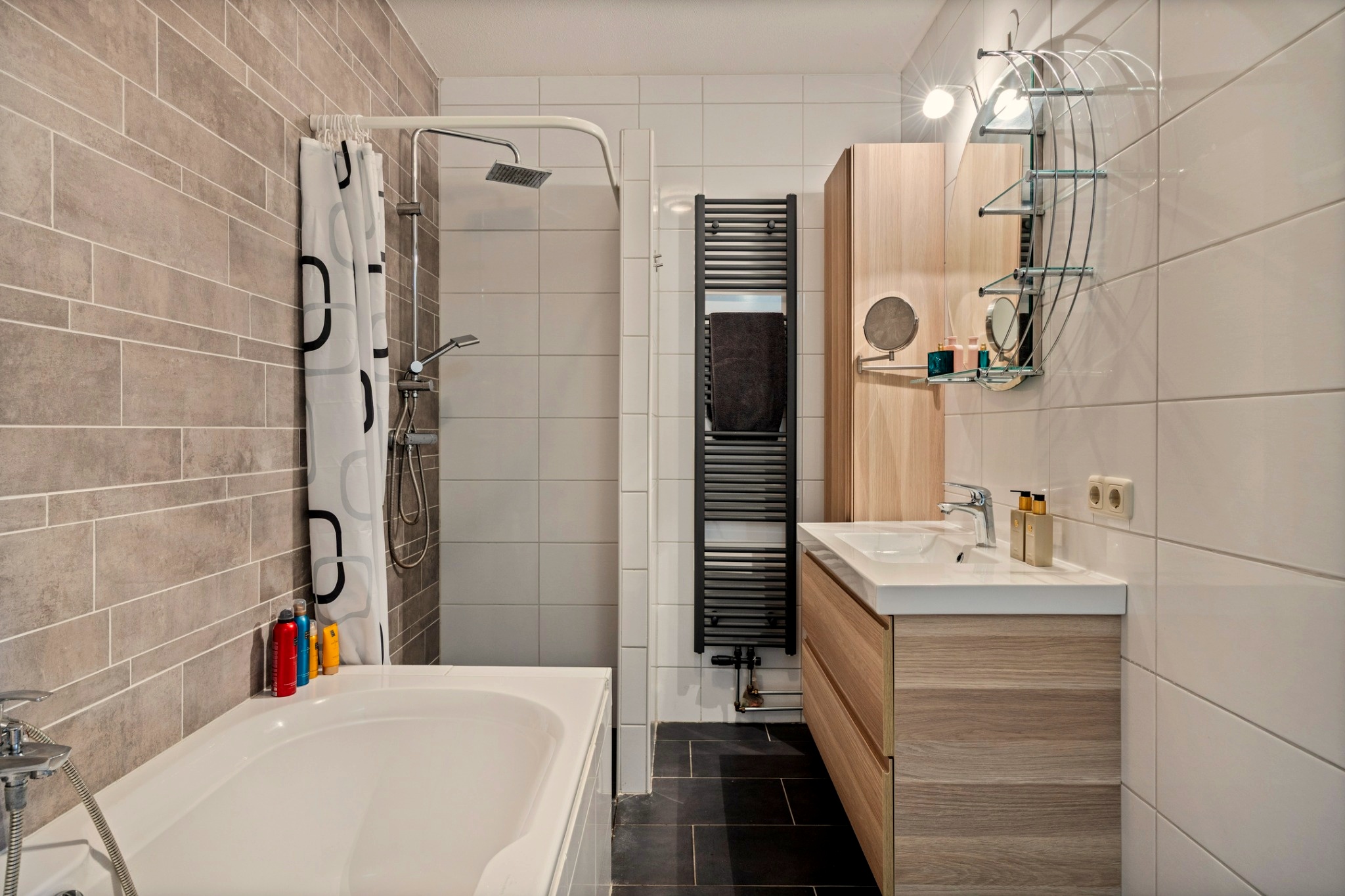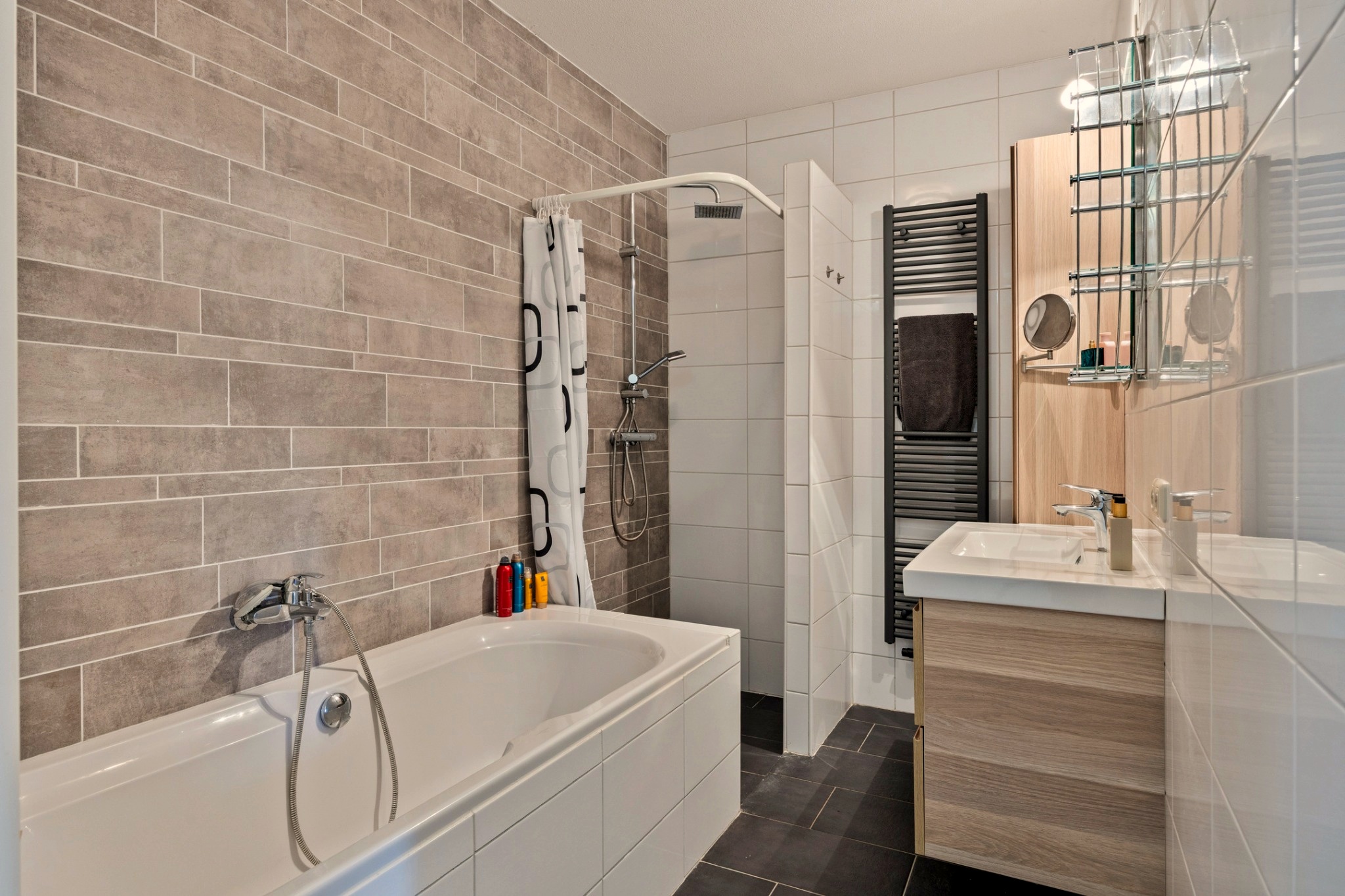 – de moderne badkamer beschikt over een inloopdouche, ligbad, een badkamermeubel met wastafel en een designradiator;