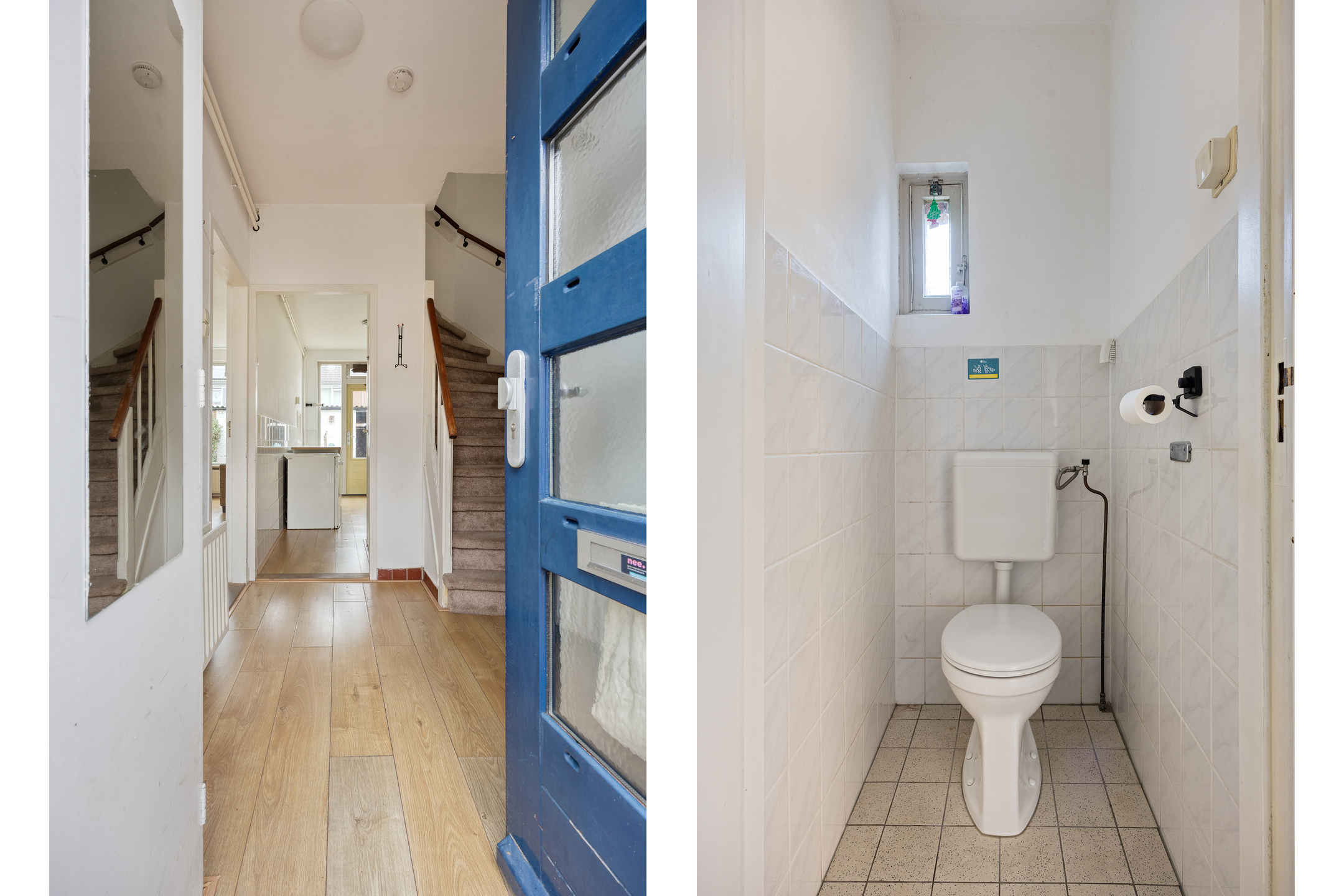 – bij binnenkomst kom je in de hal met toegang tot de meterkast, de volledig betegelde toiletruimte met staand closet en fonteintje en de trap naar de eerste verdieping;