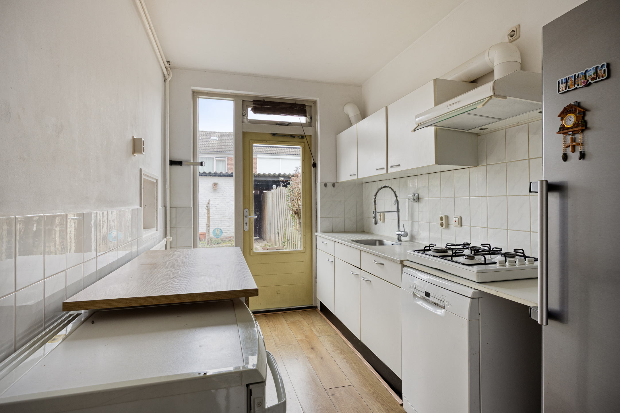 – de afgesloten keuken ligt aan de achterzijde, is voorzien van een eenvoudige keukenopstelling met losstaande apparatuur en biedt via een deur direct toegang tot de tuin;