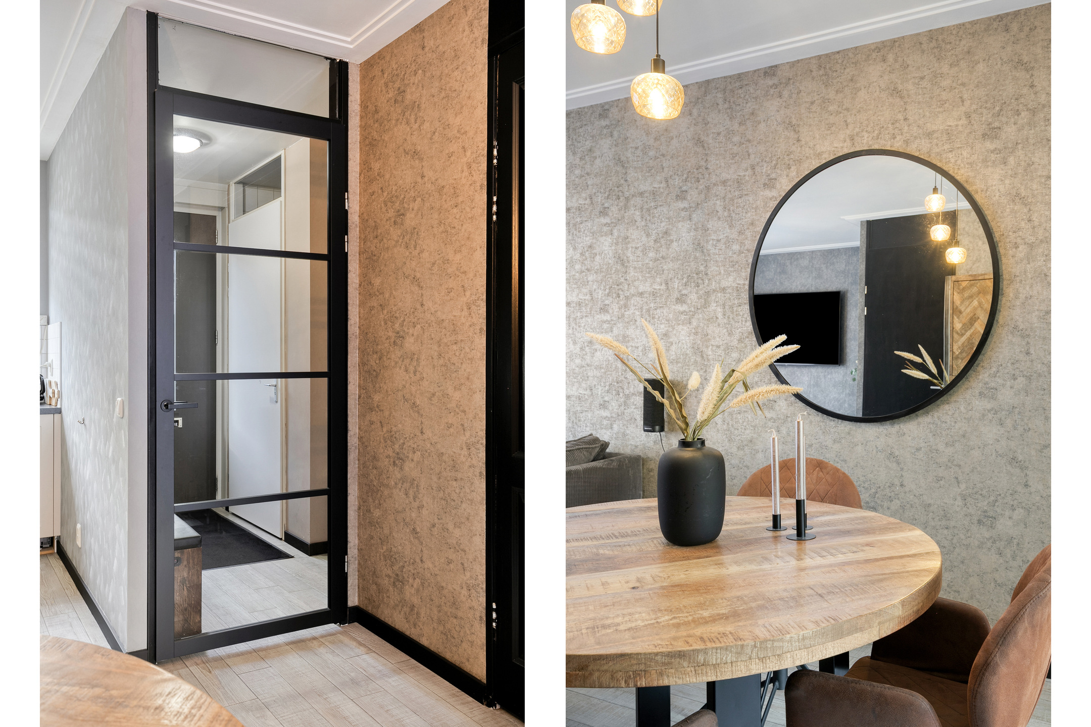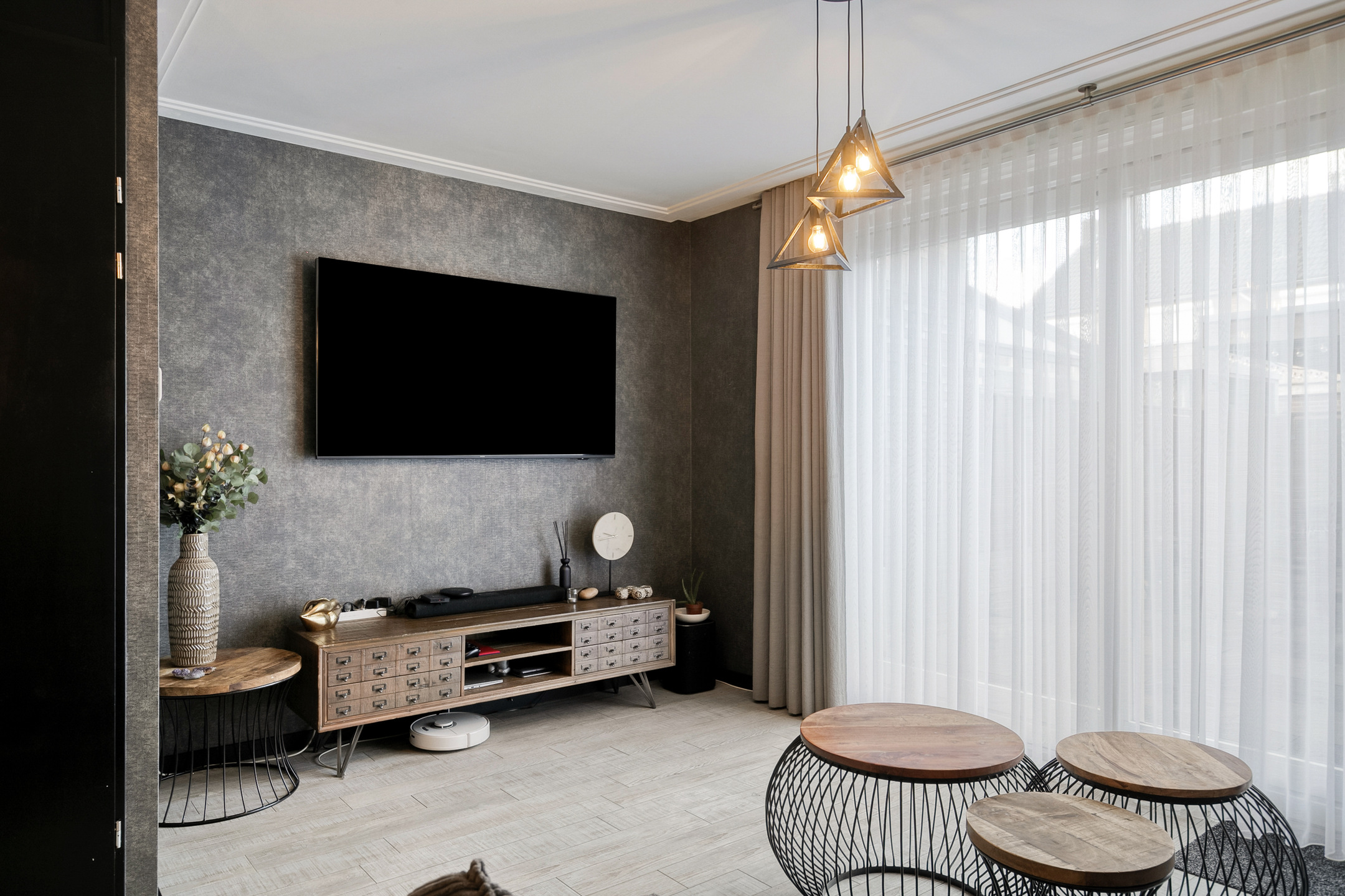 – de begane grond is voorzien van een moderne pvc vloer met vloerverwarming en een stucwerk plafondafwerking in combinatie met behangen wanden;