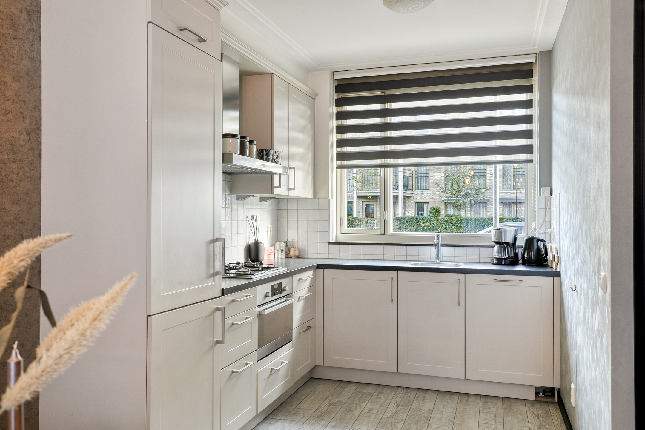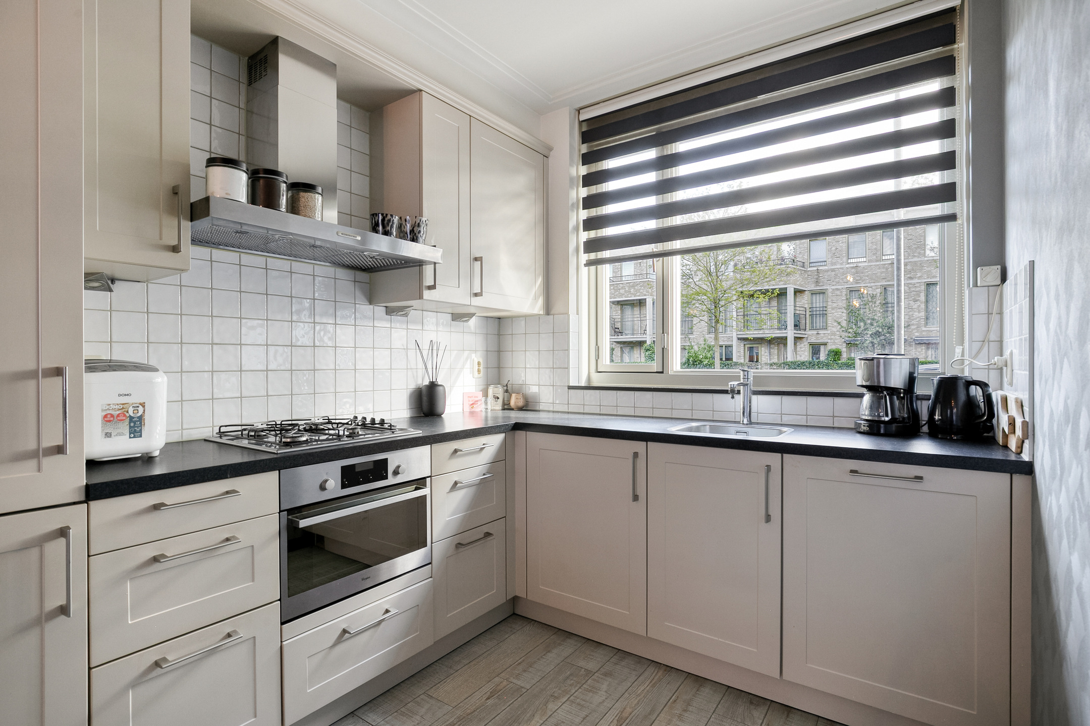 – de open keuken is uitgevoerd in een lichte kleurstelling en voorzien van diverse inbouwapparatuur zoals een gaskookplaat, afzuigkap, oven, vaatwasser en koelkast;
