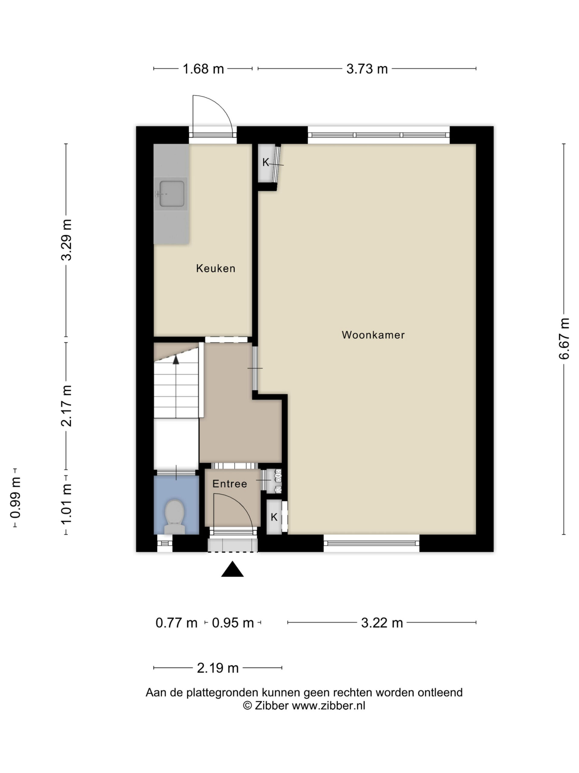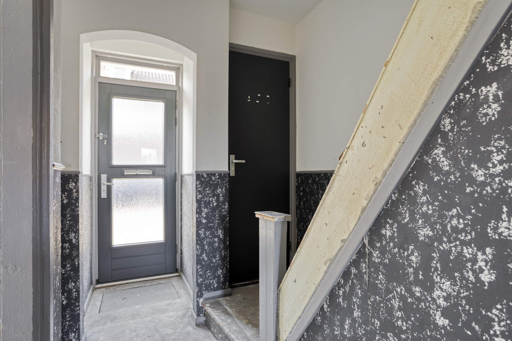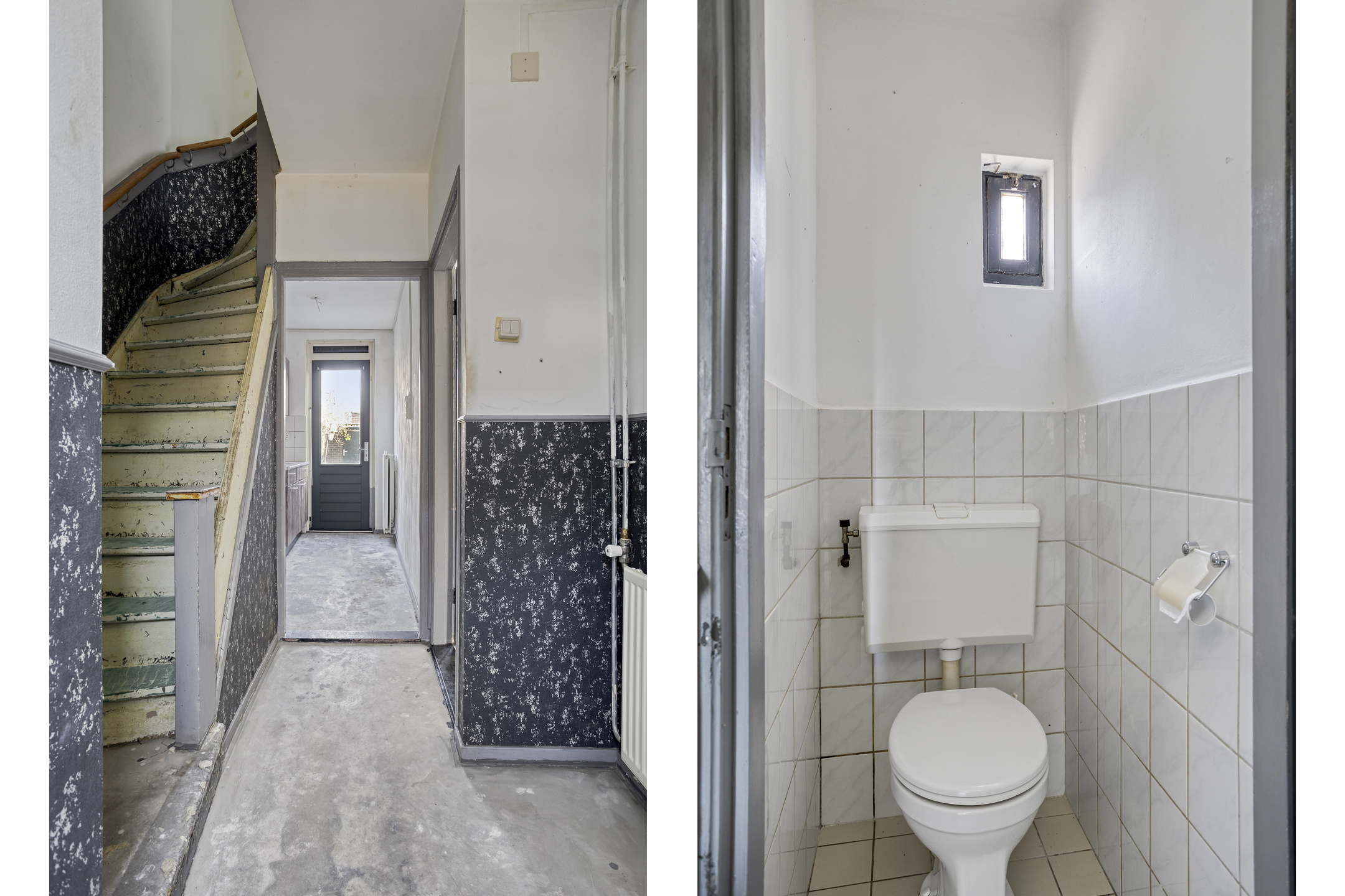 – je binnenkomt in een hal met meterkast, trapopgang, trapkast en toilet;