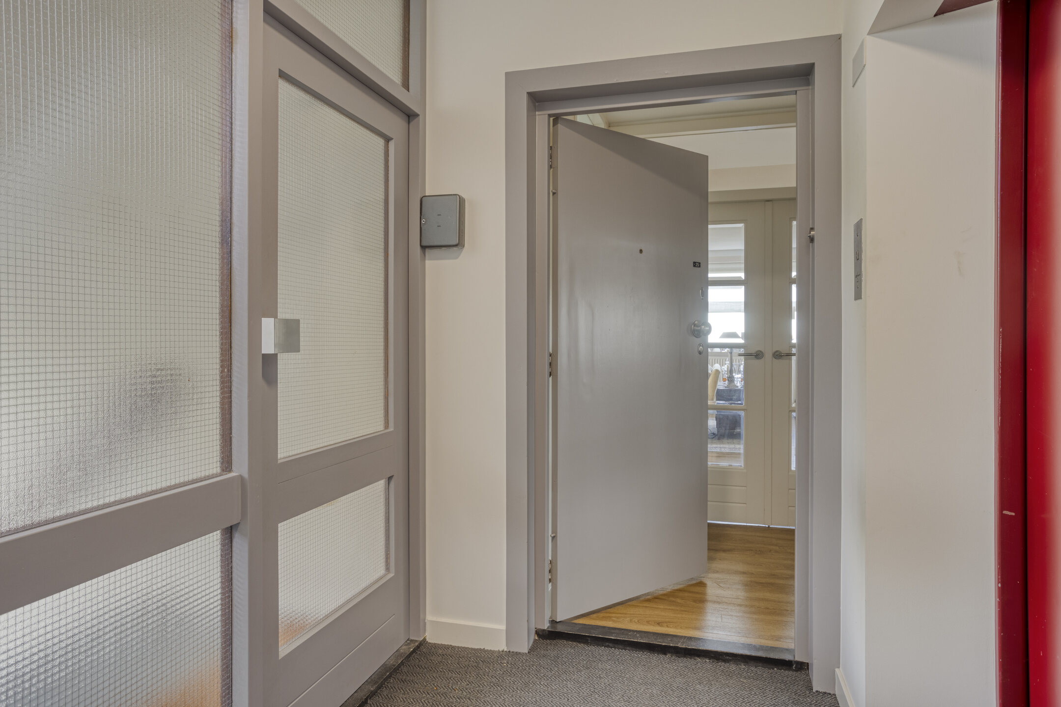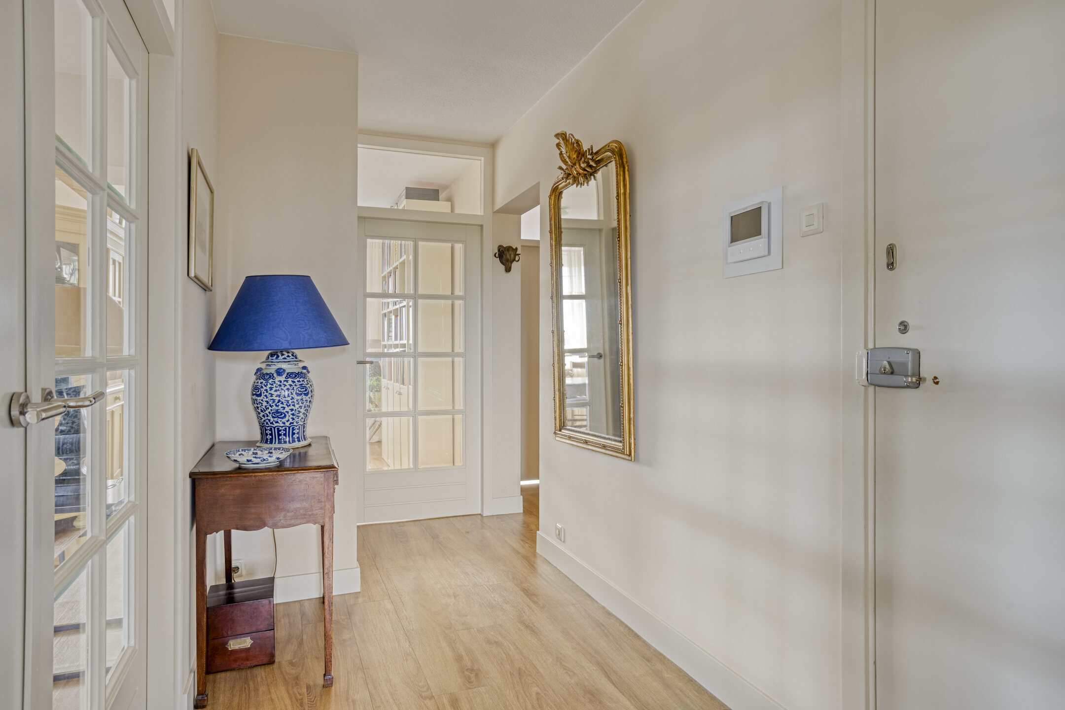 – de centrale hal is per lift bereikbaar en biedt toegang tot de inpandige entree van het appartement;