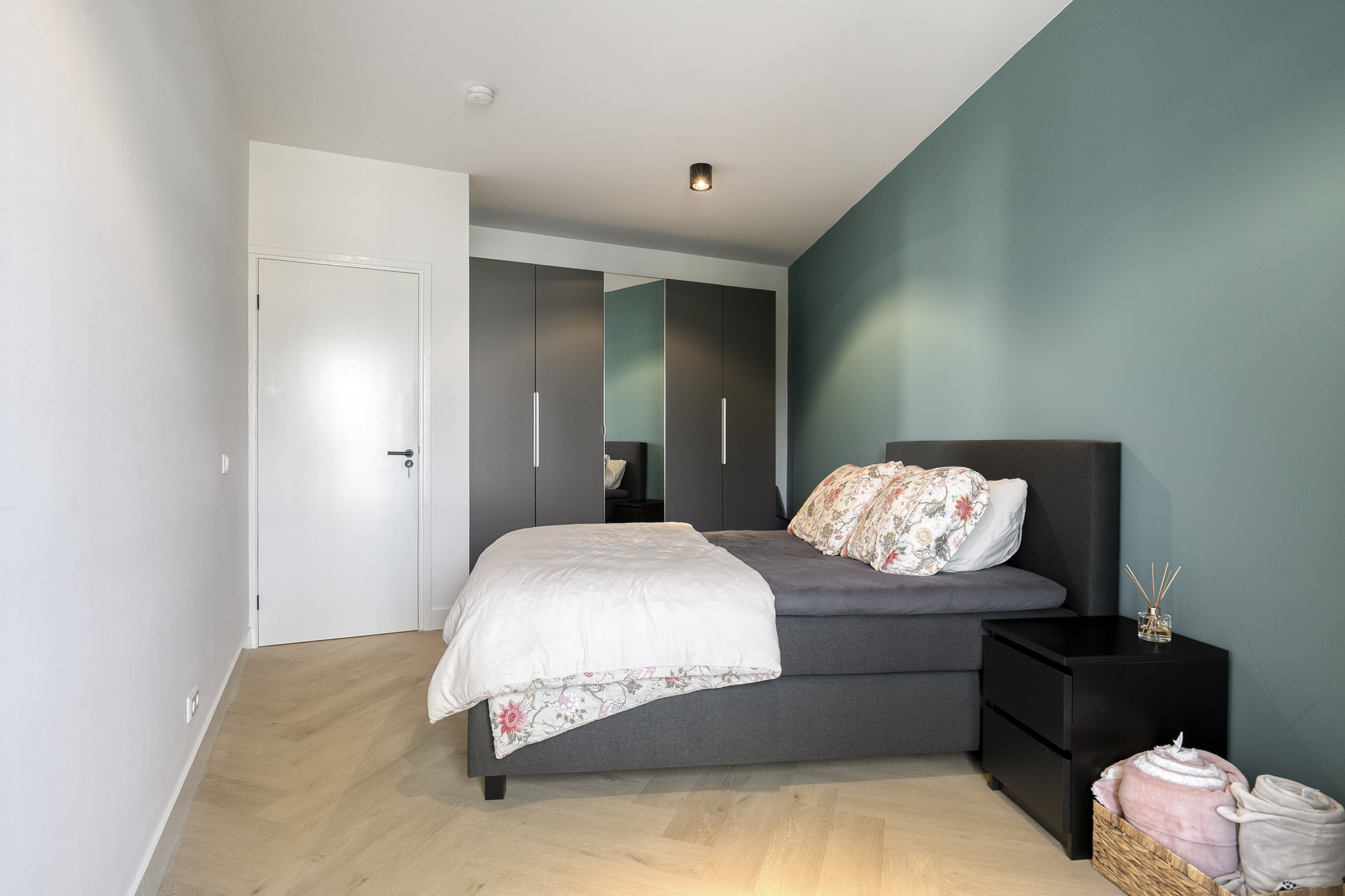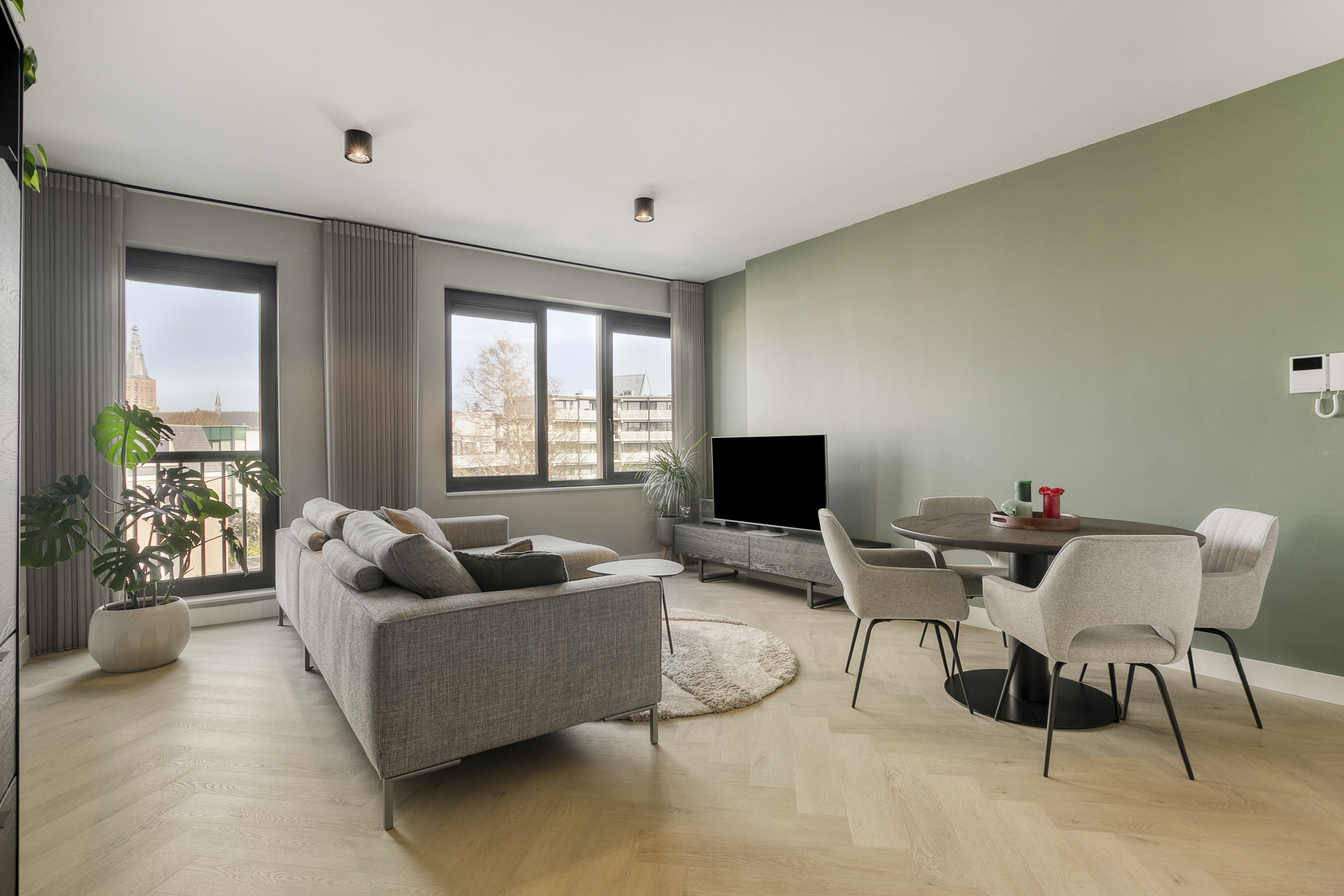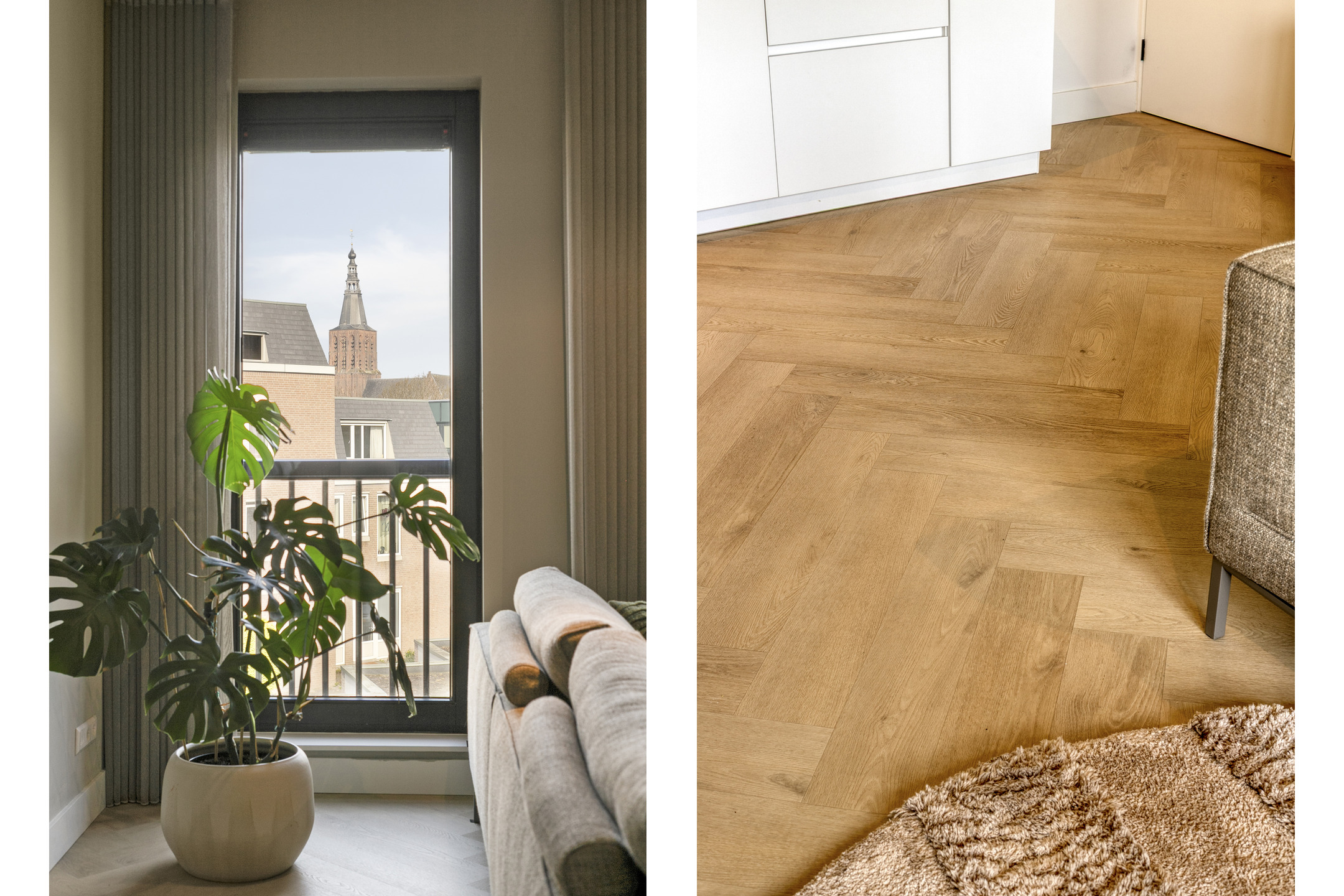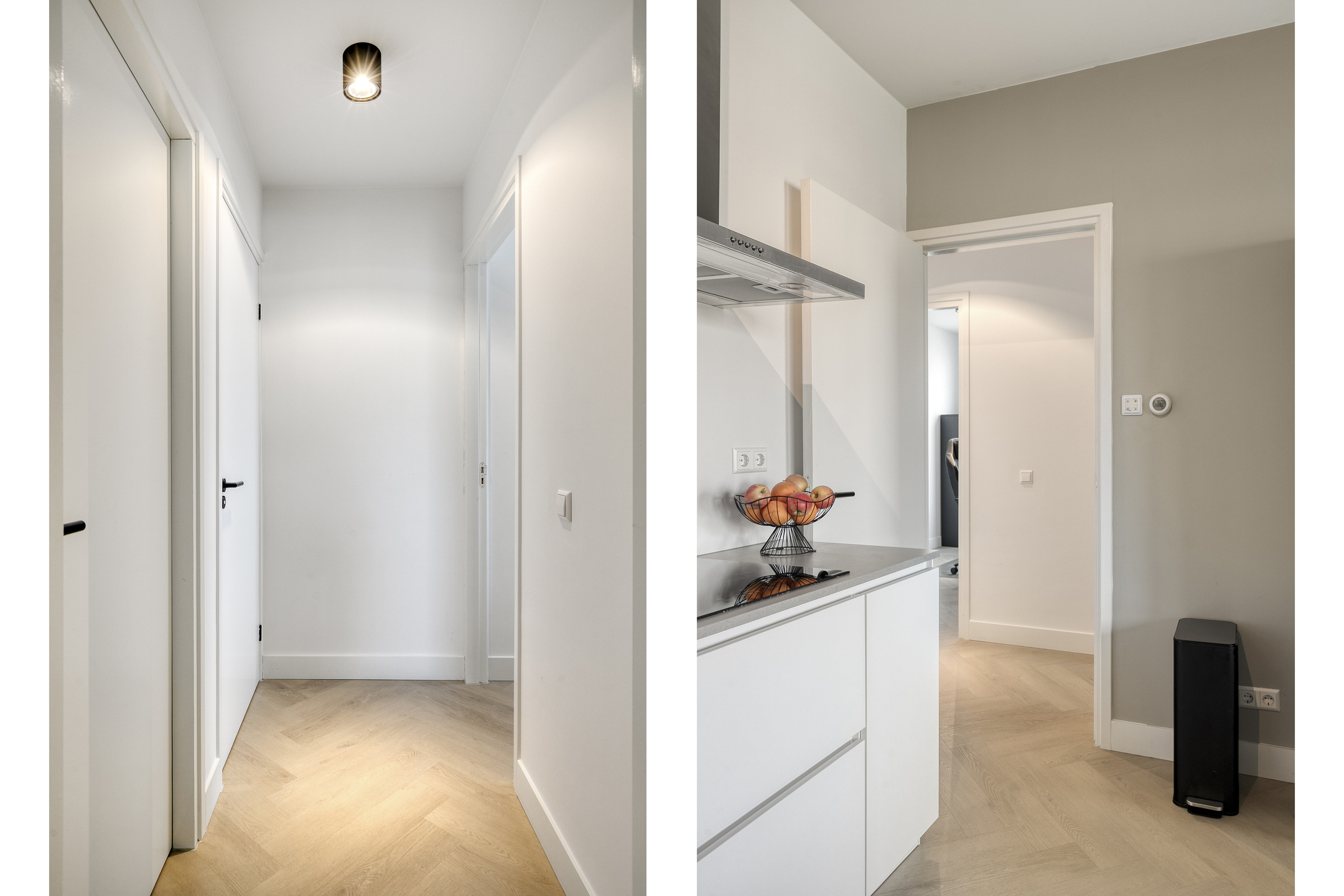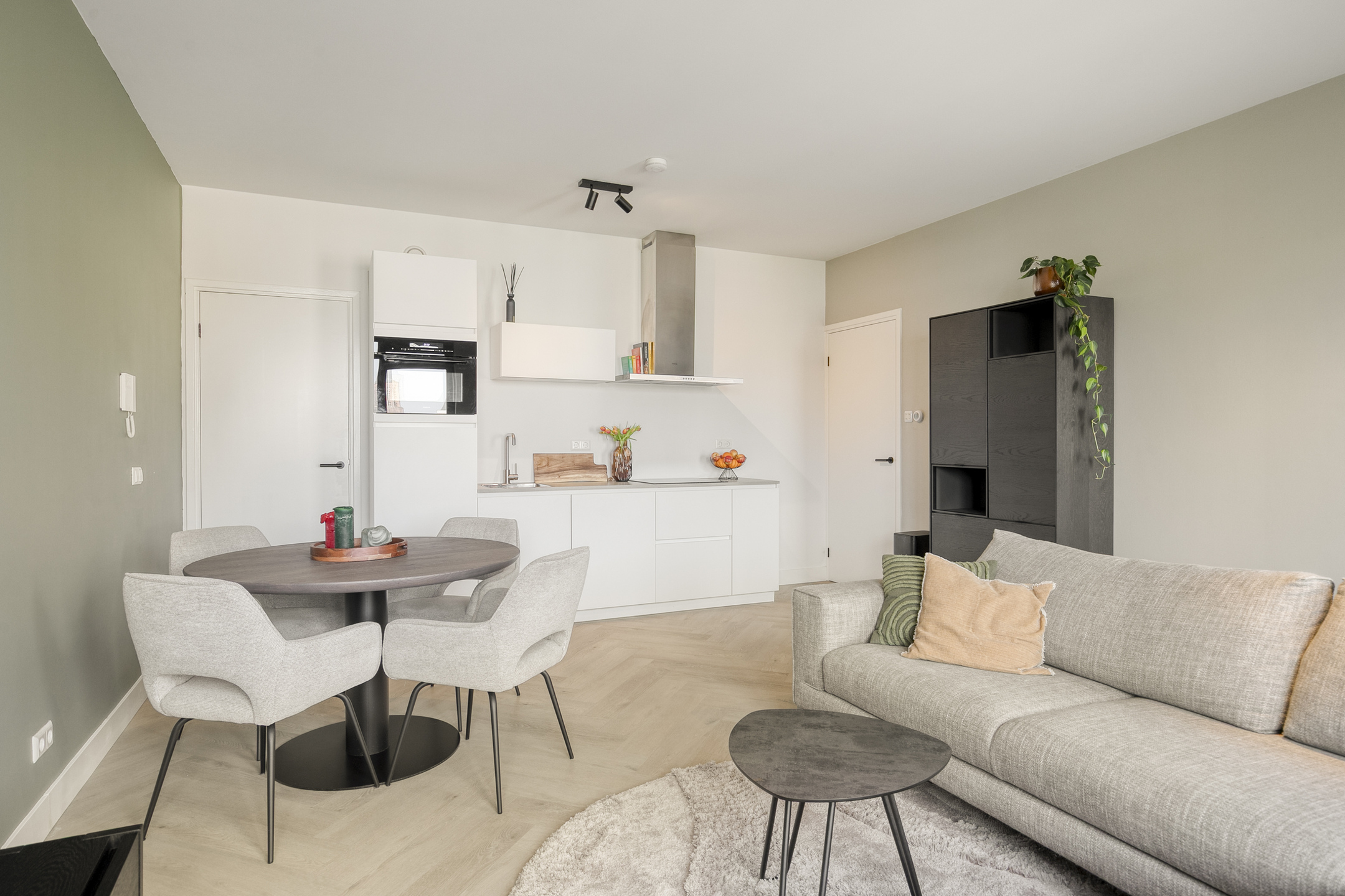 – De woonruimte is strak afgewerkt met gestucte wanden en een moderne visgraatvloer, wat zorgt voor een frisse en eigentijdse uitstraling;