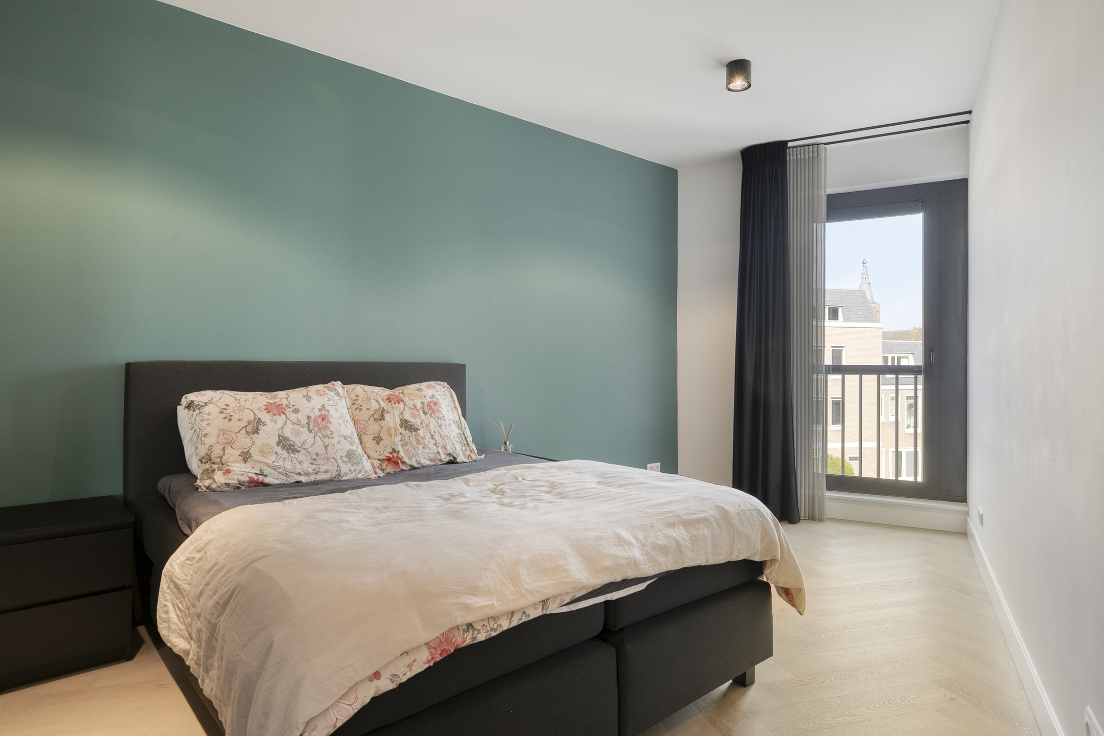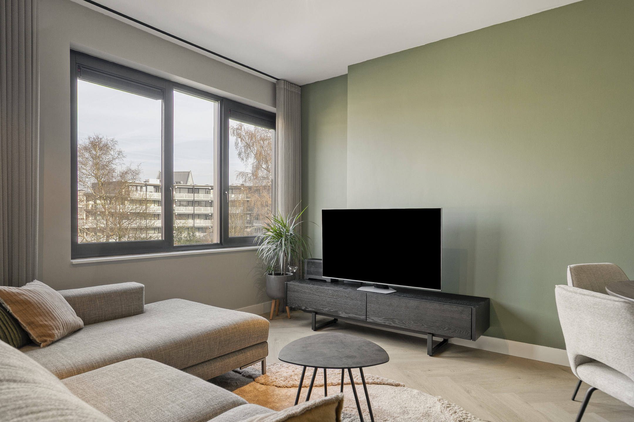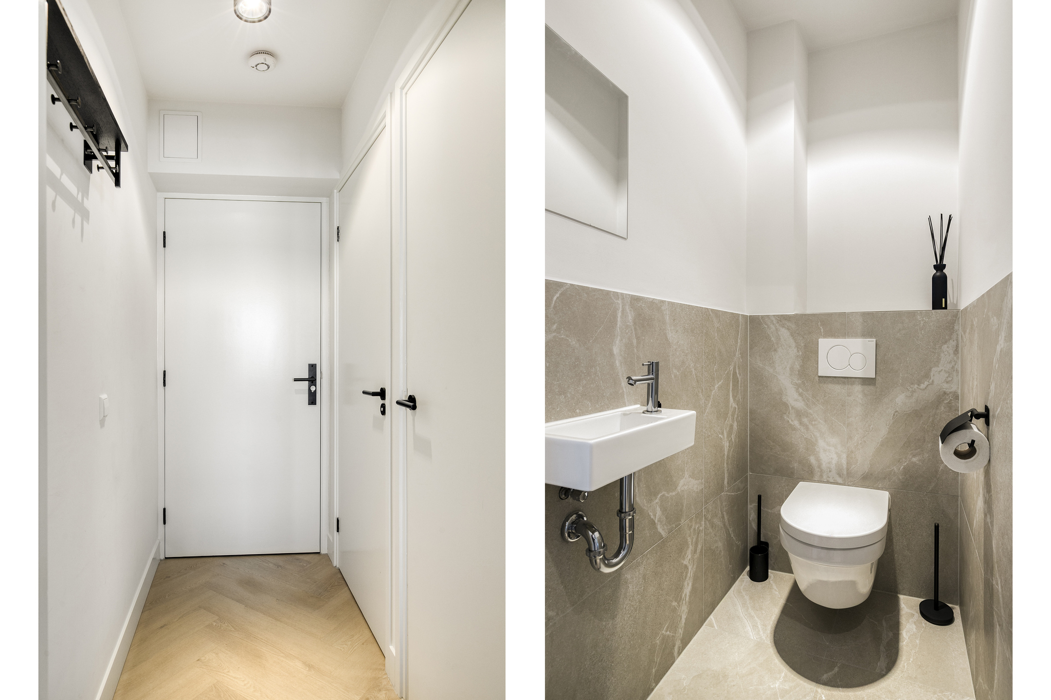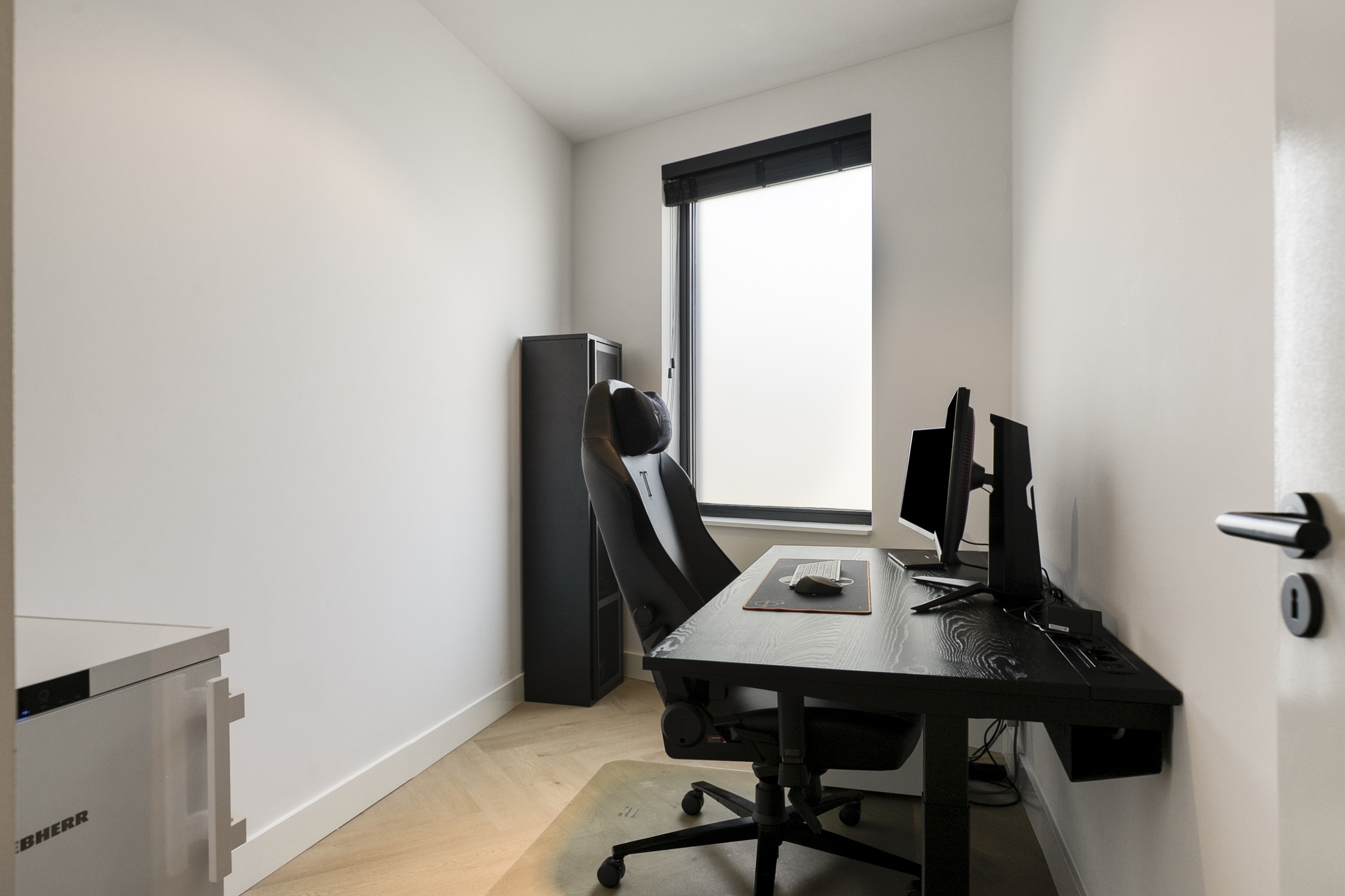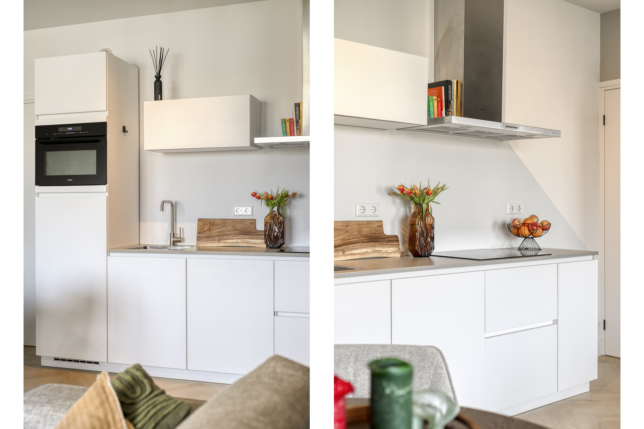 – De woonruimte is strak afgewerkt met gestucte wanden en een moderne visgraatvloer, wat zorgt voor een frisse en eigentijdse uitstraling;