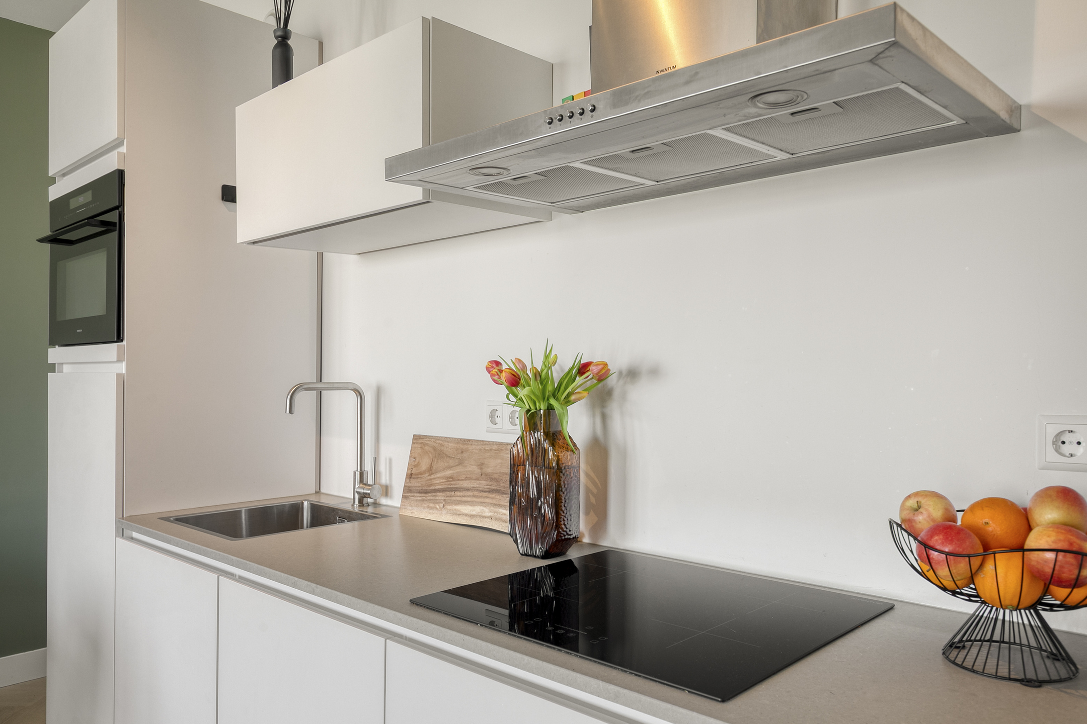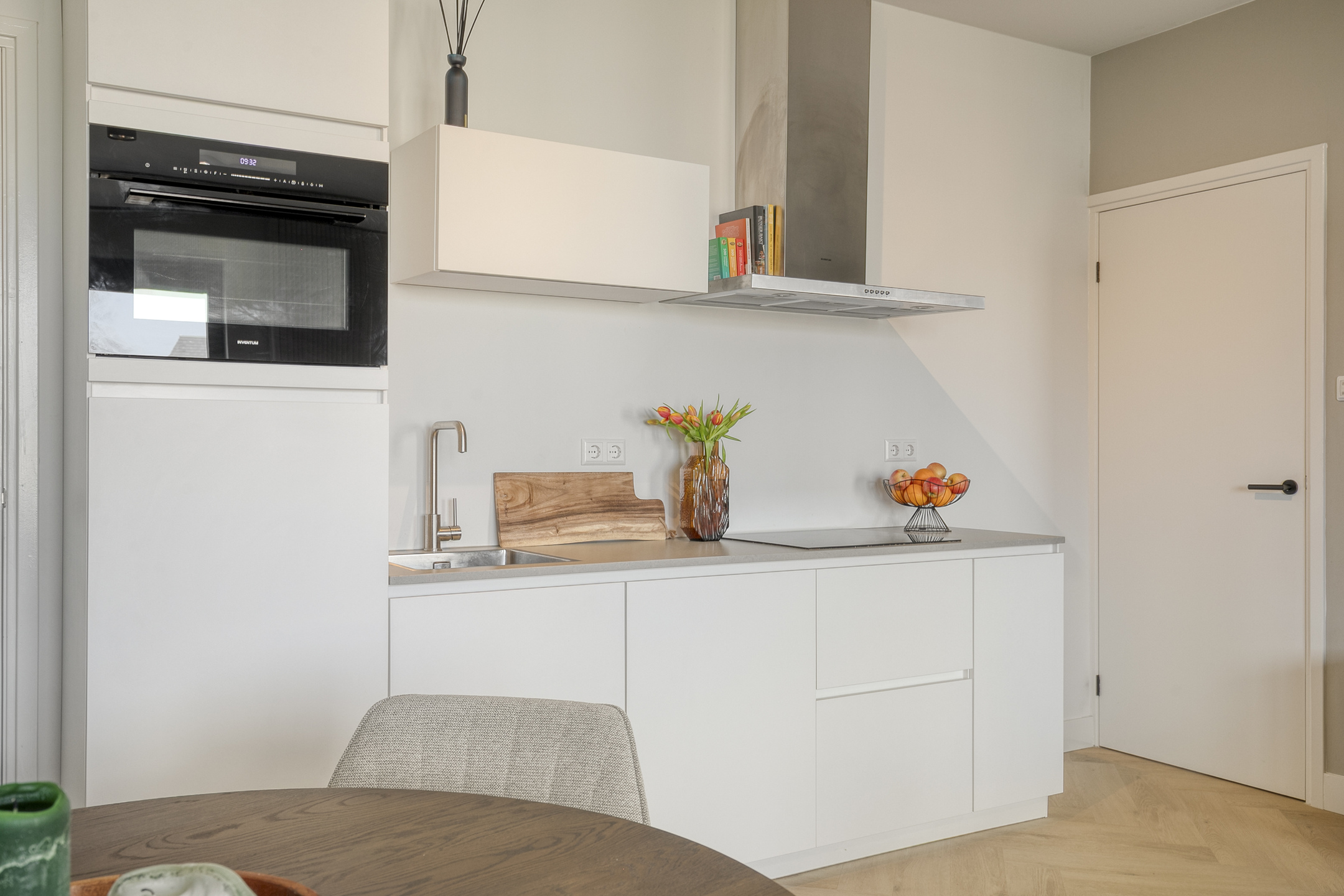 – De open keuken is in 2024 vernieuwd en uitgevoerd in een strakke opstelling met diverse inbouwapparatuur, zoals een inductiekookplaat, afzuigkap, koelkast, combi-oven en vaatwasser;