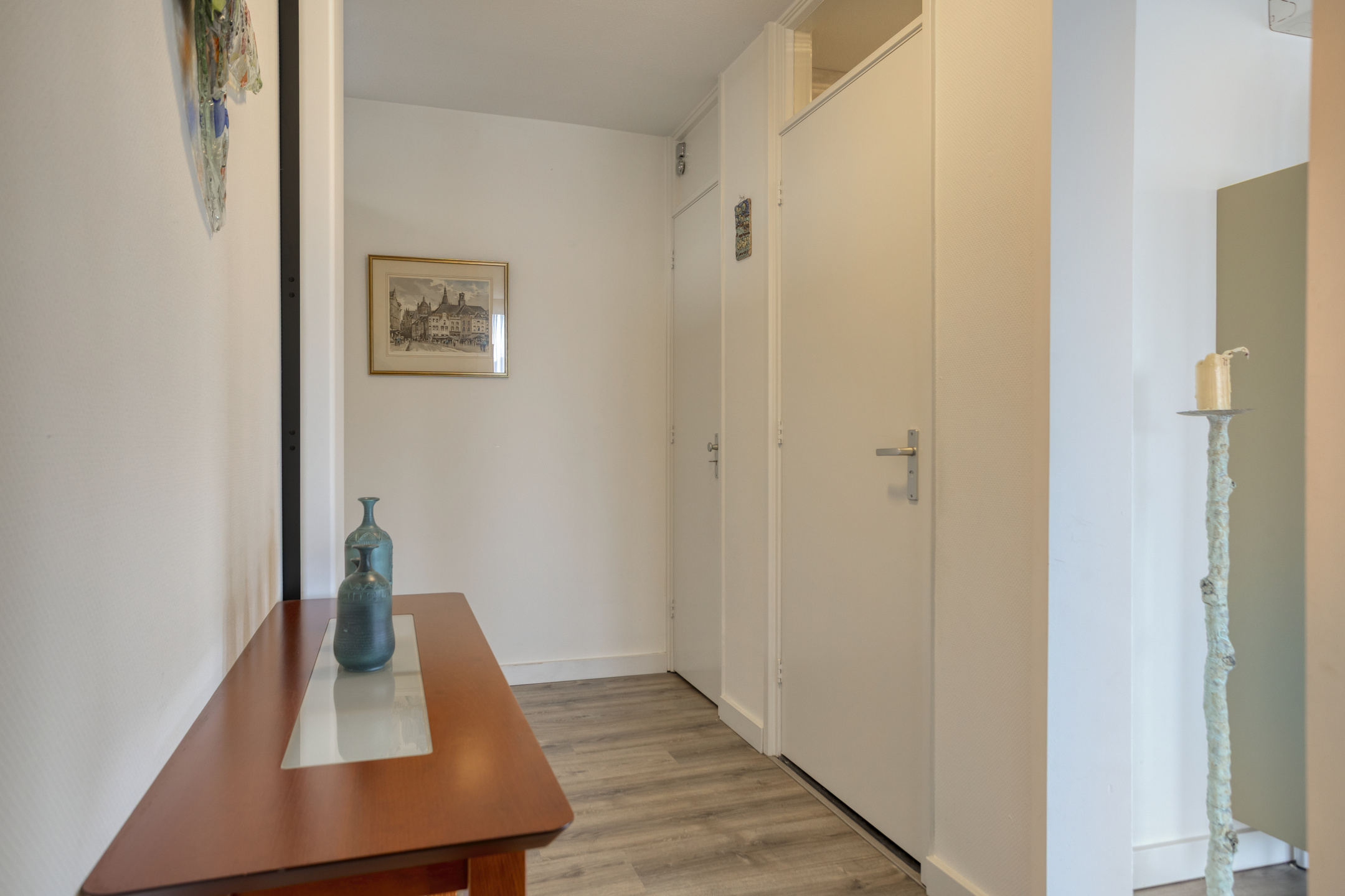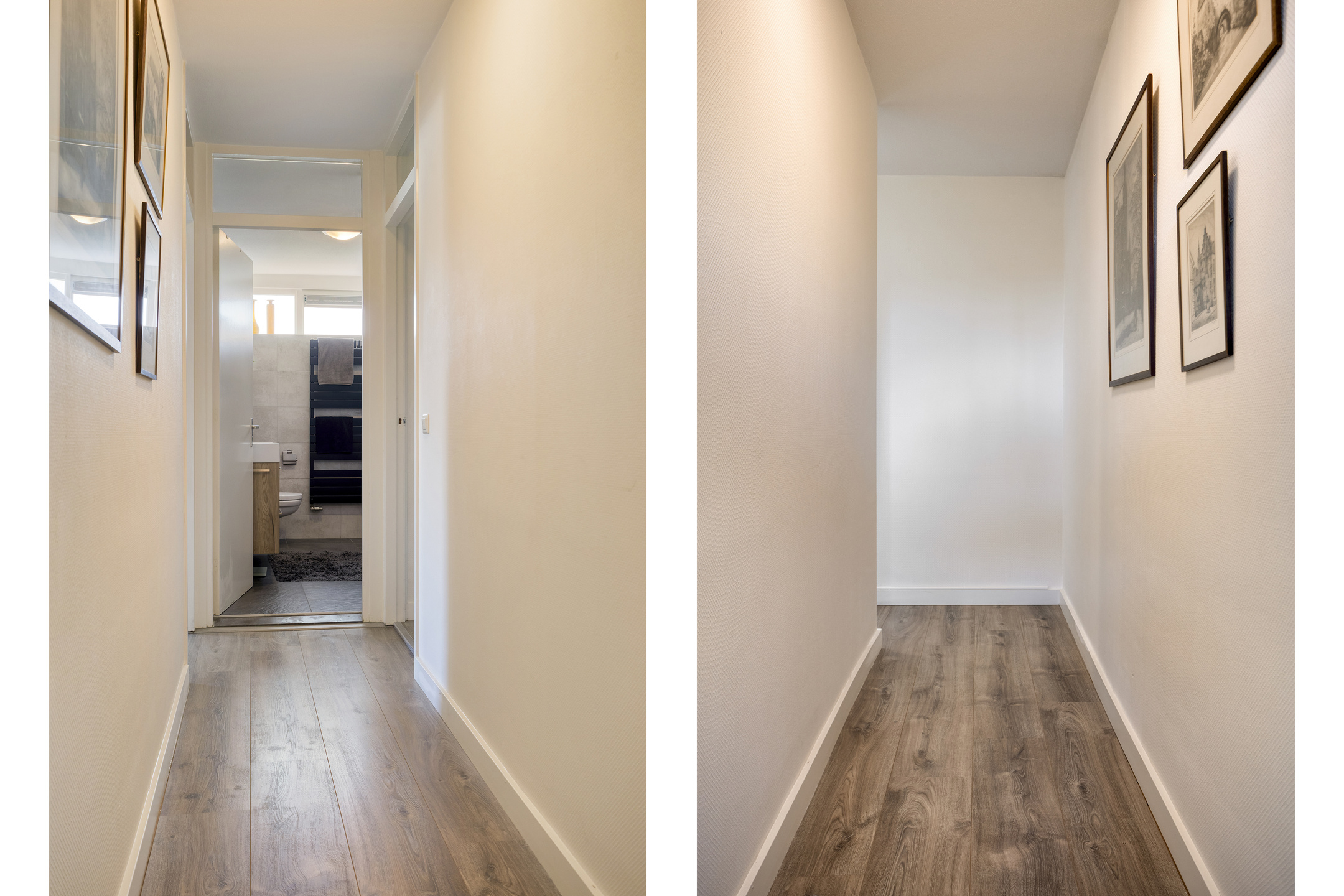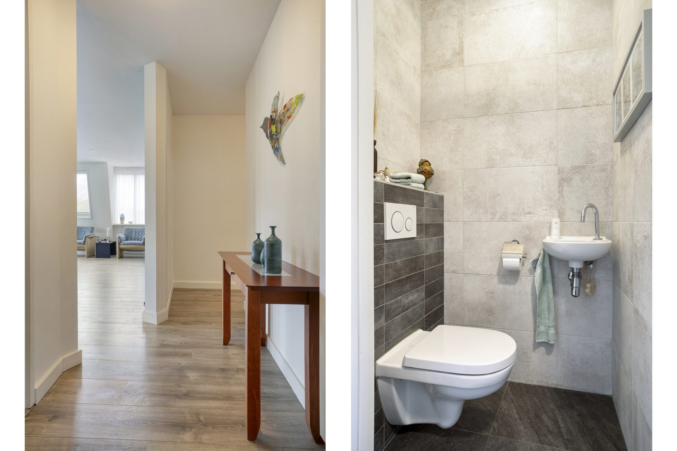 – de hal toegang biedt tot de meterkast, toiletruimte met fonteintje, de woonkamer en beide slaapkamers;