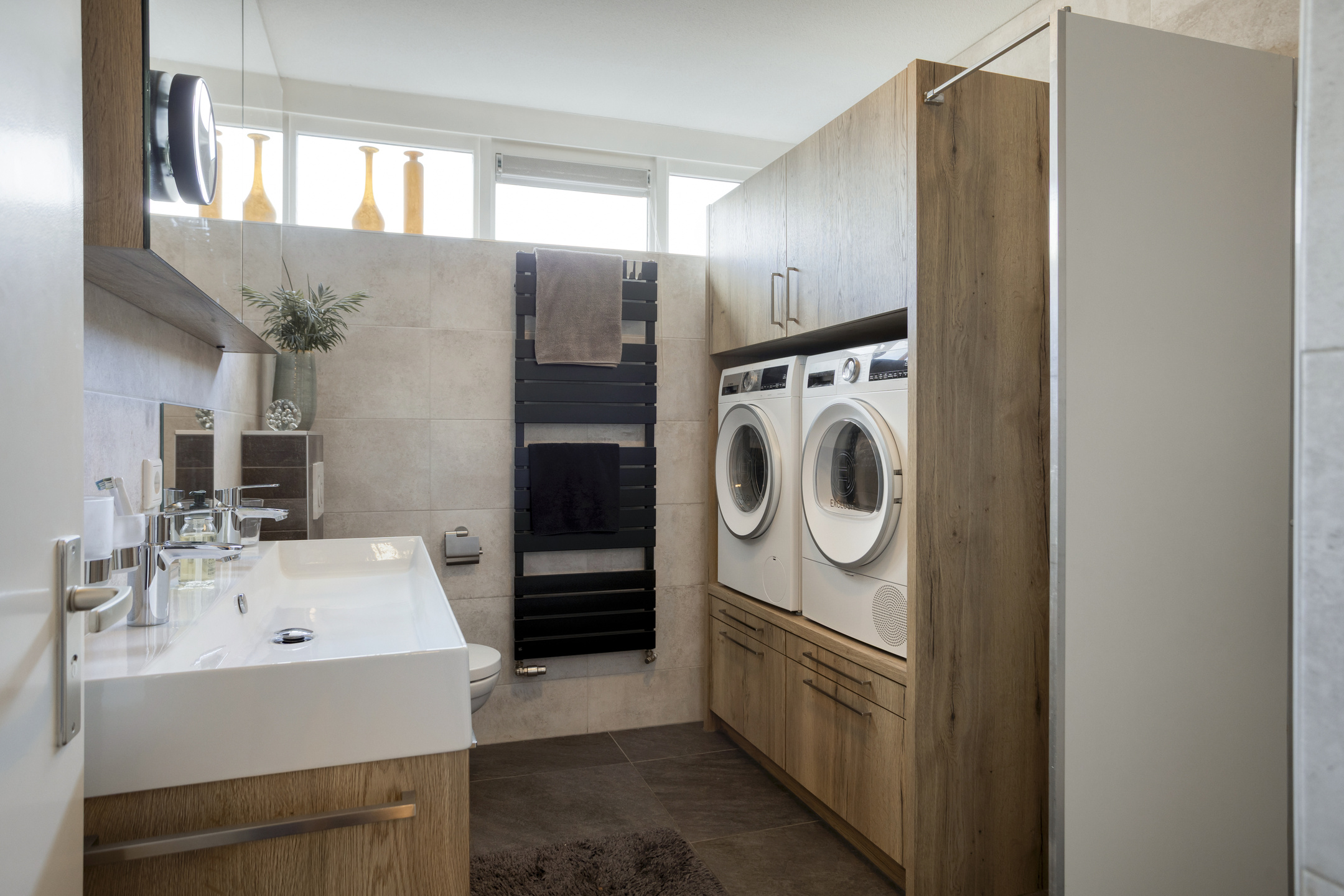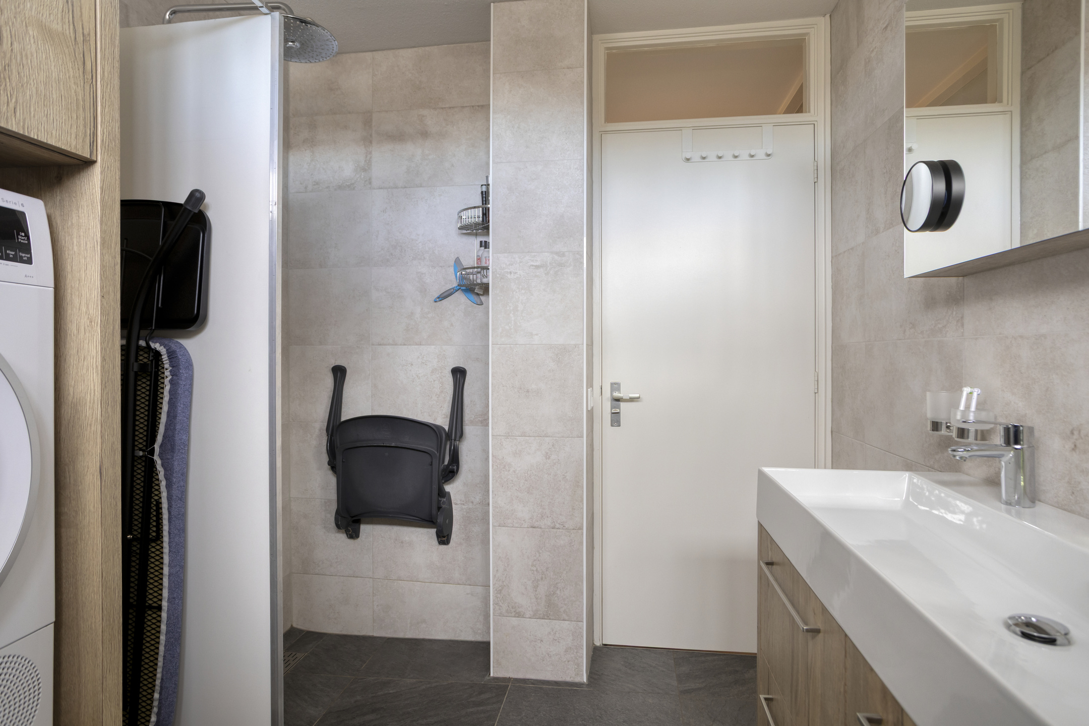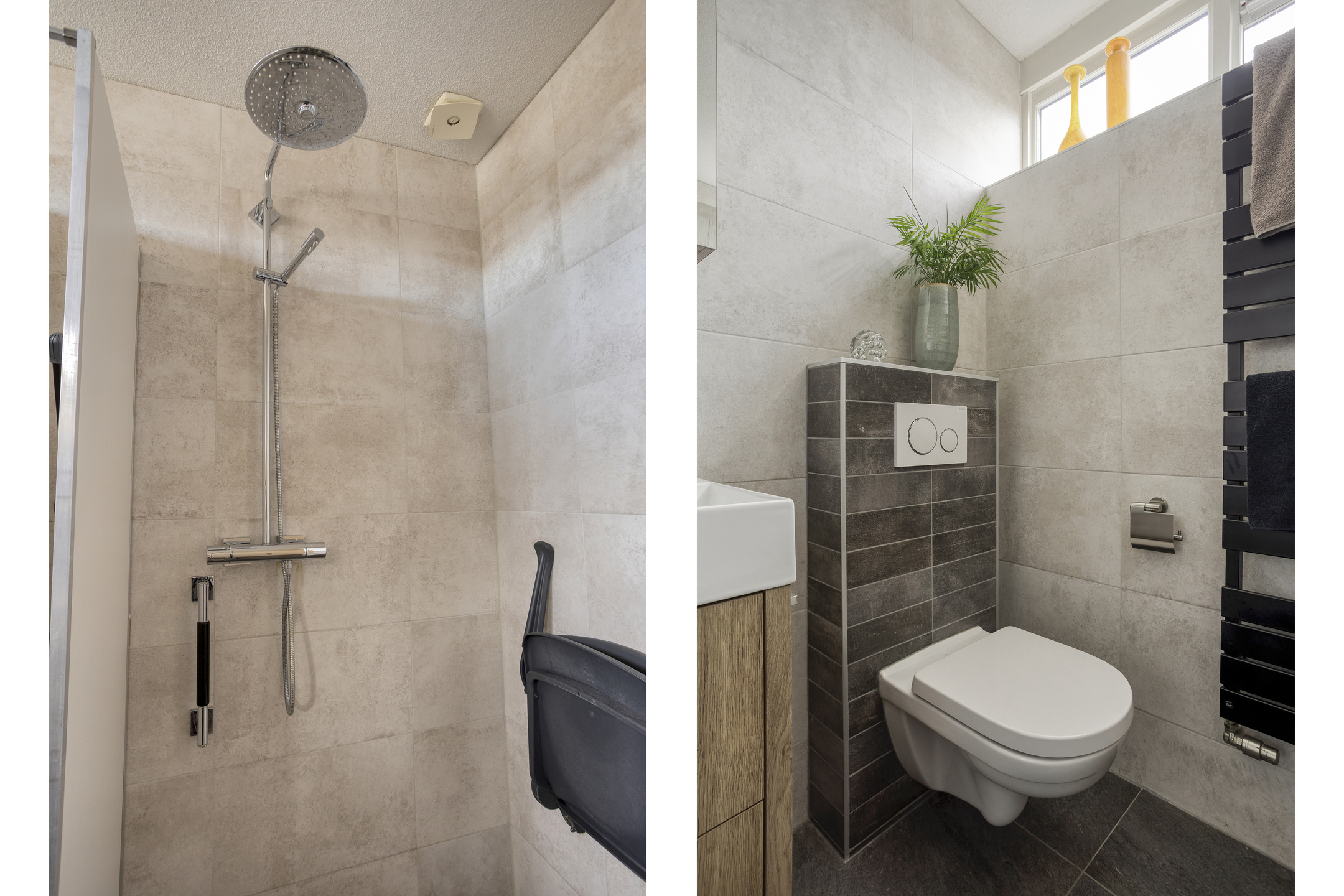 - Badkamervoorzieningen Toilet, dubbele wastafel, wastafelmeubel, inloopdouche, wasmachineaansluiting