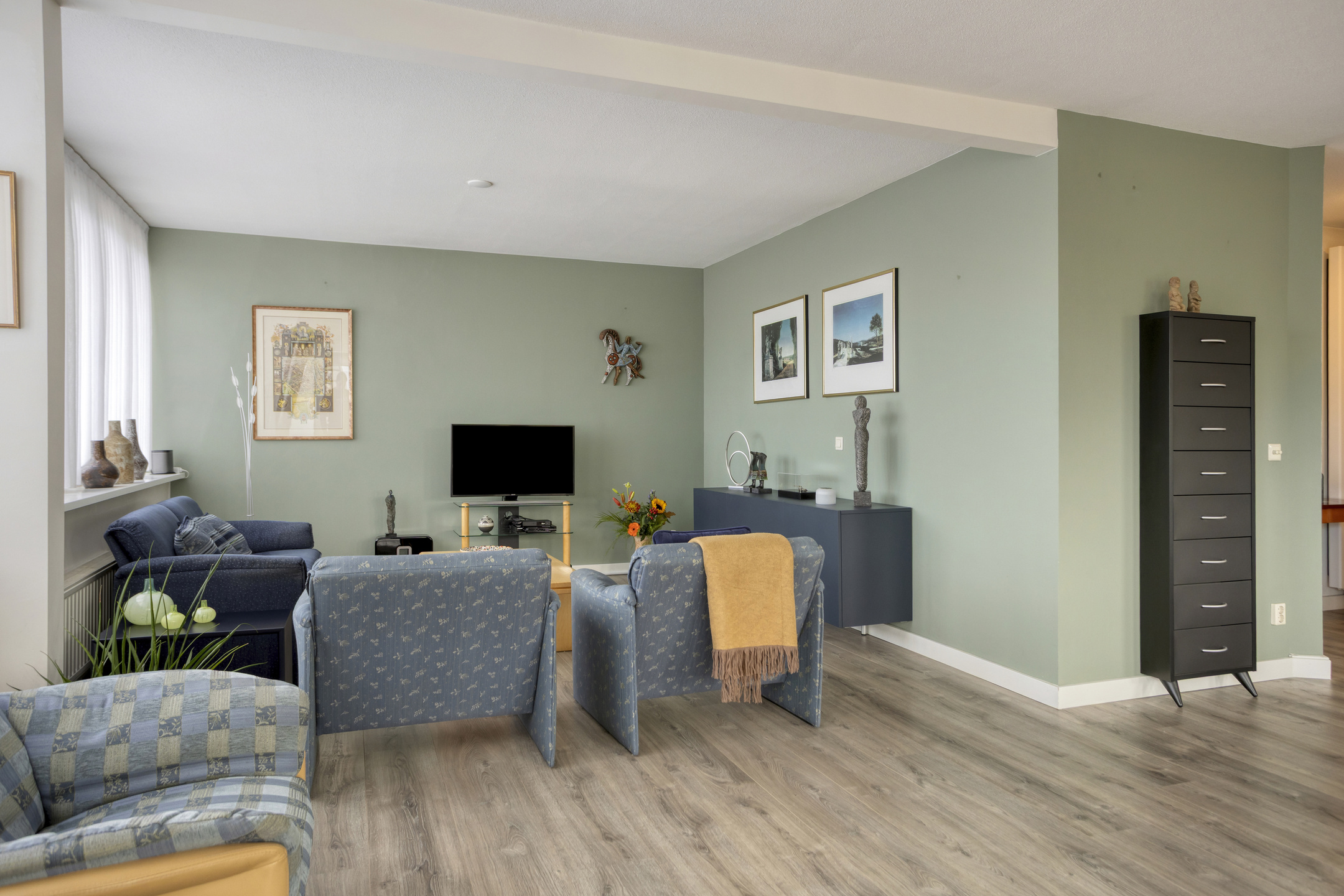 – de ruime woonkamer is keurig afgewerkt met gladde wanden en een fraaie laminaatvloer;