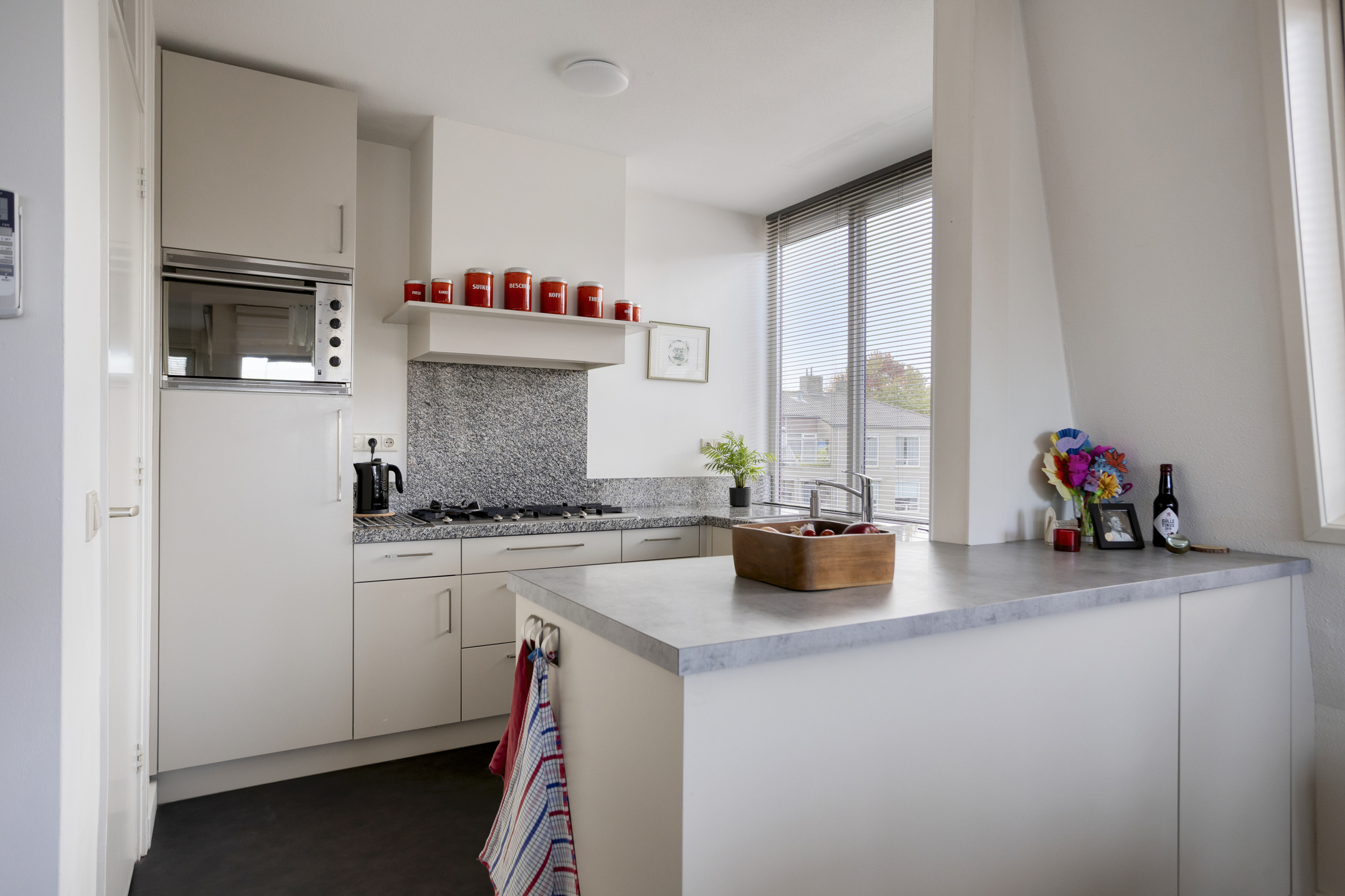 – de half-open keuken beschikt over een L-opstelling met natuurstenen werkblad, 4-pits gaskookplaat, afzuigkap, oven en koel-vriescombinatie;