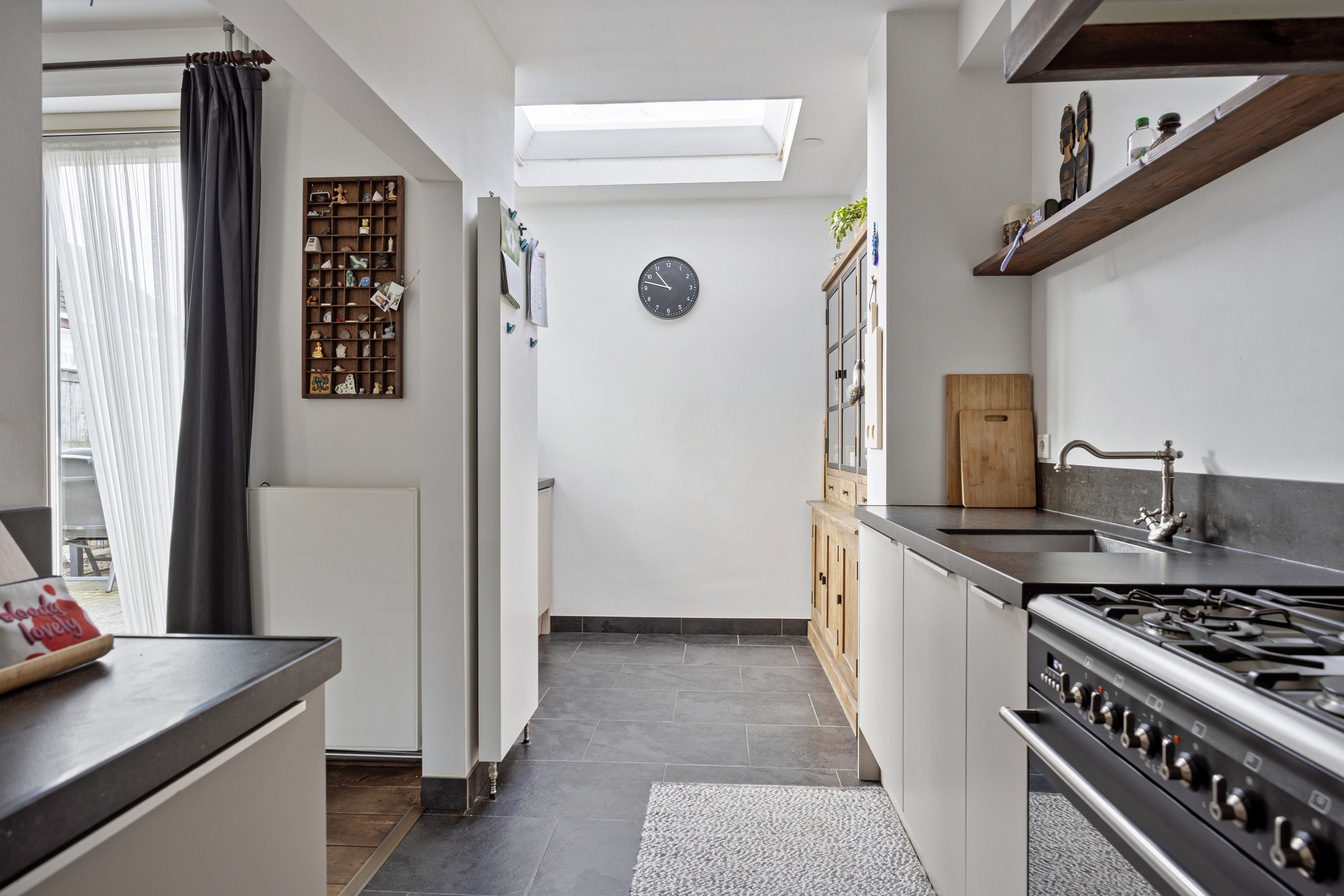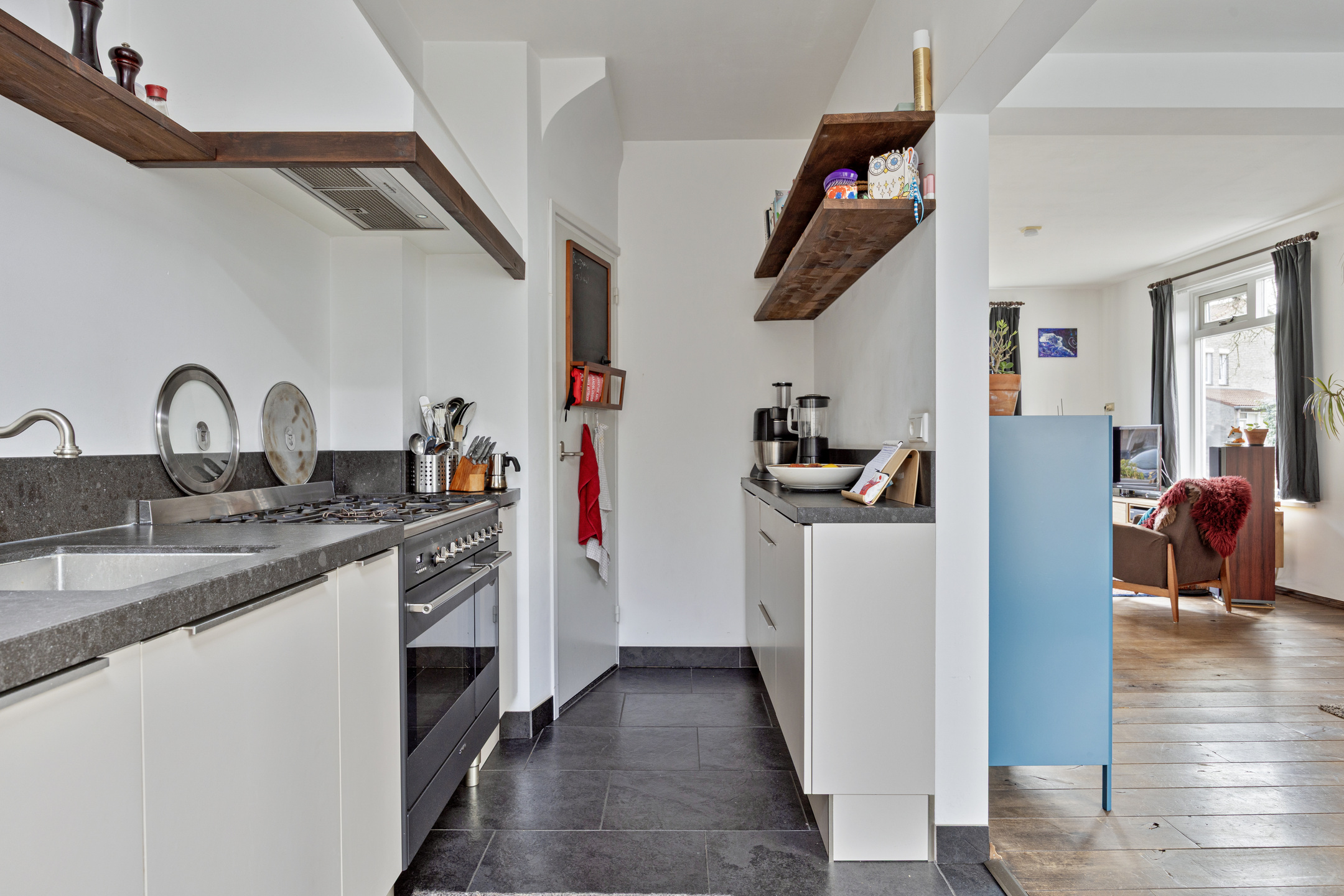 – de halfopen keuken is afgewerkt met een tegelvloer en is voorzien van een moderne keukeninrichting (2015) in dubbele wandopstelling met composiet werkbladen en diverse keukenapparatuur, te weten: een 6-pits gasfornuis met dubbele oven (Smeg), afzuigkap, koelkast, vriezer en een vaatwasser;