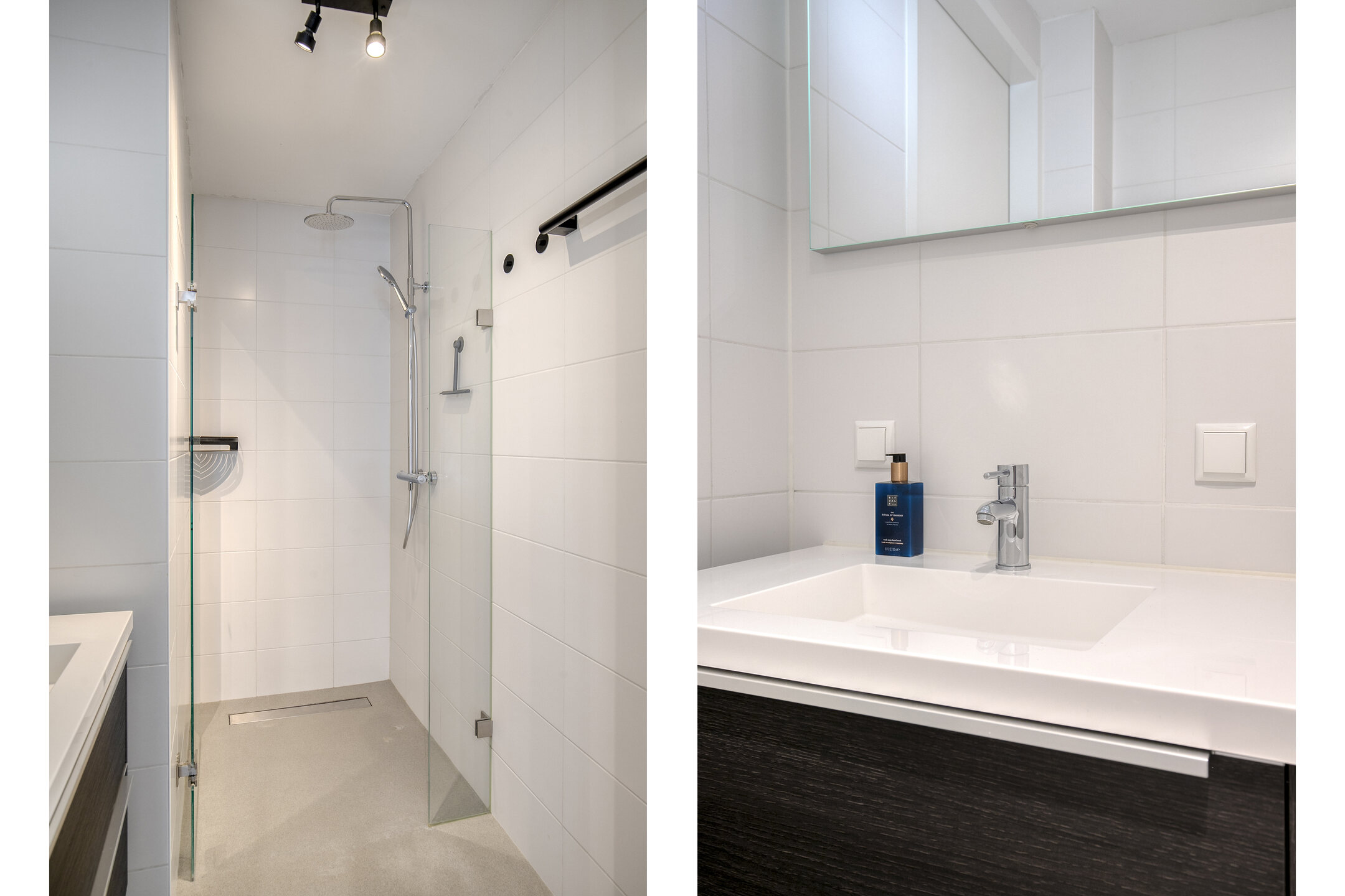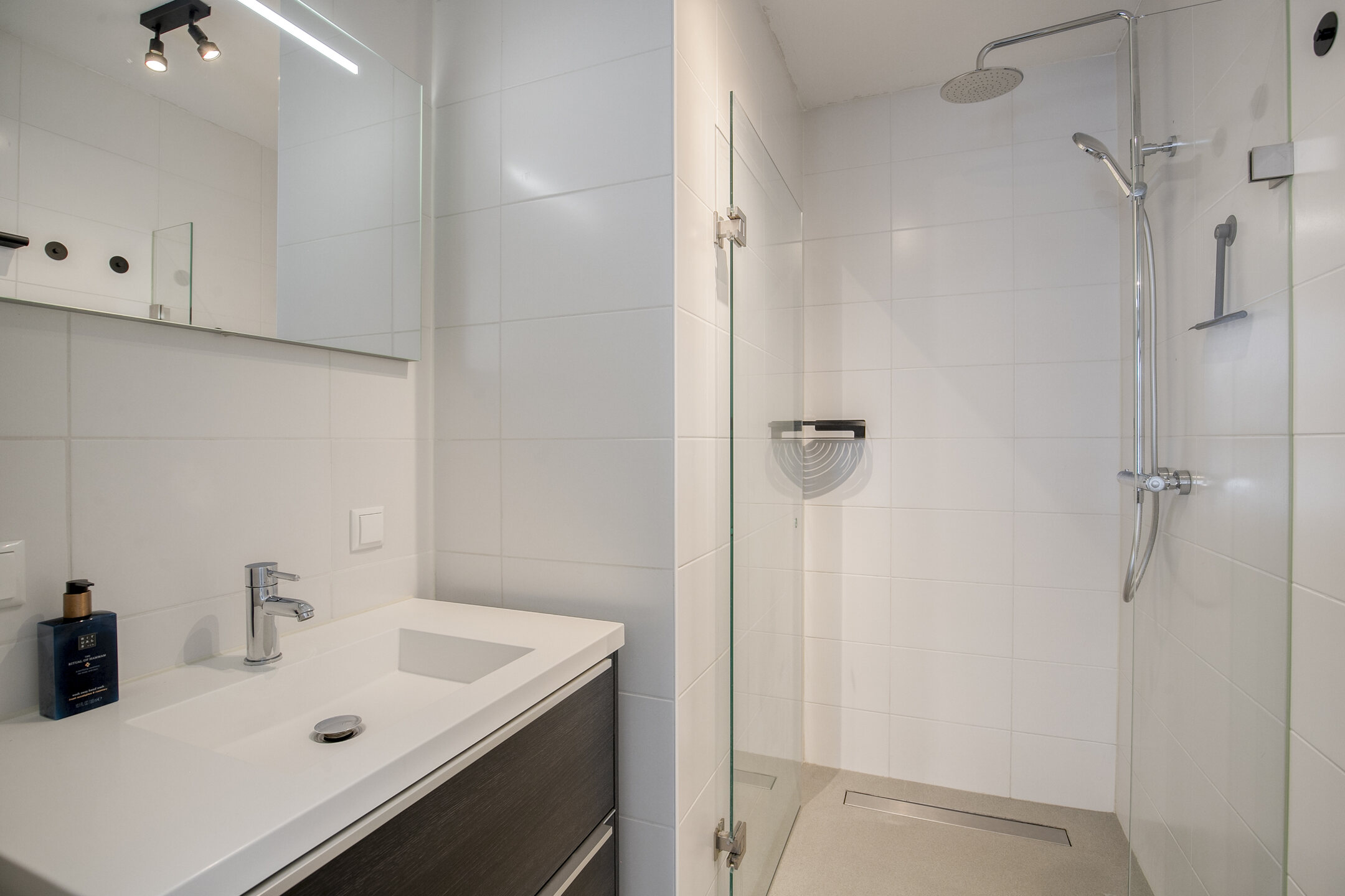 – de luxe badkamer is volledig betegeld en modern ingericht met een inloopdouche en een stijlvol wastafelmeubel;