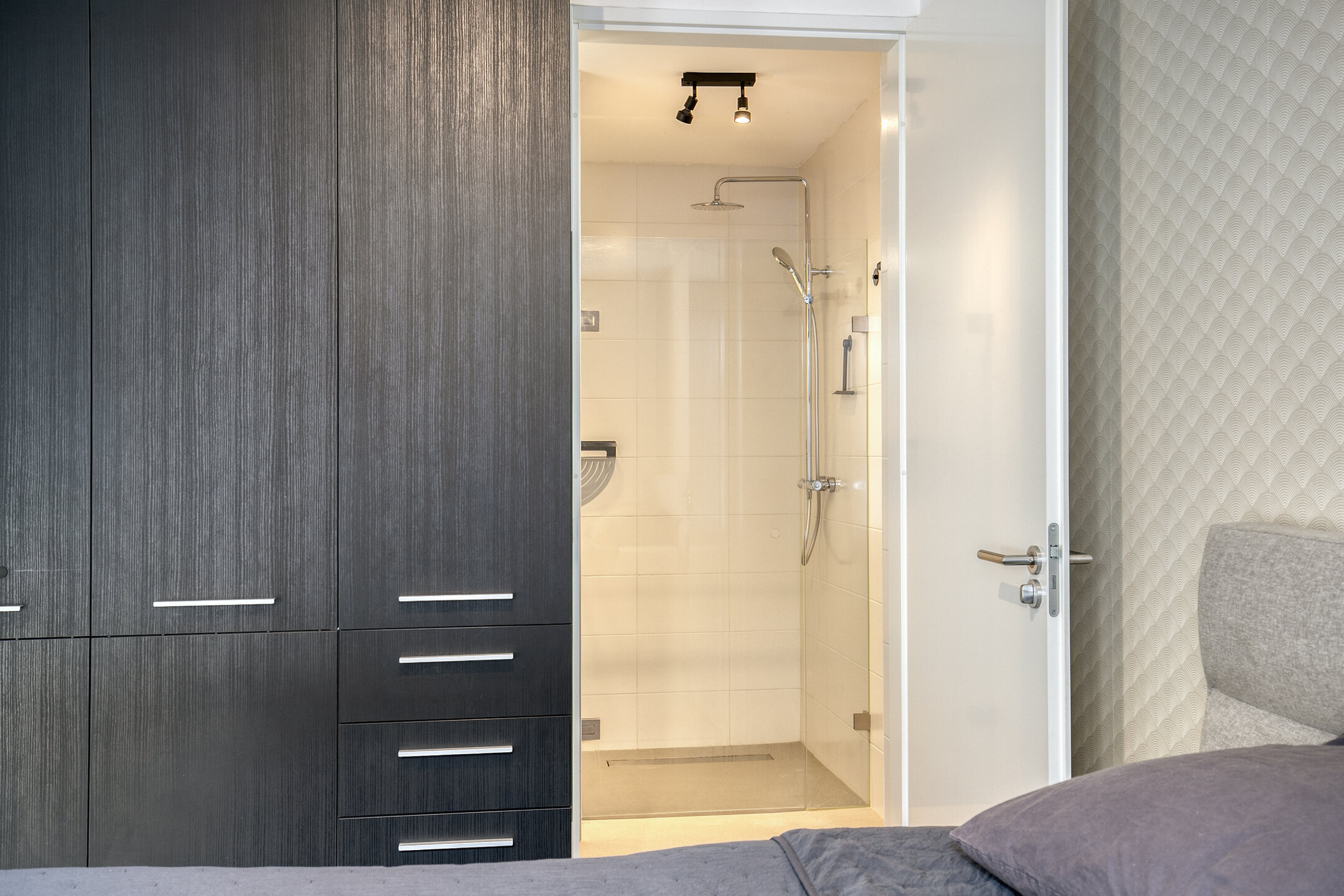 – de slaapkamer is ruim en praktisch ingedeeld en staat in directe verbinding met de badkamer, wat zorgt voor een fijne en logische indeling;