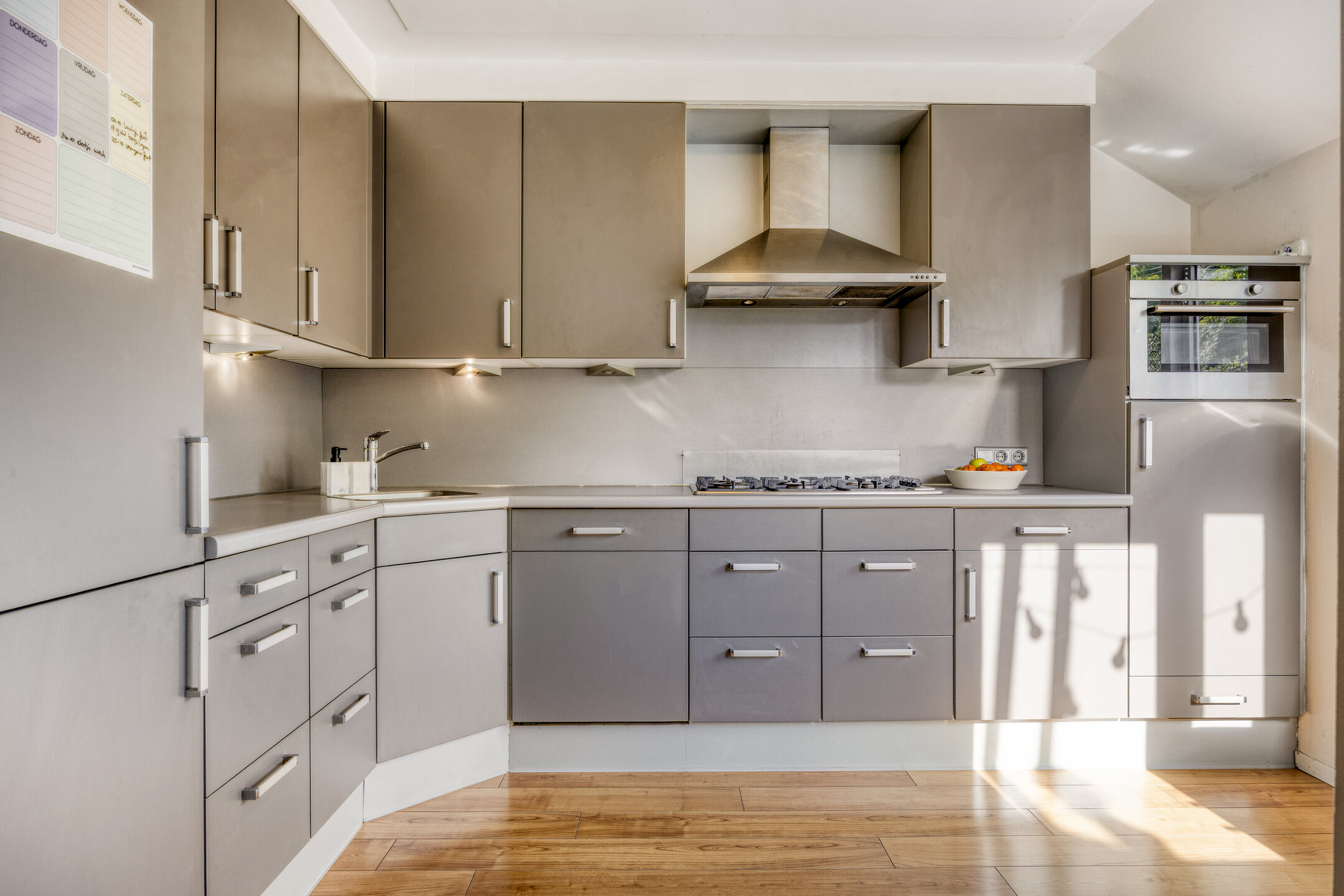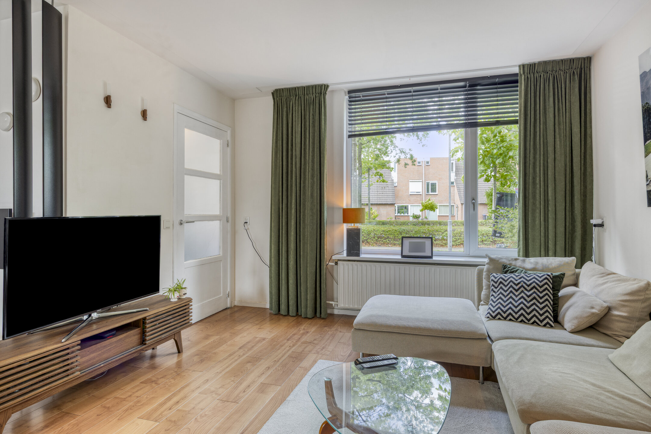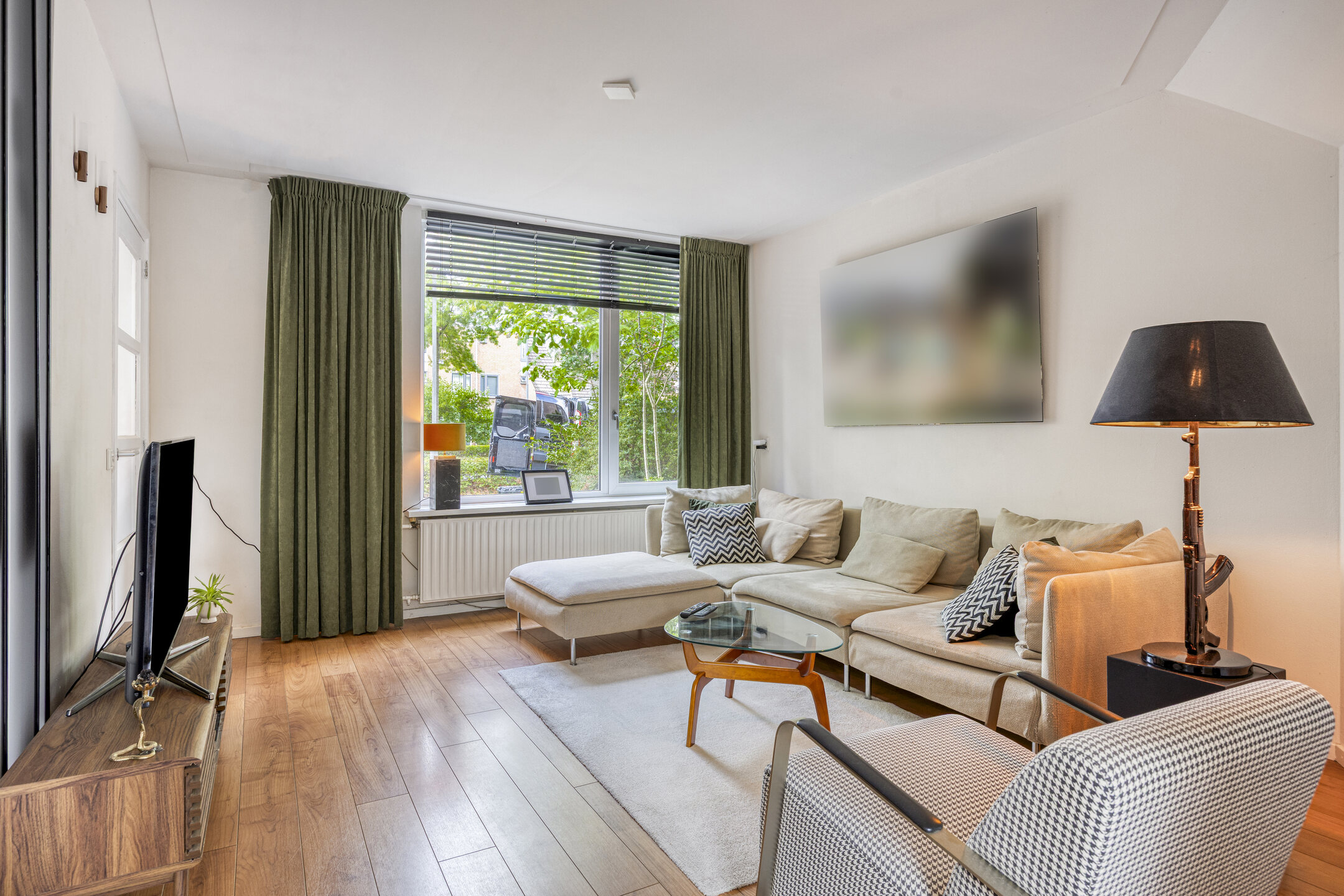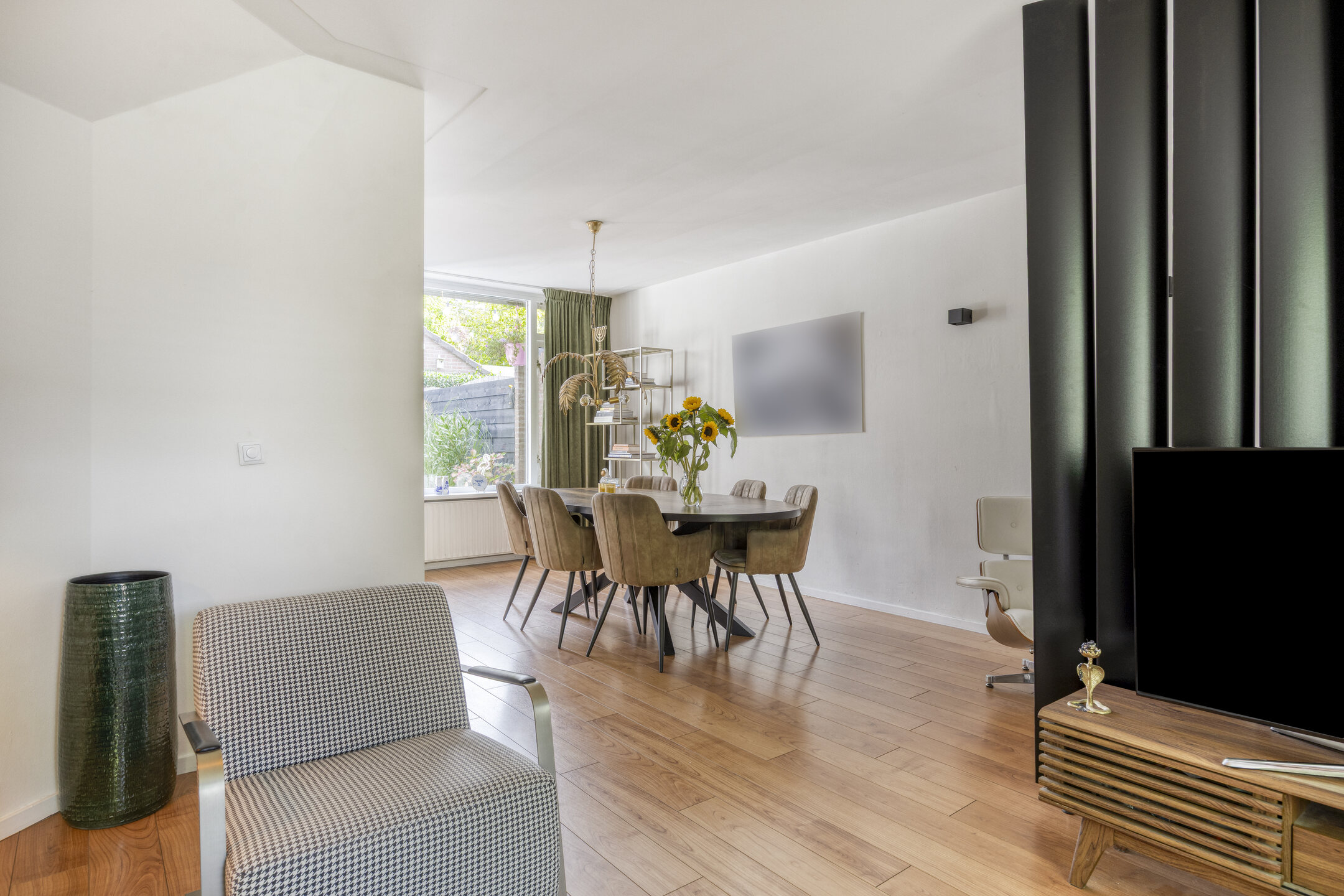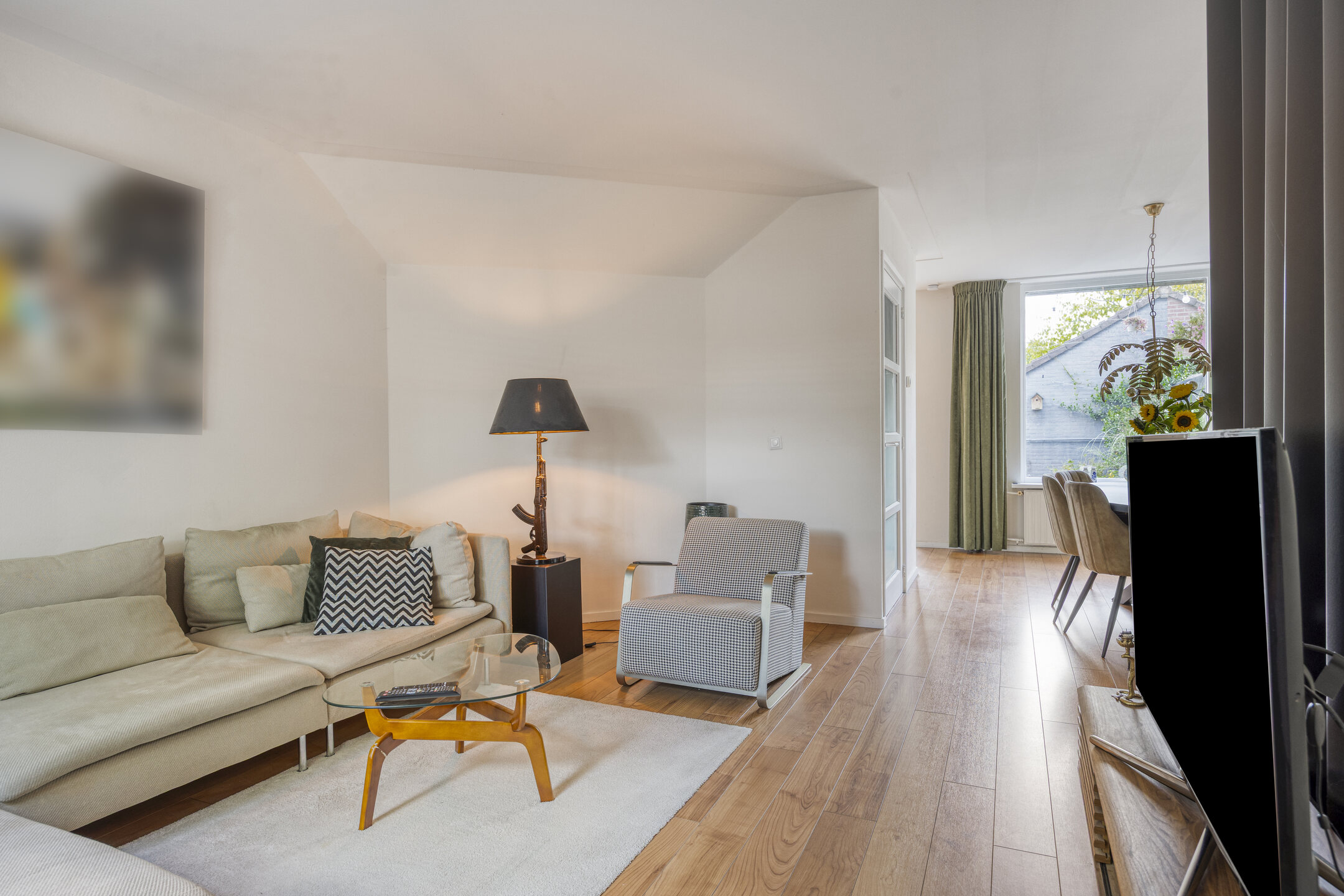 – de lichte Z-vormige woonkamer is voorzien van een moderne laminaatvloer, een strakke stucwerk wand- en plafondafwerking en veel daglicht dankzij de grote raampartijen aan voor- en achterzijde;
