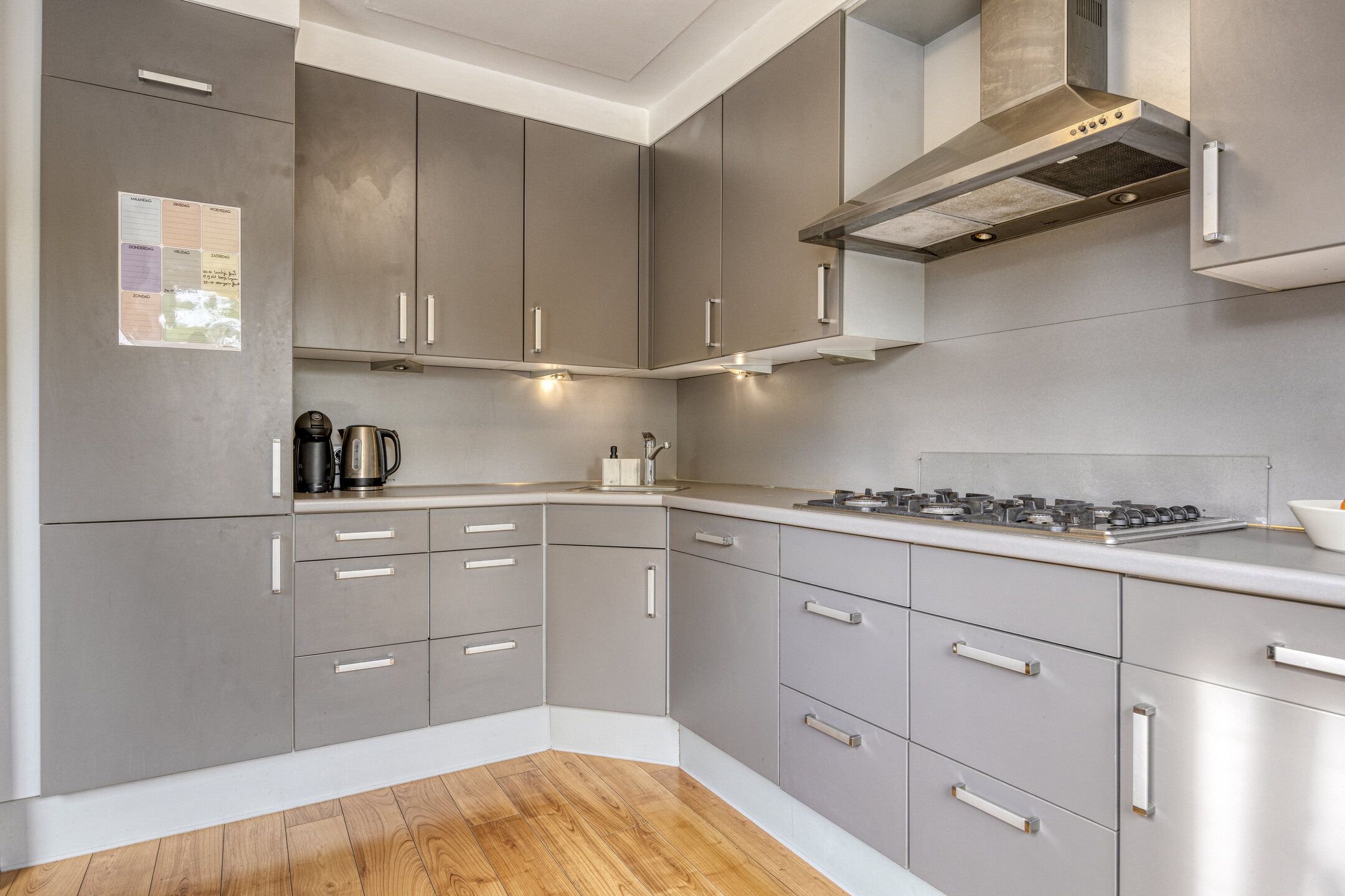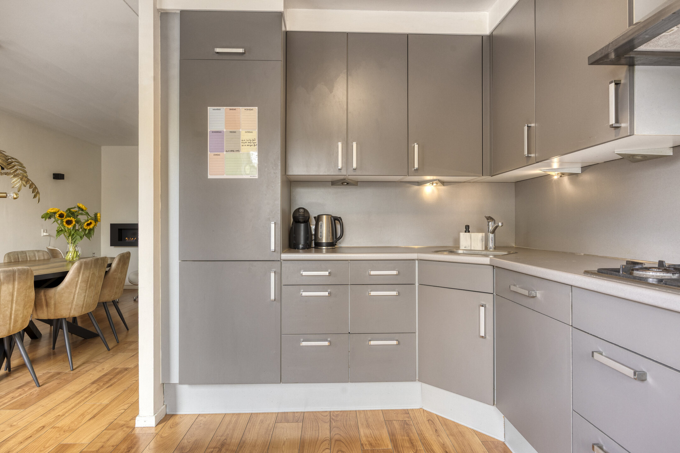 – de open keuken is voorzien van een hoekopgestelde keukeninrichting met veel kastruimte en inbouwapparatuur, waaronder een 6-pits gaskookplaat, afzuigkap, oven, vaatwasser, koelkast en vriezer;