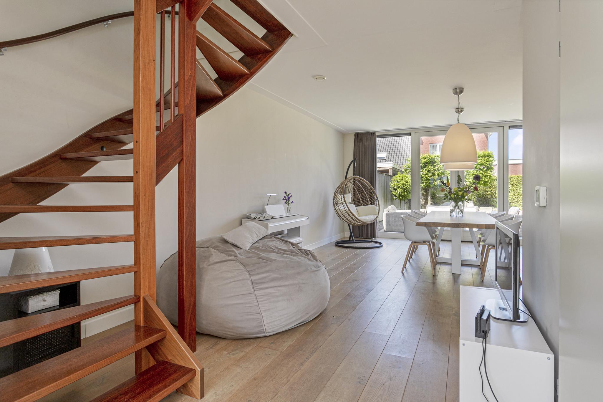 – de woonkamer voorzien is van een fraaie eikenhouten vloer met comfortabele vloerverwarming, hoge plinten en een strakke wand- en plafondafwerking met een sierlijst;