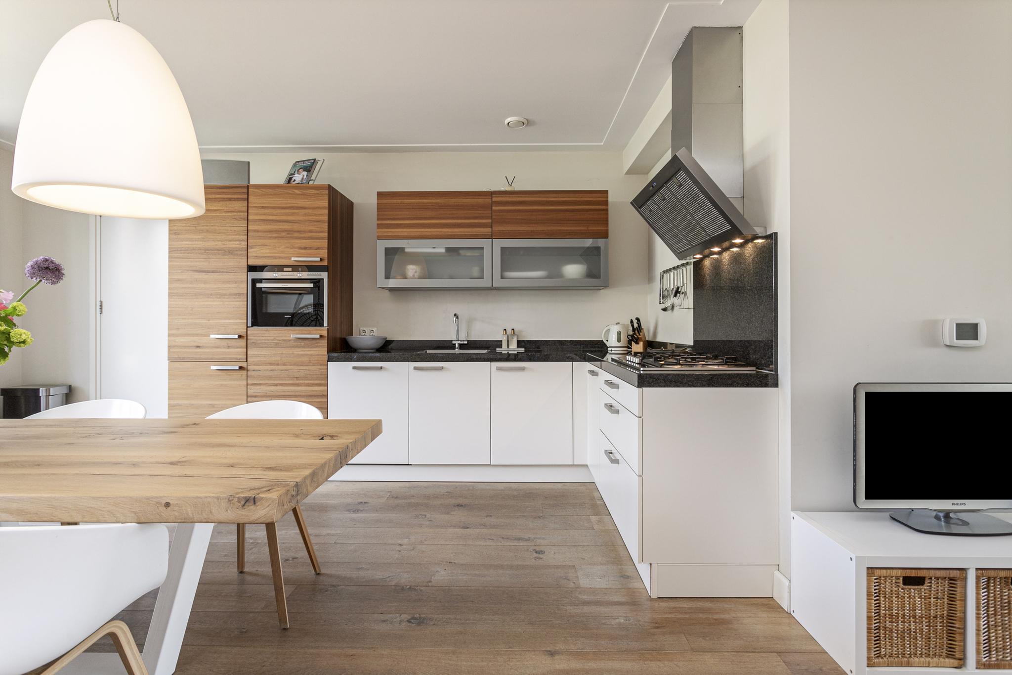 – de keuken over een moderne hoekopgestelde keukeninrichting beschikt met een praktisch wandmeubel in dezelfde stijl en inbouwappartuur, te weten: een 5-pits gasfornuis, afzuigkap, koel-/vriescombinatie, combi-oven en een vaatwasser;