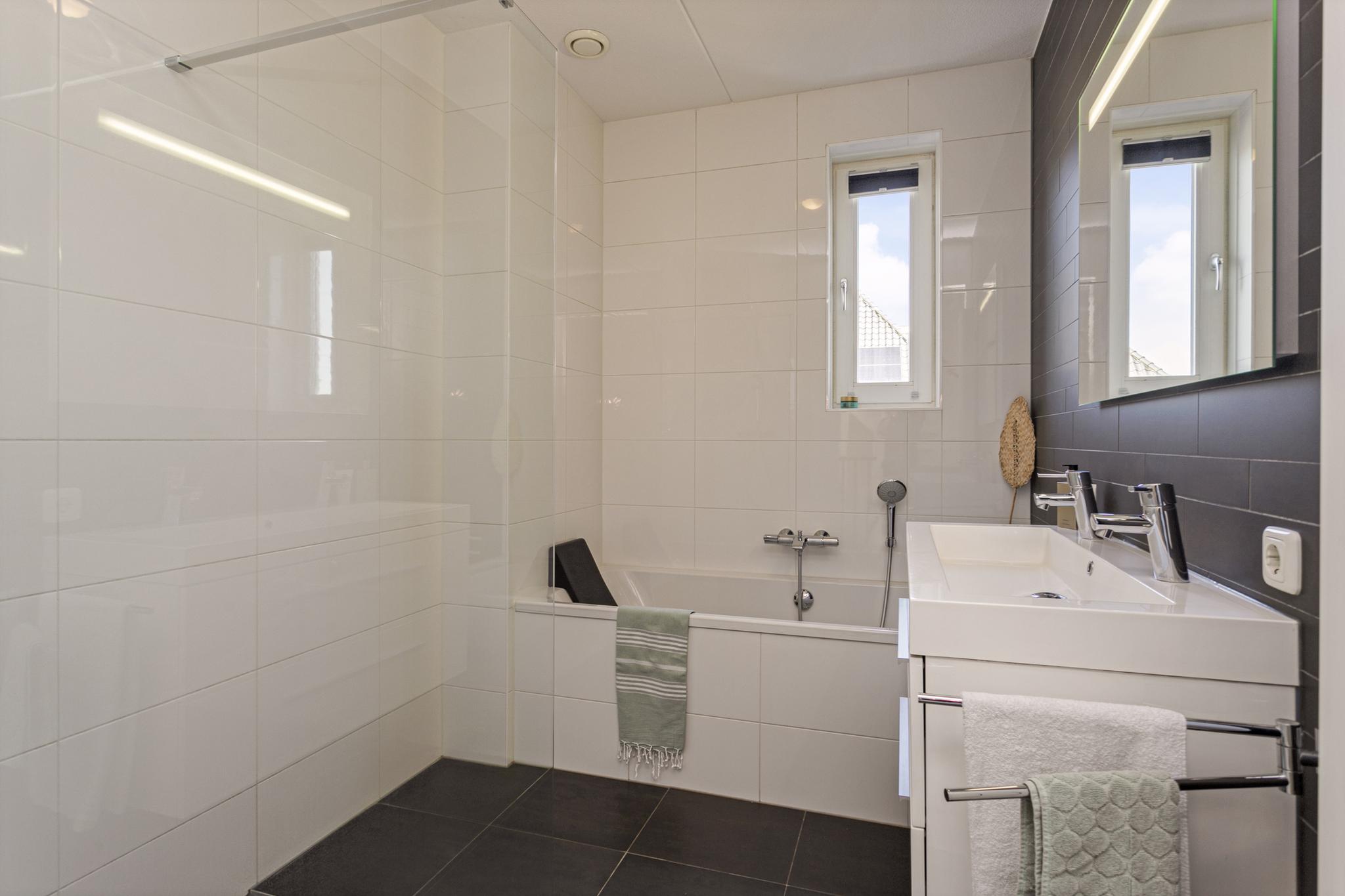 – de moderne badkamer voorzien is van een ligbad, inloopdouche, dubbele wastafel en een raam;