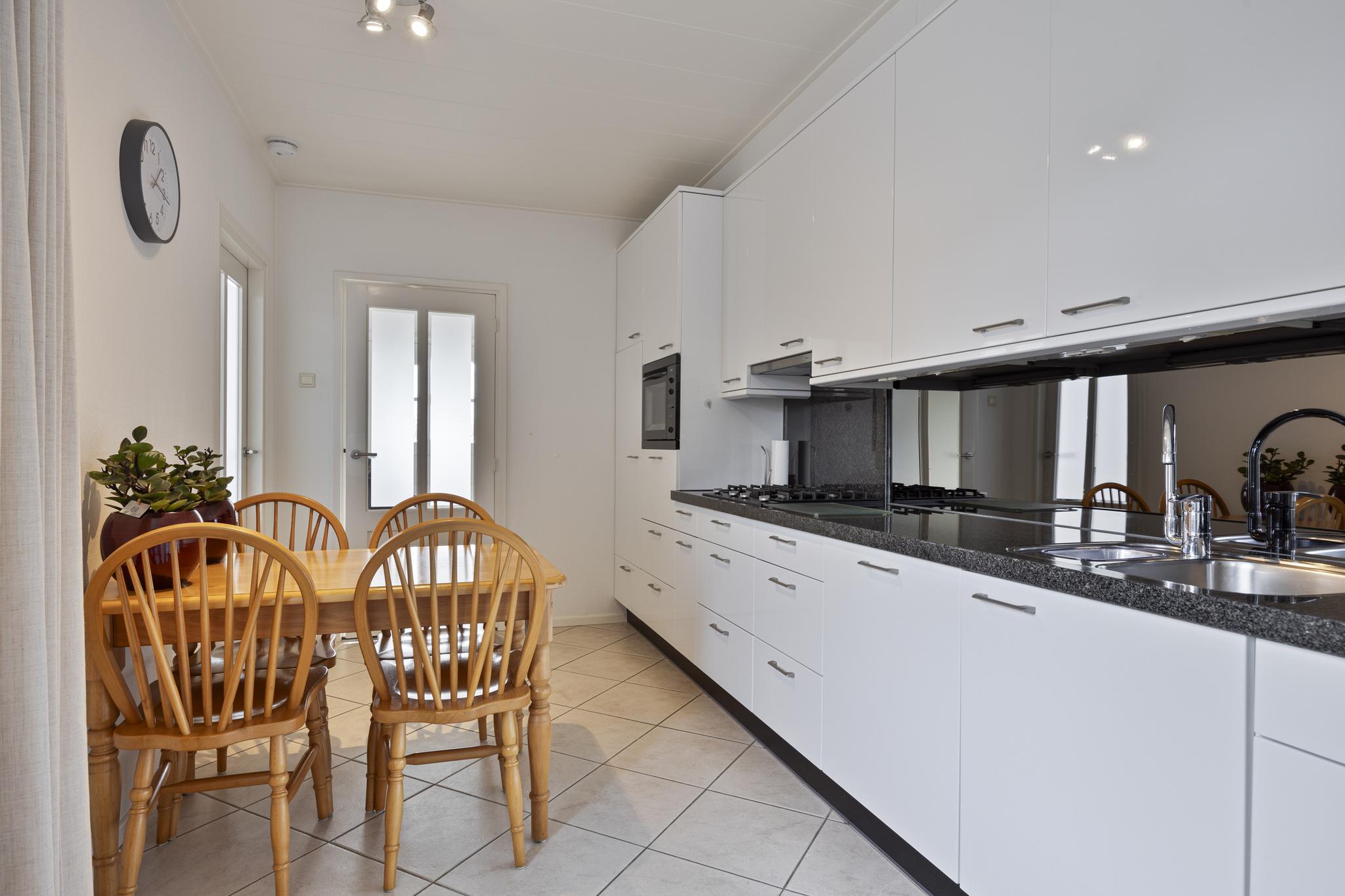 – De keuken is praktisch ingericht met een nette keukeninrichting met granieten werkblad en ingebouwde gaskookplaat, afzuigkap, koelkast, vaatwasser, combi-magnetron en voldoende kastruimte;