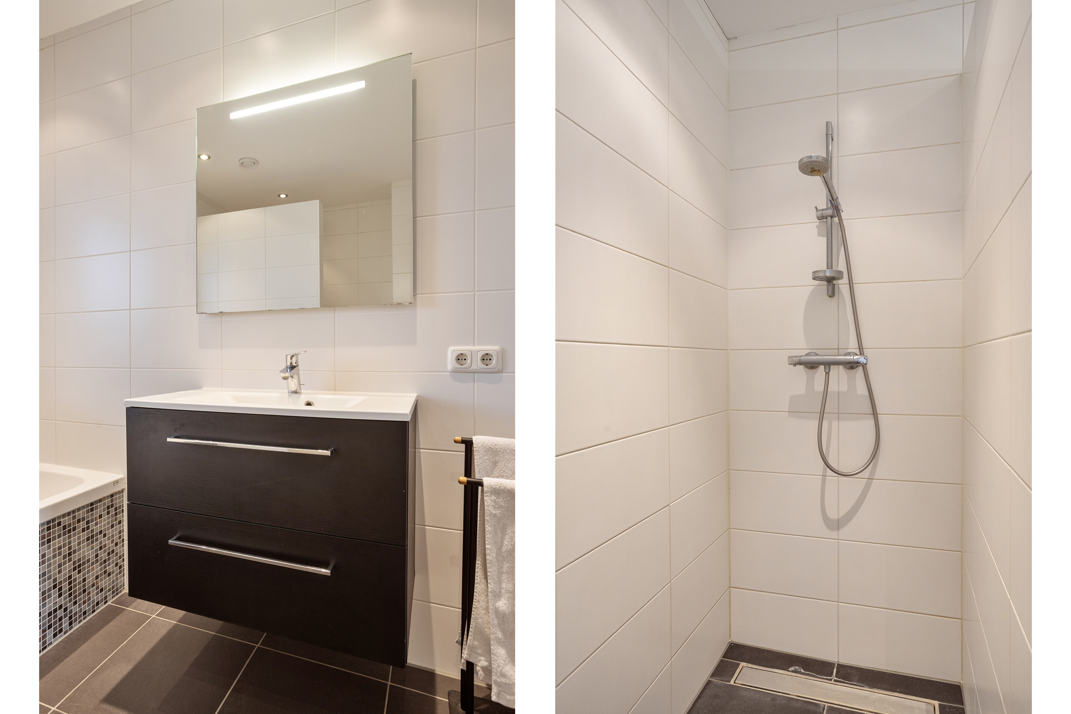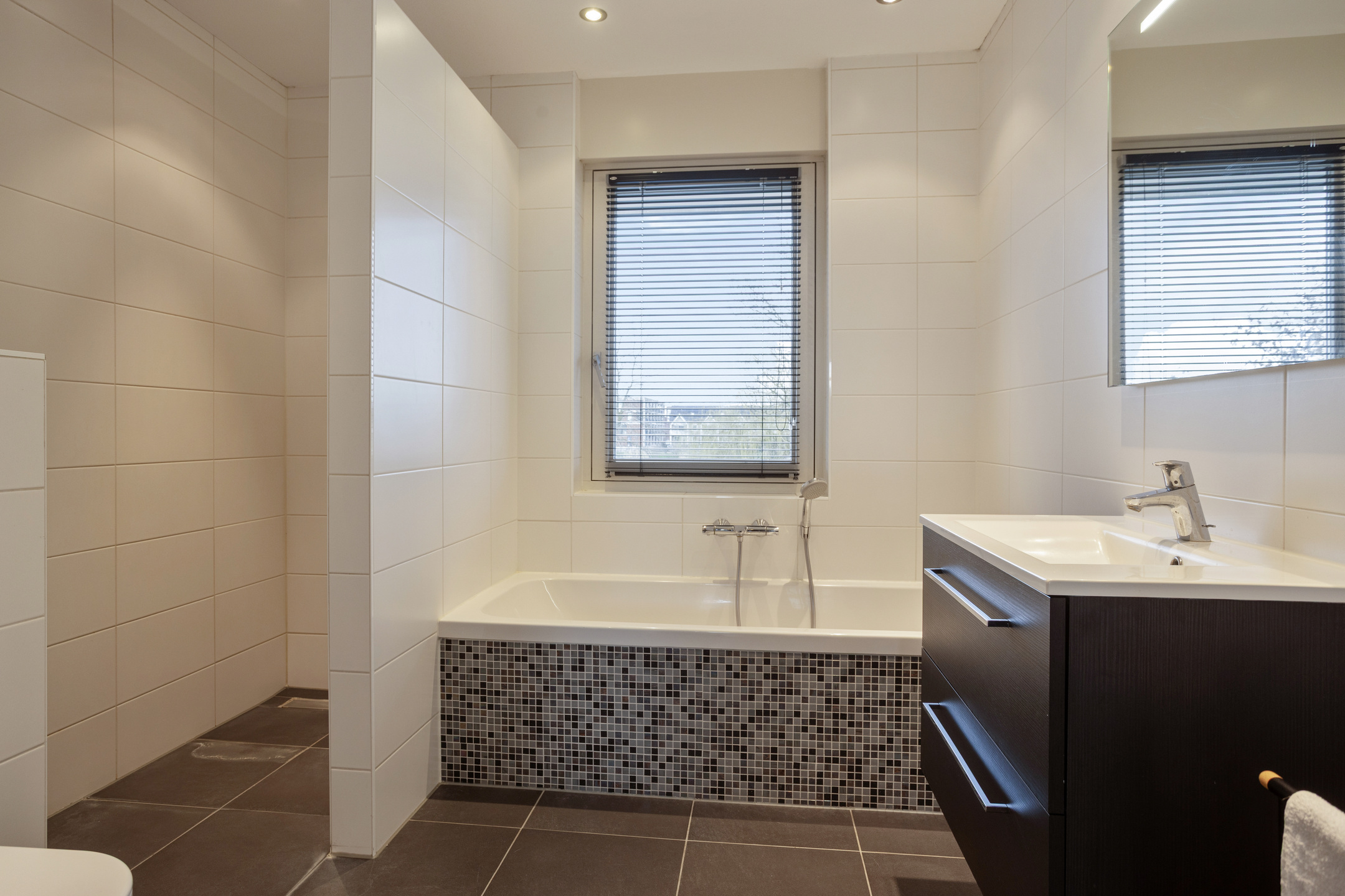 - Badkamervoorzieningen Ligbad, toilet, wastafel, inloopdouche, vloerverwarming