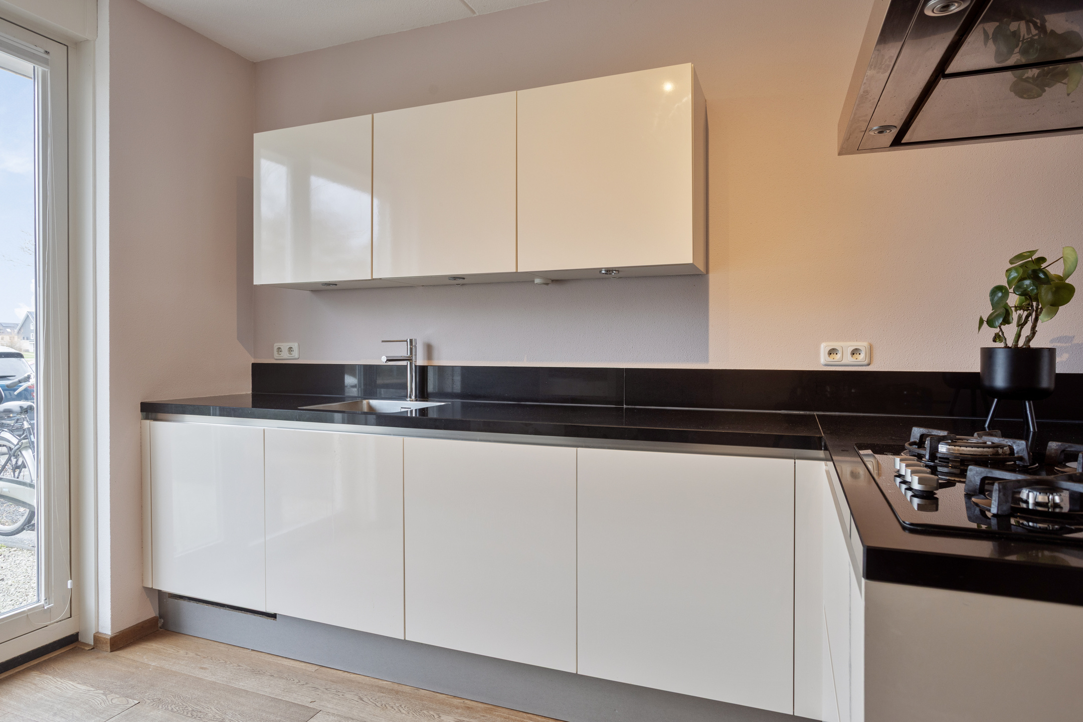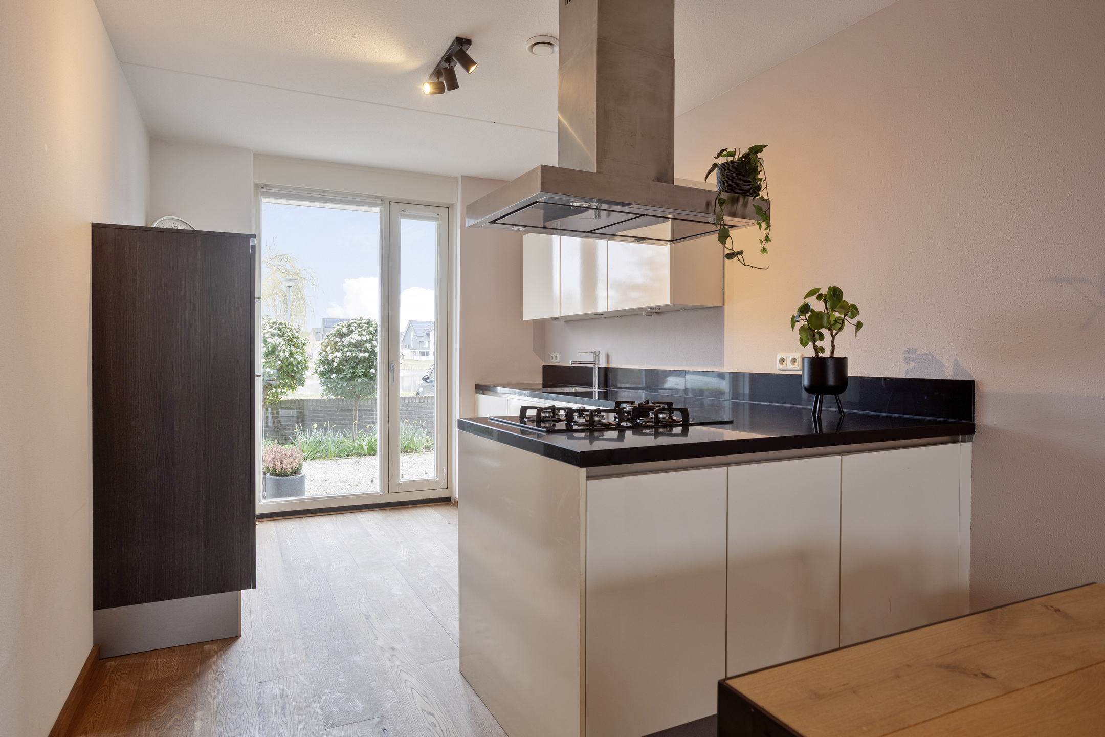 – De halfopen keuken aan de voorzijde is uitgevoerd in hoogglans wit met een chic zwart natuurstenen werkblad. Uiteraard compleet uitgerust met een 4-pits gaskookplaat, RVS afzuigkap, vaatwasser, koelkast, separate vriezer, oven en magnetron – een fijne plek voor kookliefhebbers;