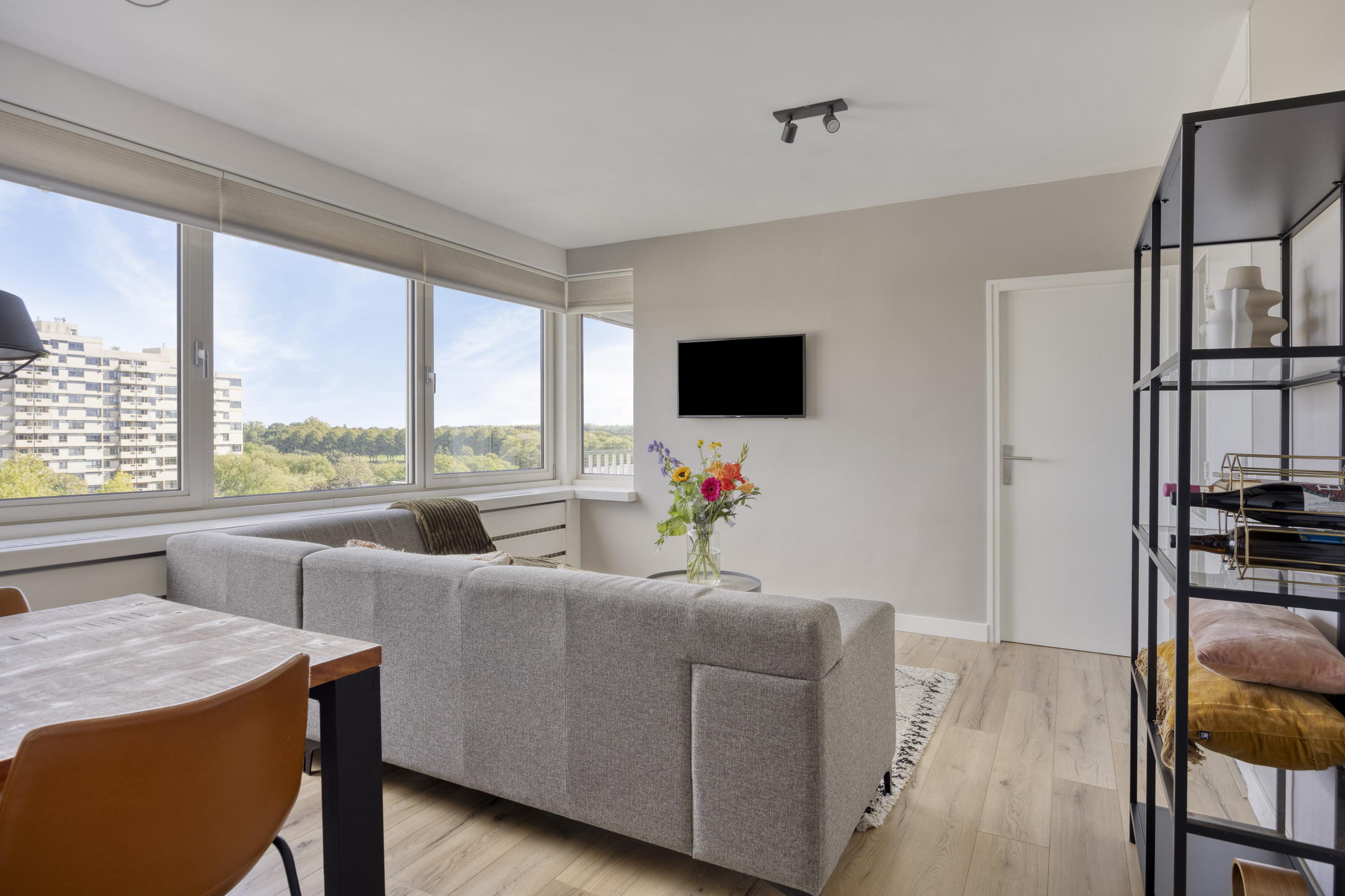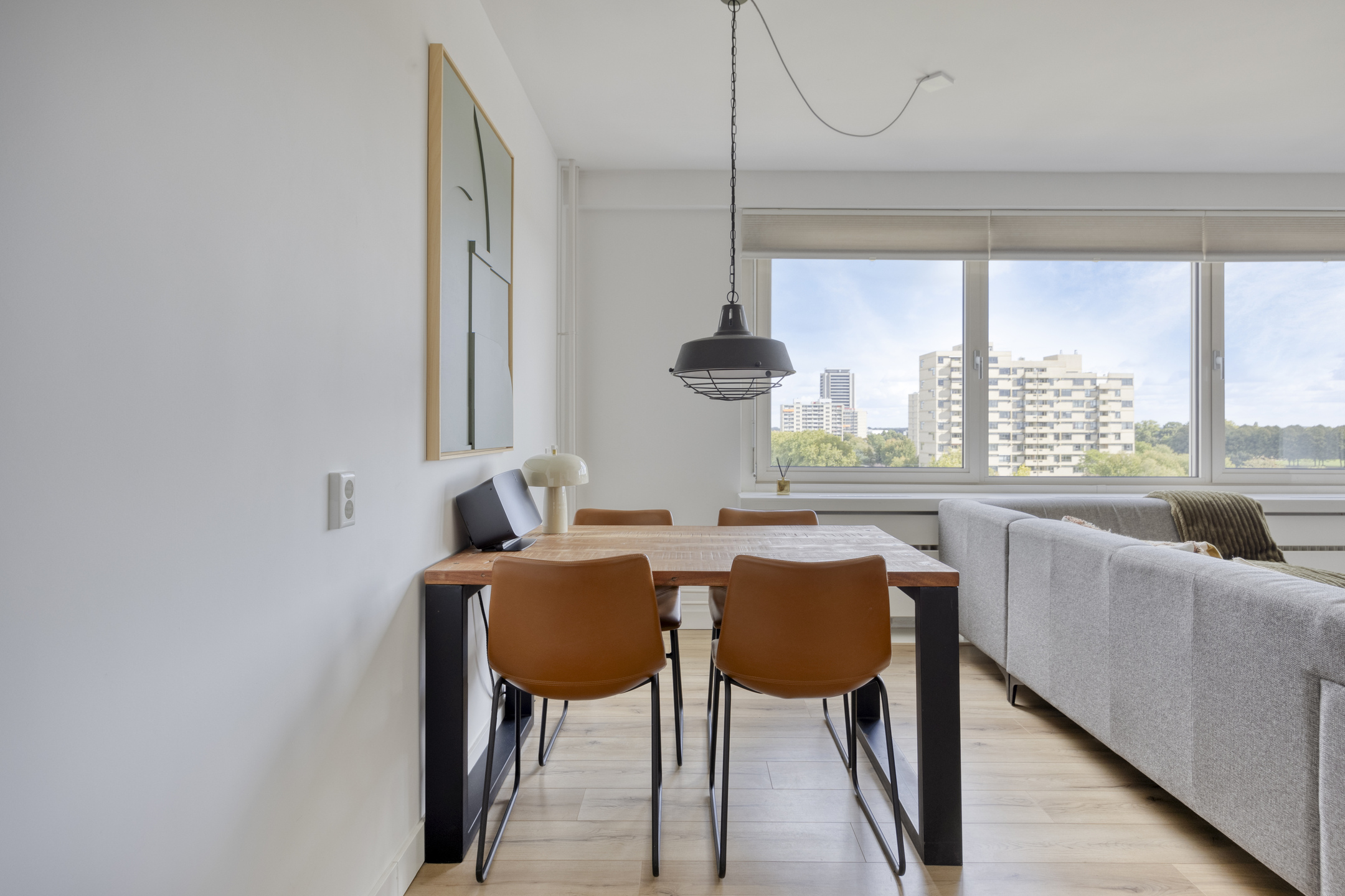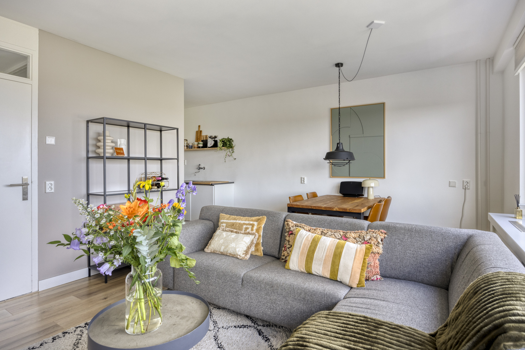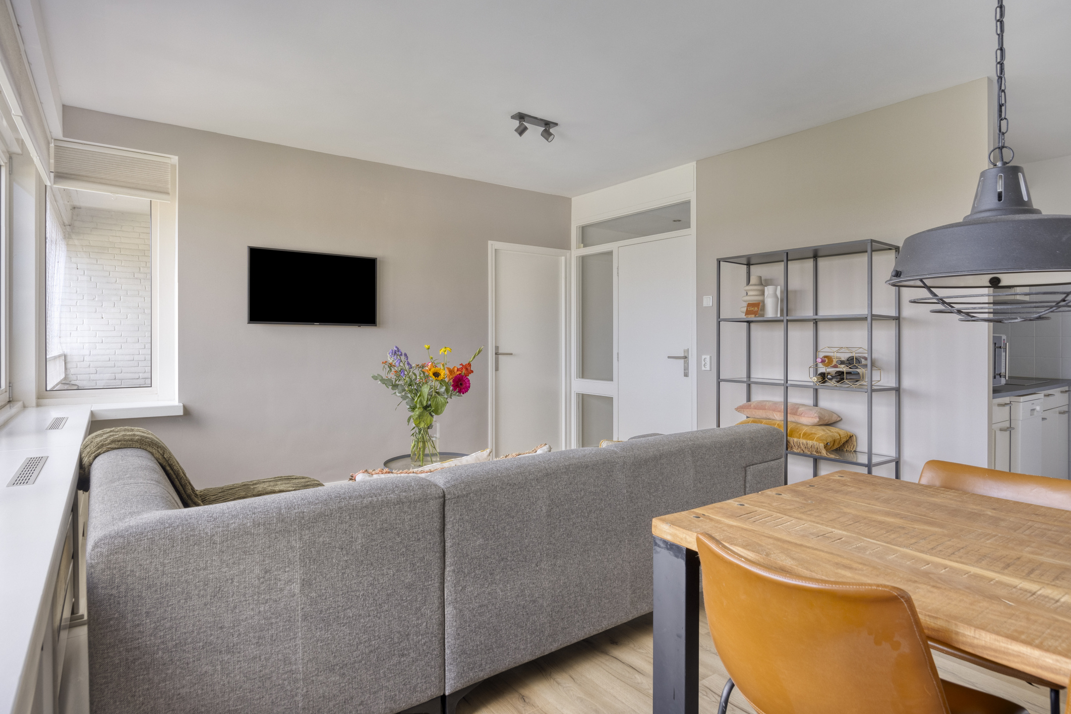– de woonkamer is licht en prettig ingedeeld, voorzien van een laminaatvloer en strak gestucte wanden, en biedt ruimte voor zowel een zithoek als een eettafel;