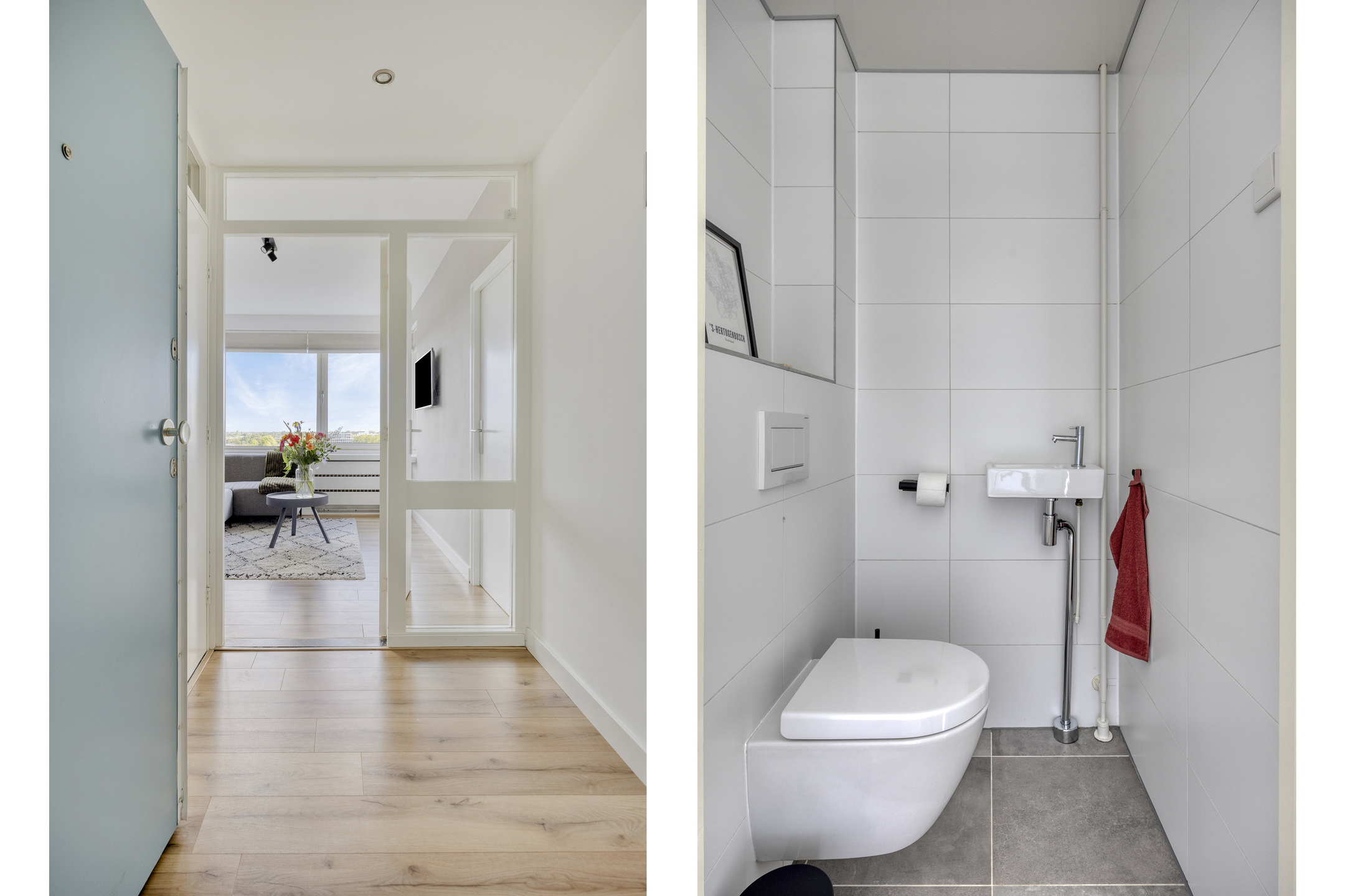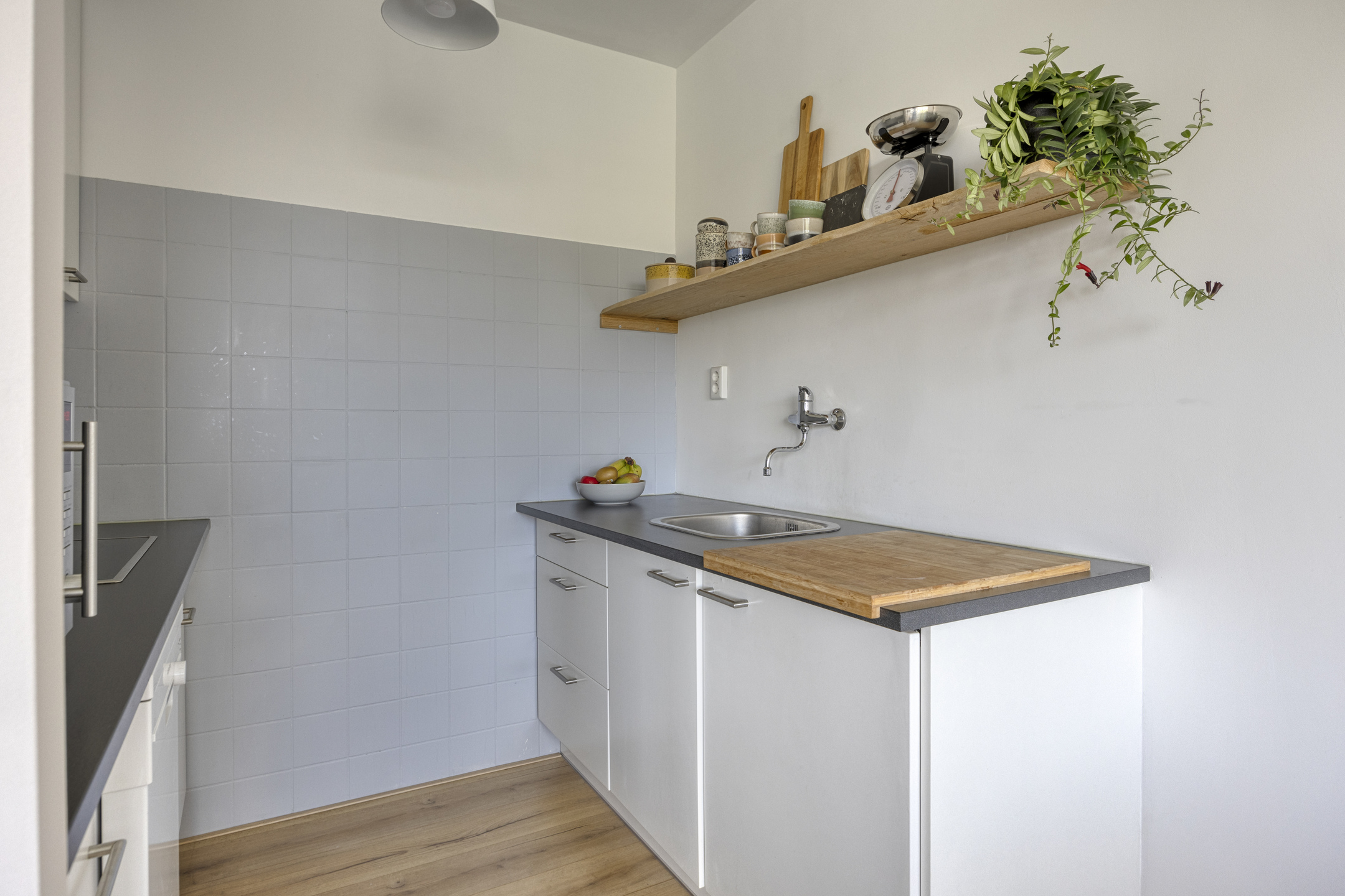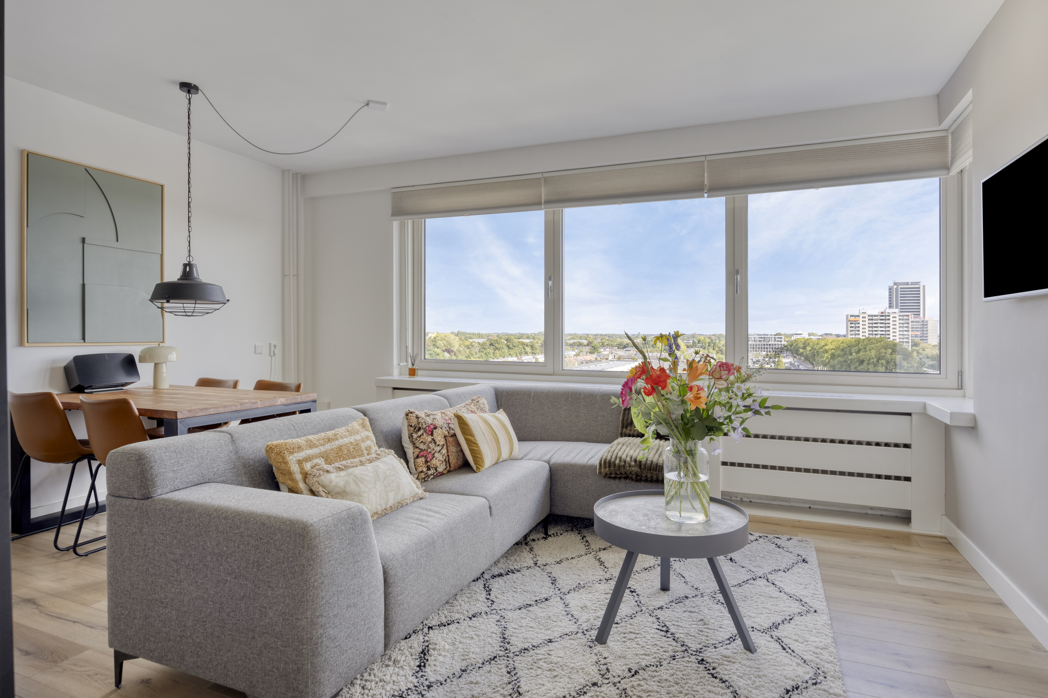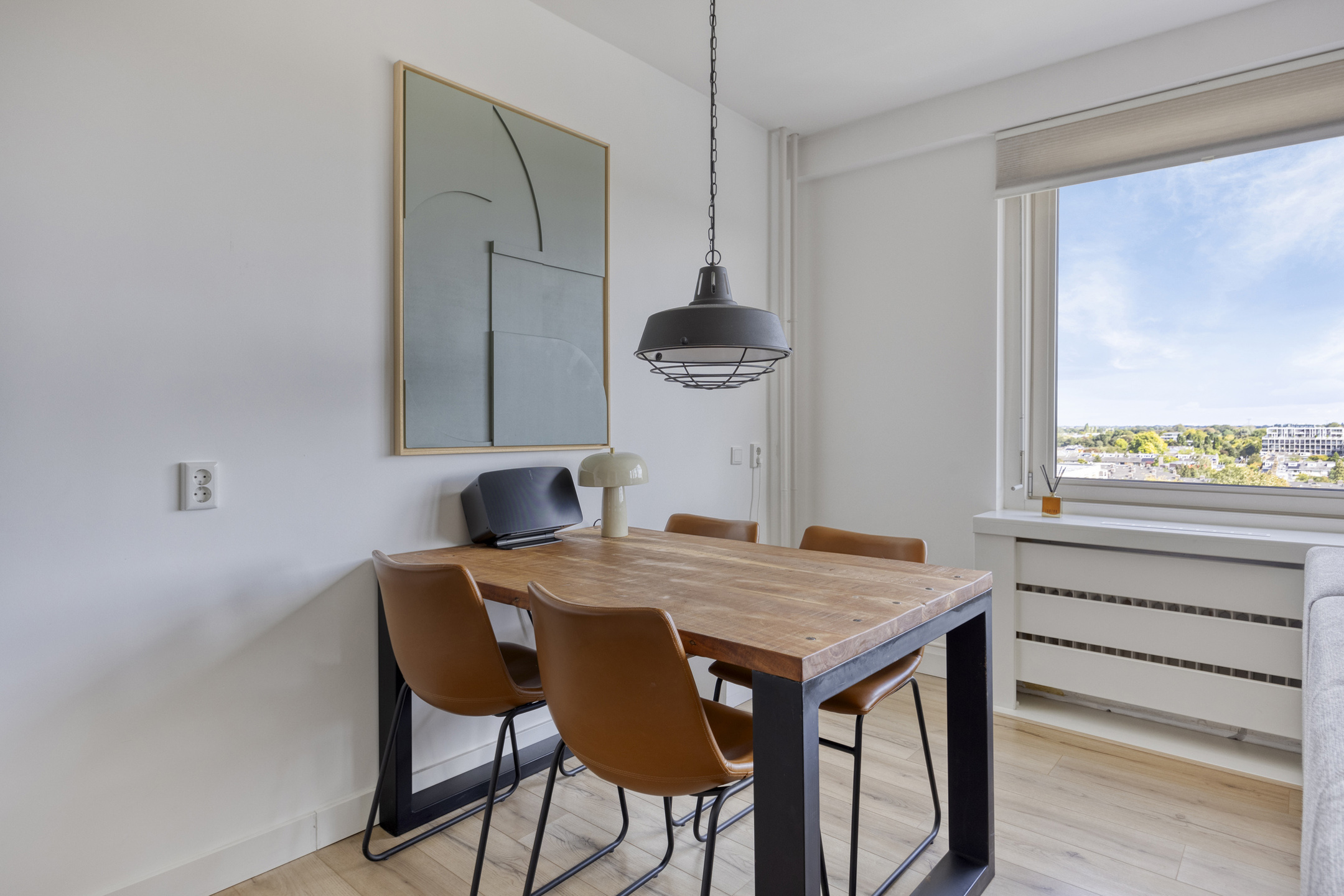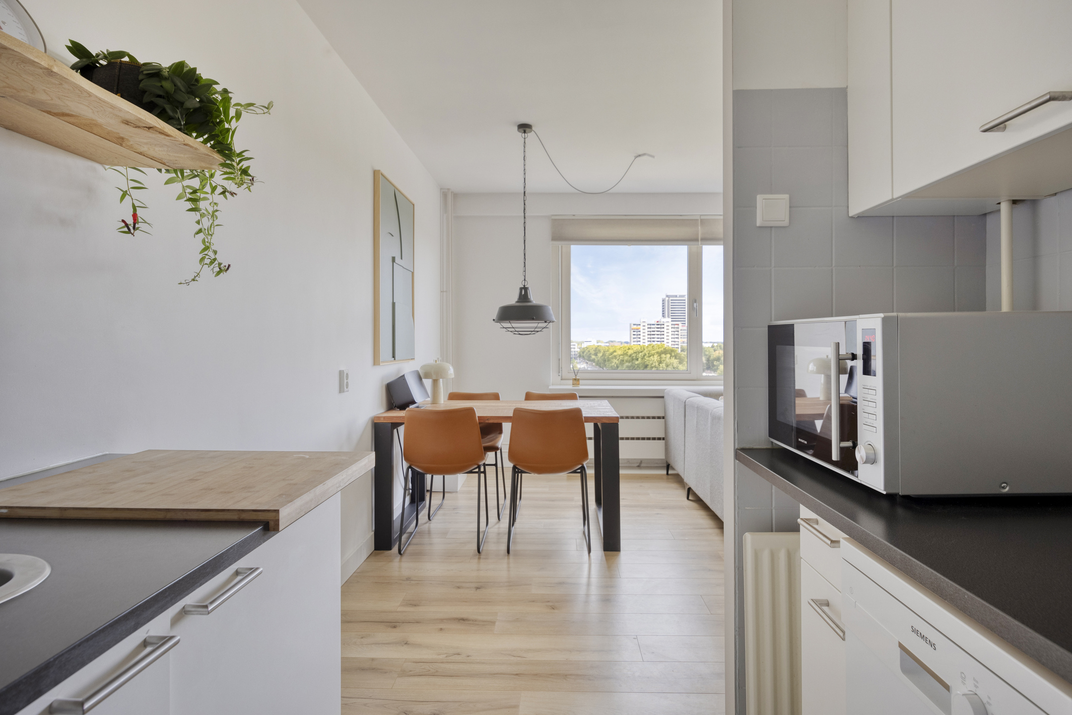 – de woonkamer is licht en prettig ingedeeld, voorzien van een laminaatvloer en strak gestucte wanden, en biedt ruimte voor zowel een zithoek als een eettafel;