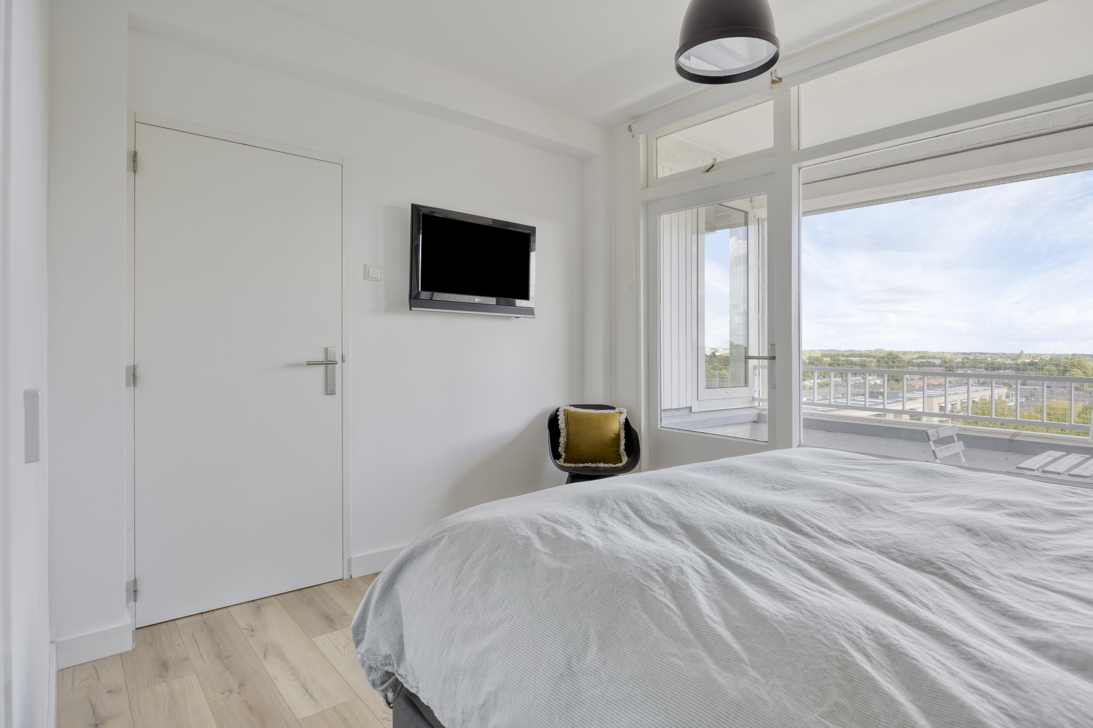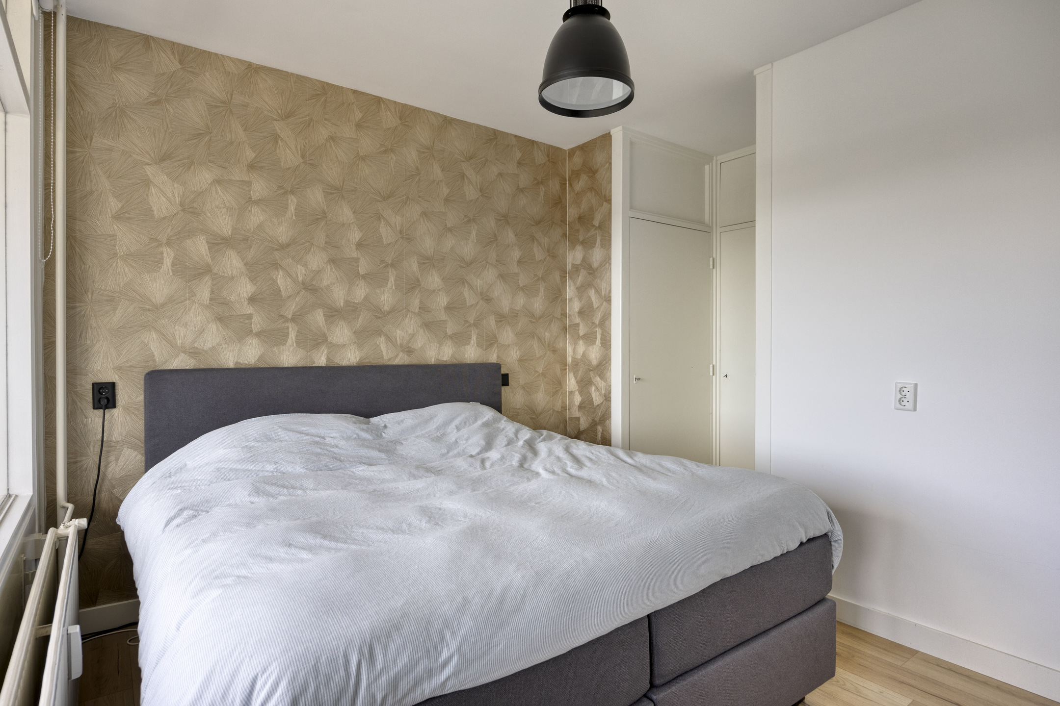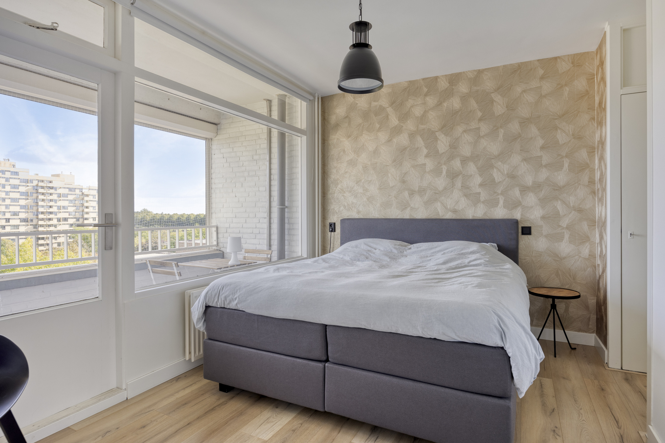 – de ruime slaapkamer biedt toegang tot het balkon en beschikt over een vaste kast en een sfeervol accentbehang;