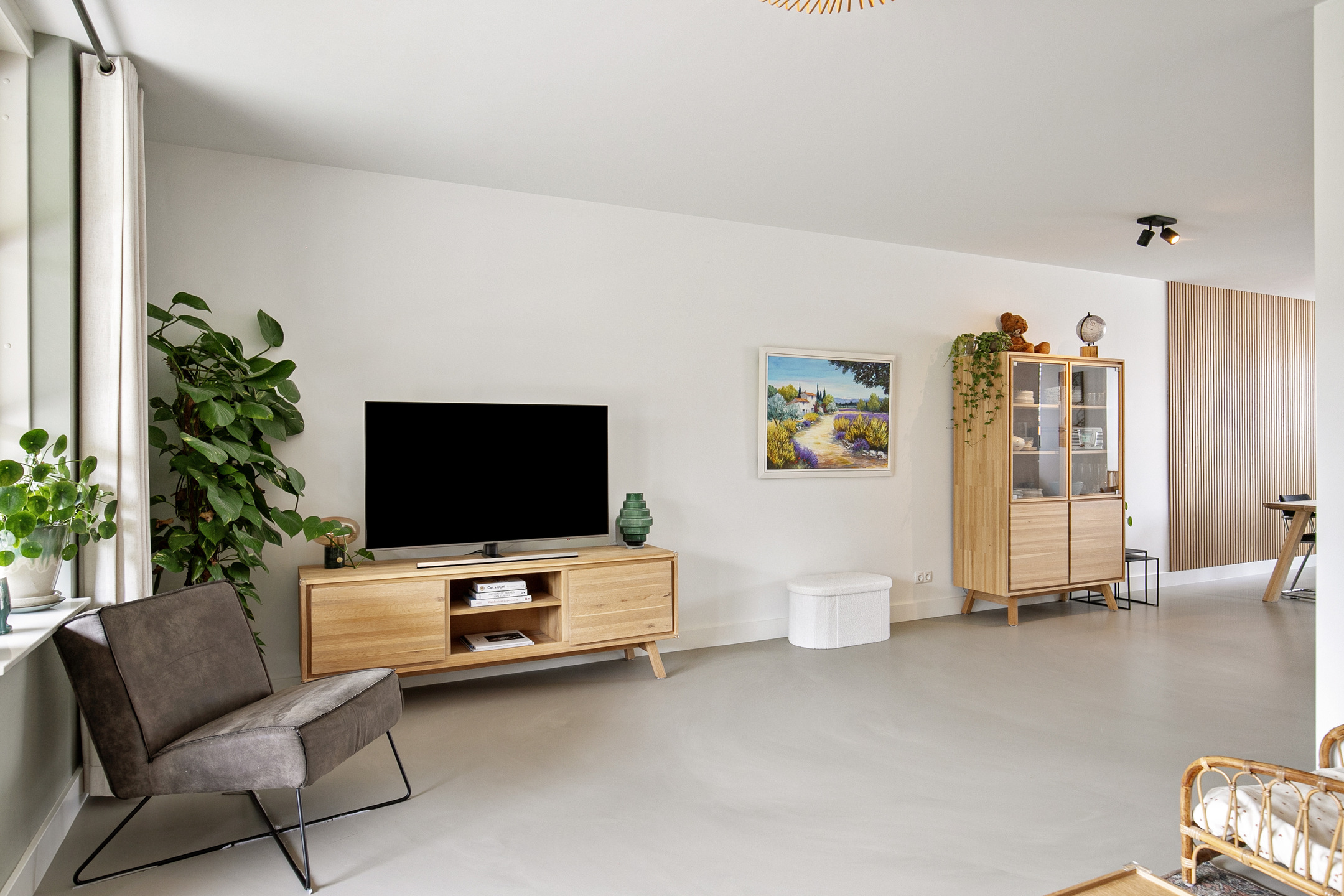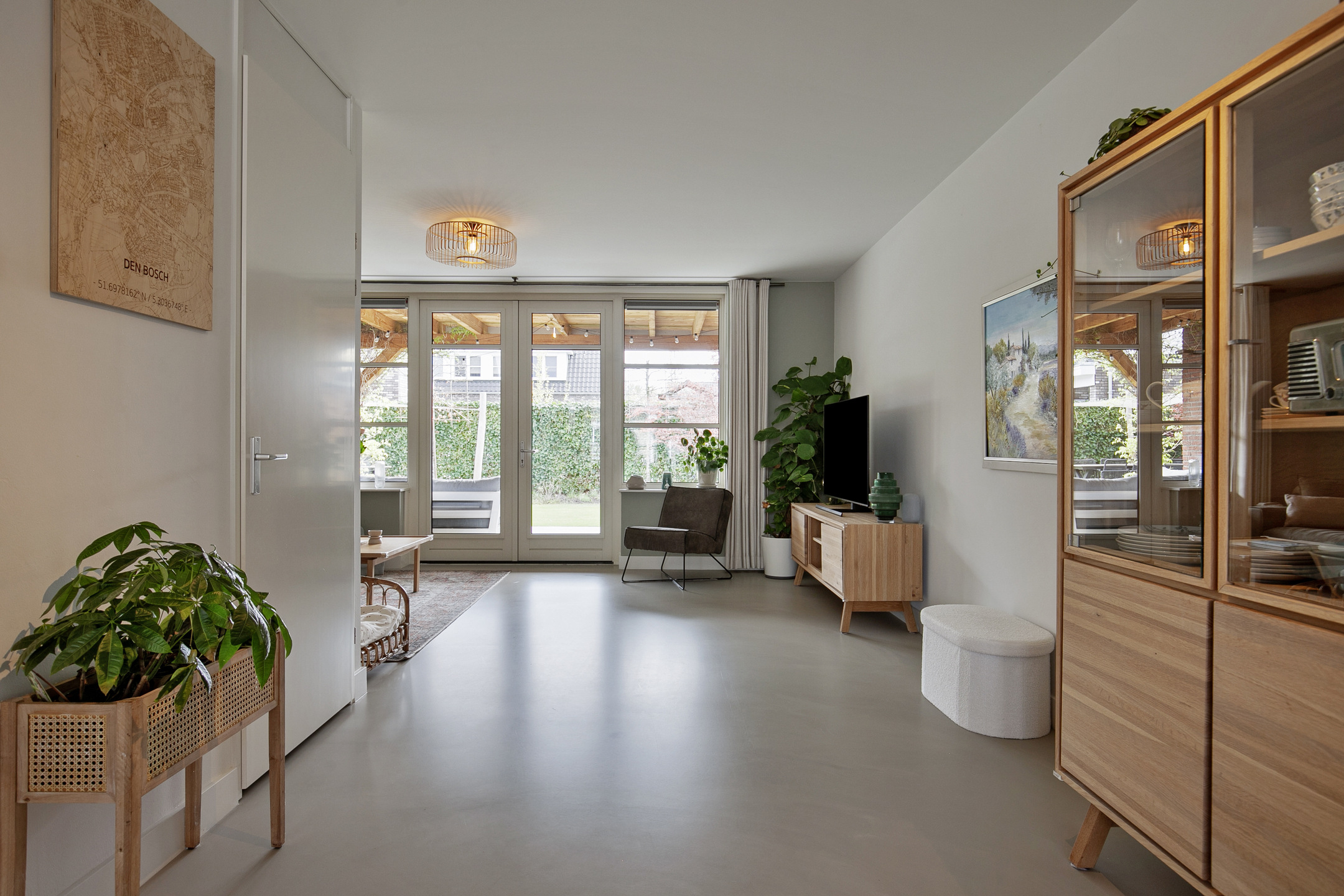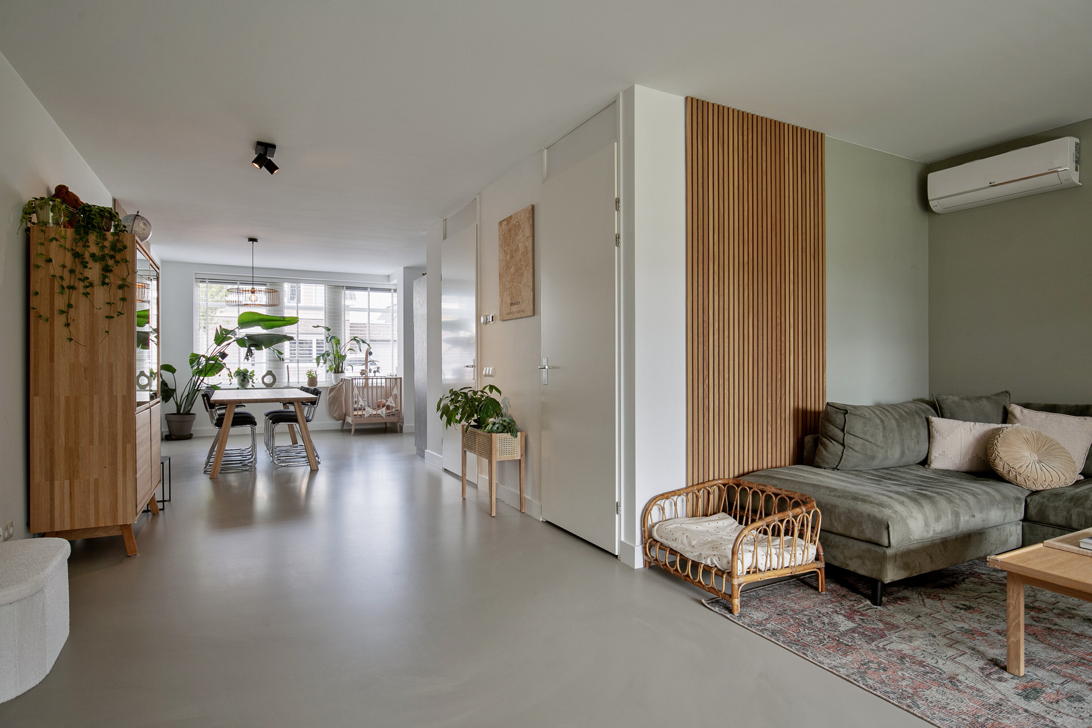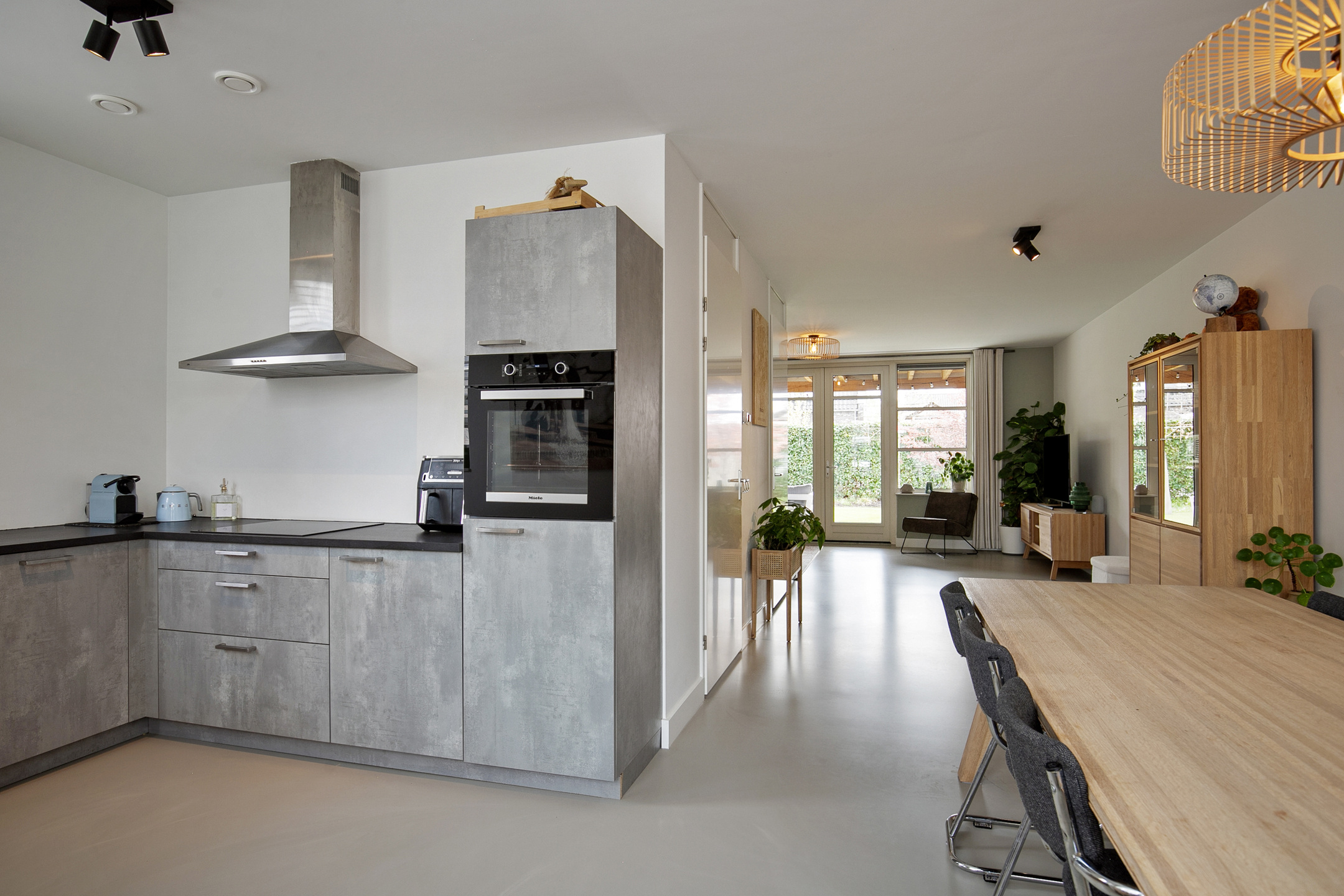 – de begane grond is strak afgewerkt met een moderne gietvloer en gestucte wanden en beschikt over een ruime en lichte woonkamer met grote raampartijen en openslaande deuren naar de tuin, wat zorgt voor een prettige verbinding tussen binnen en buiten;