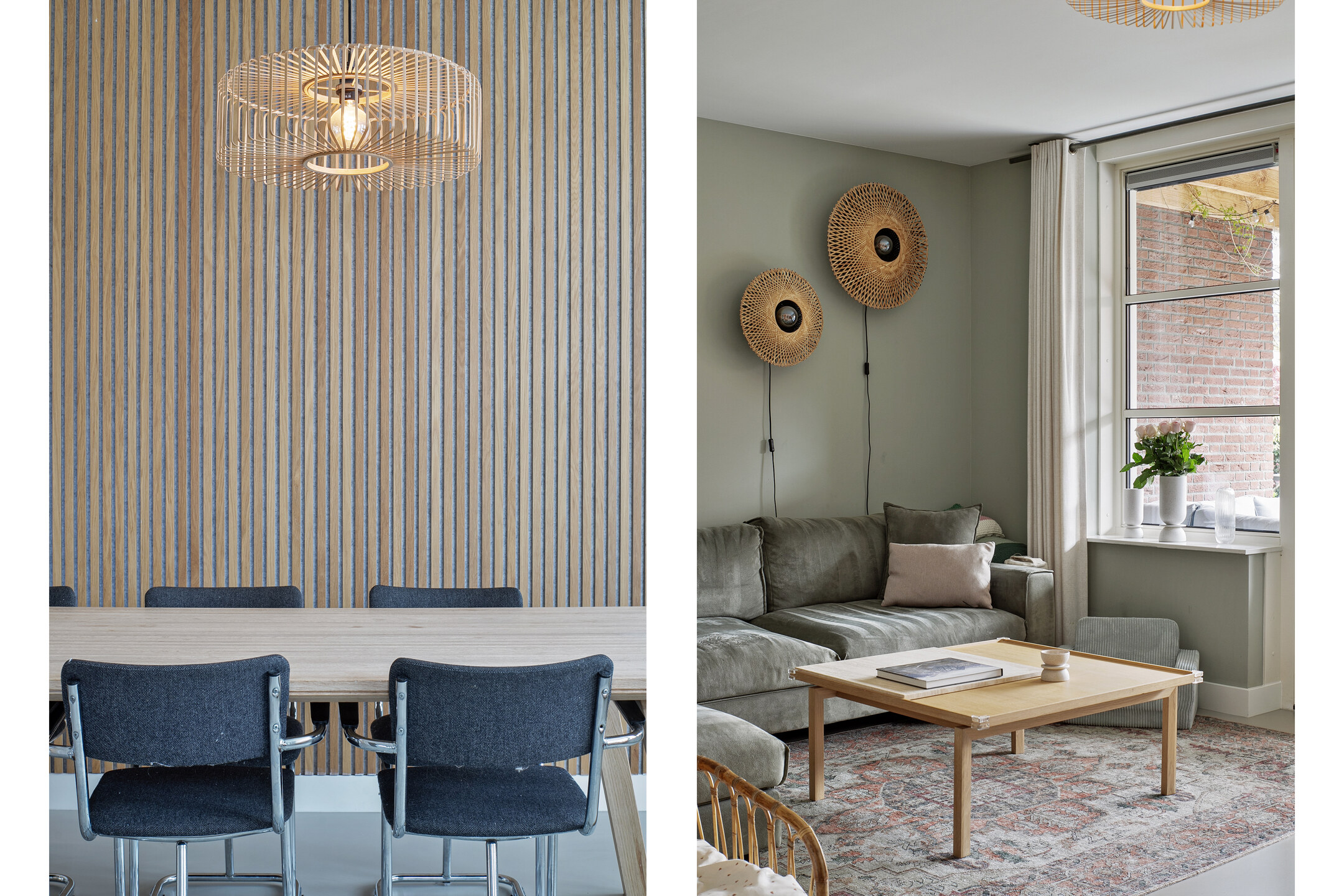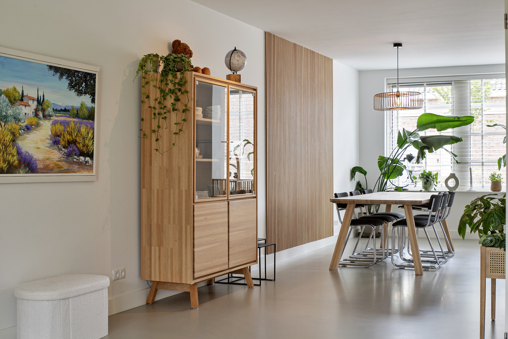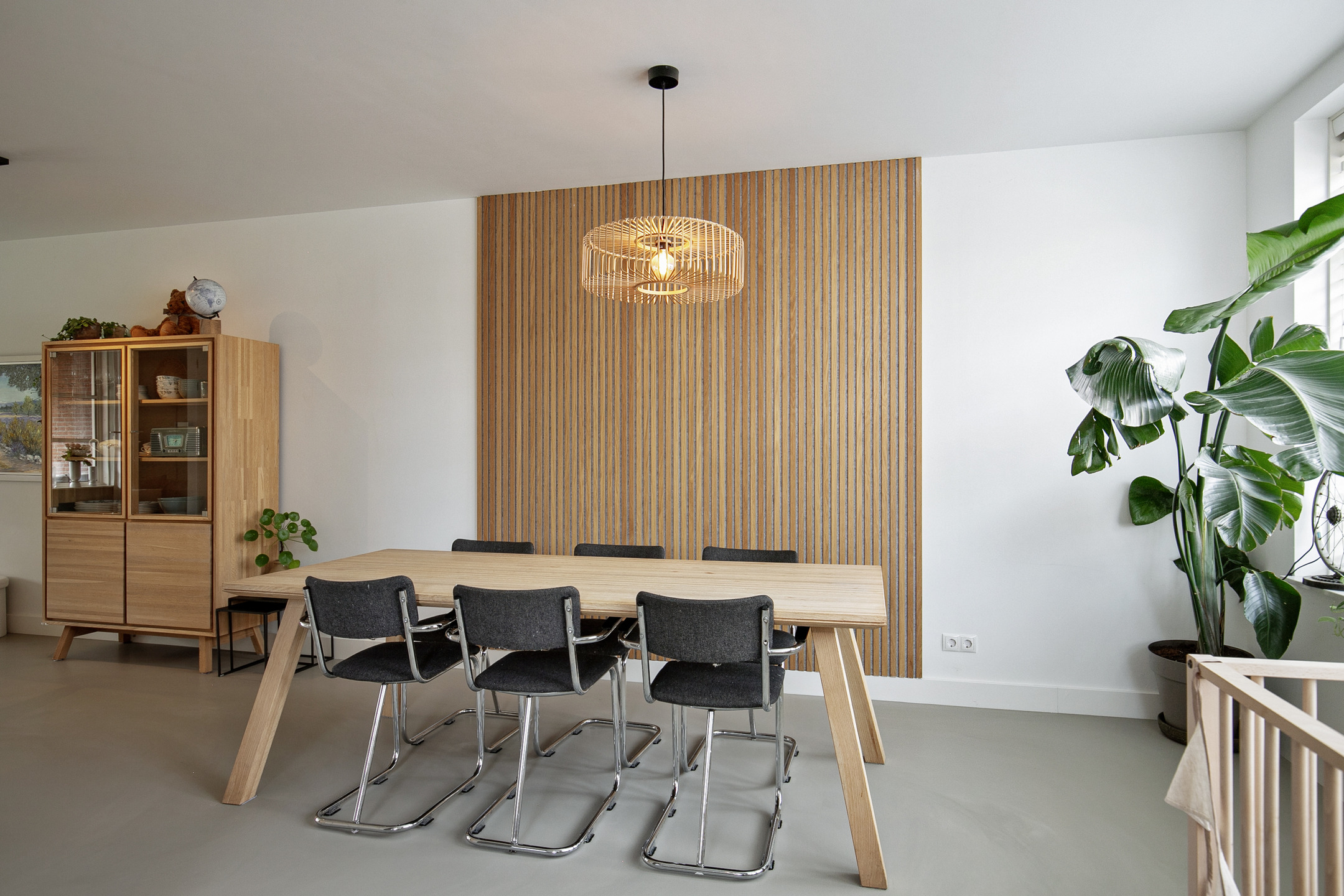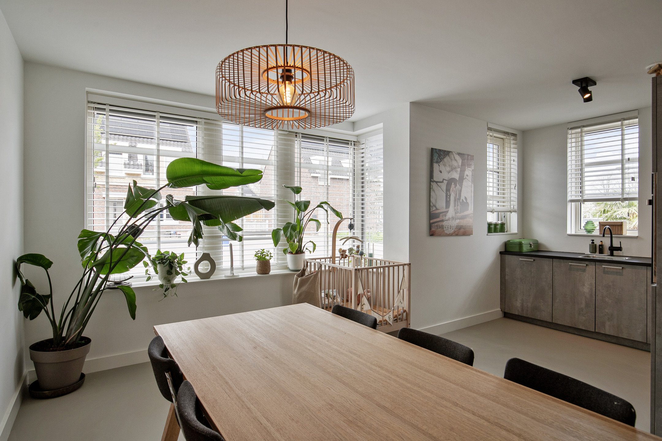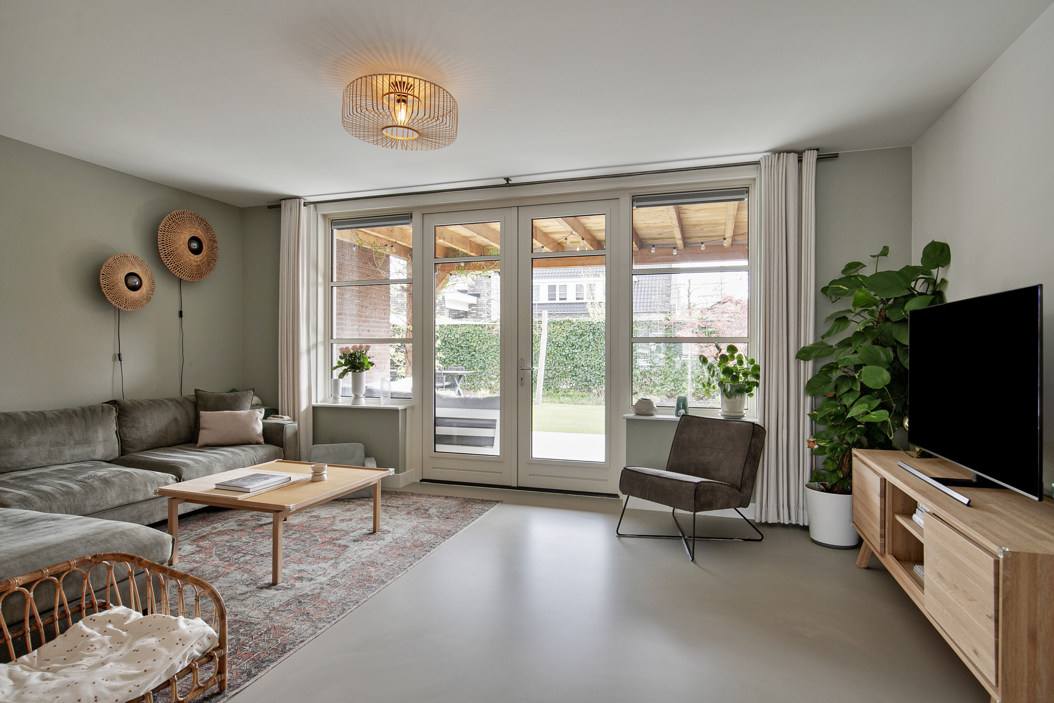 – de begane grond is strak afgewerkt met een moderne gietvloer en gestucte wanden en beschikt over een ruime en lichte woonkamer met grote raampartijen en openslaande deuren naar de tuin, wat zorgt voor een prettige verbinding tussen binnen en buiten;