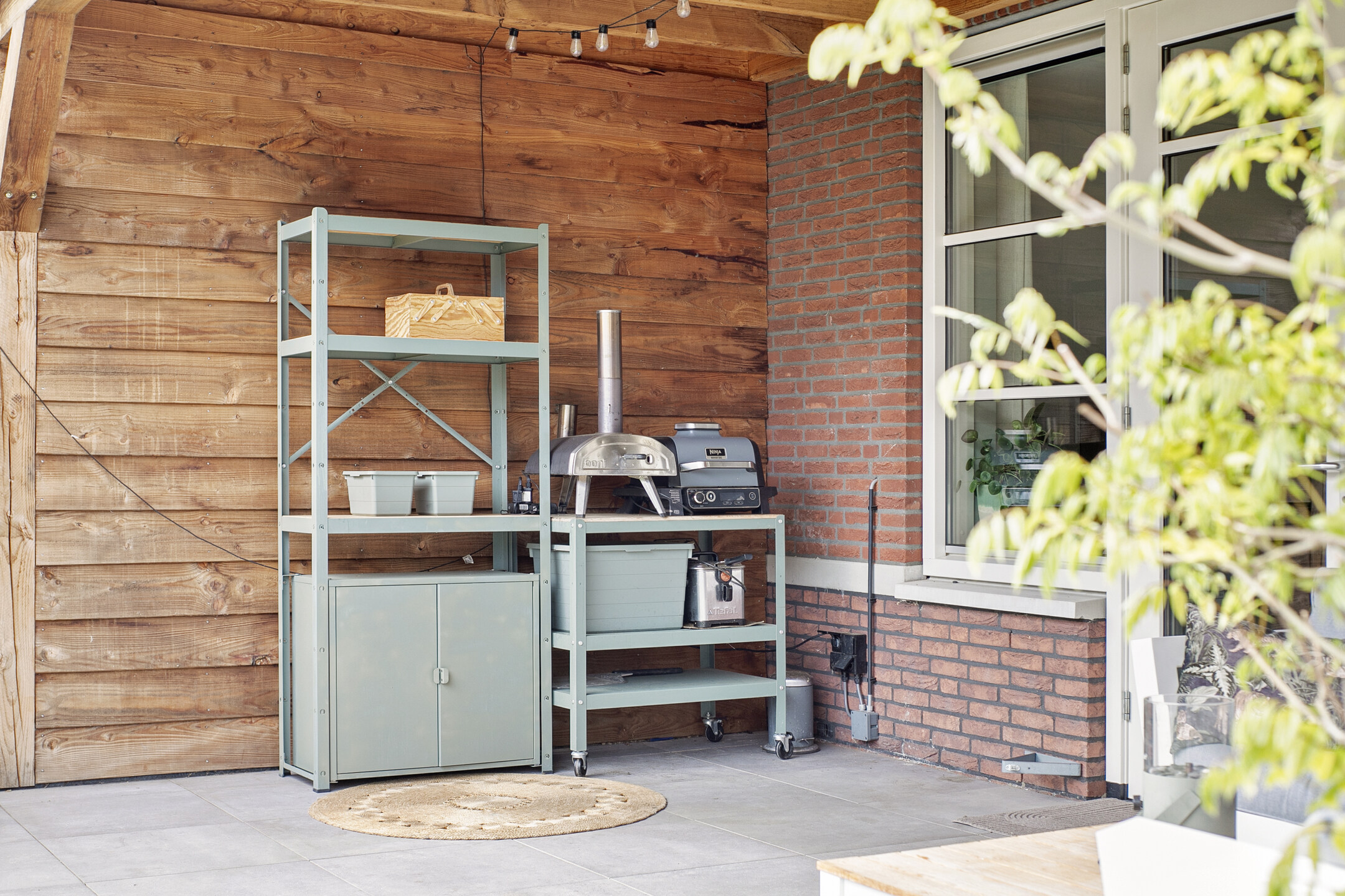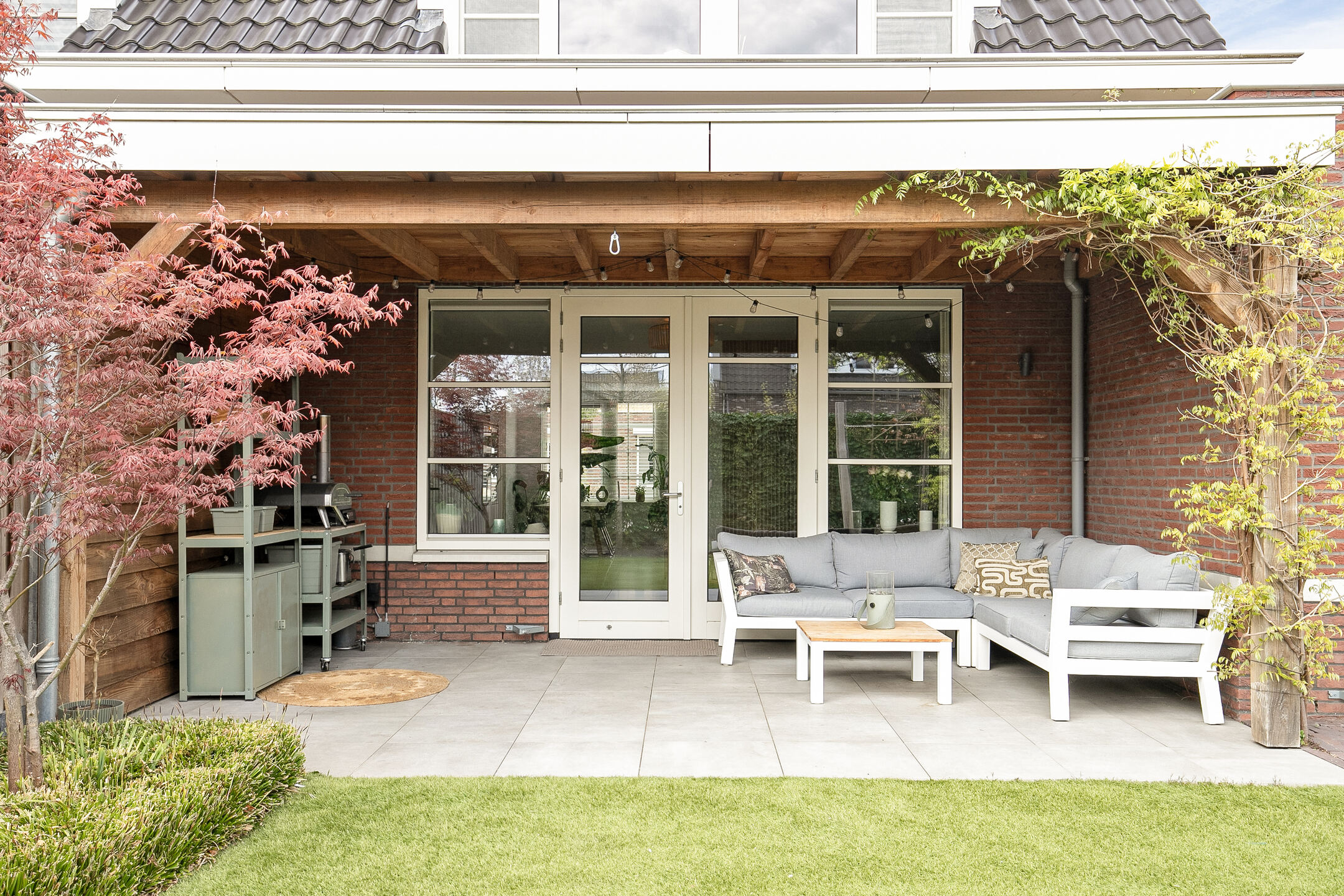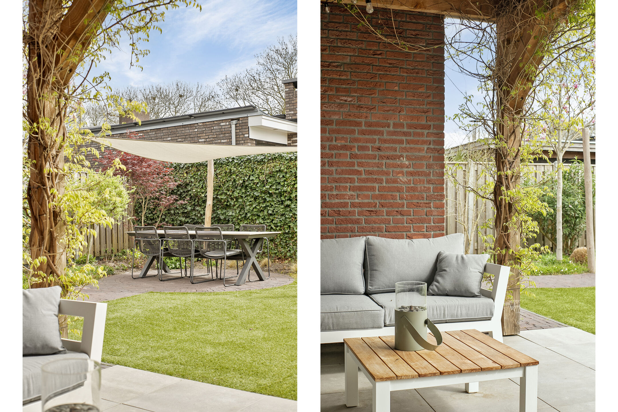 – onder de overkapping is een comfortabele zithoek gerealiseerd, ideaal om ook in de avonduren of bij minder weer heerlijk buiten te zitten;