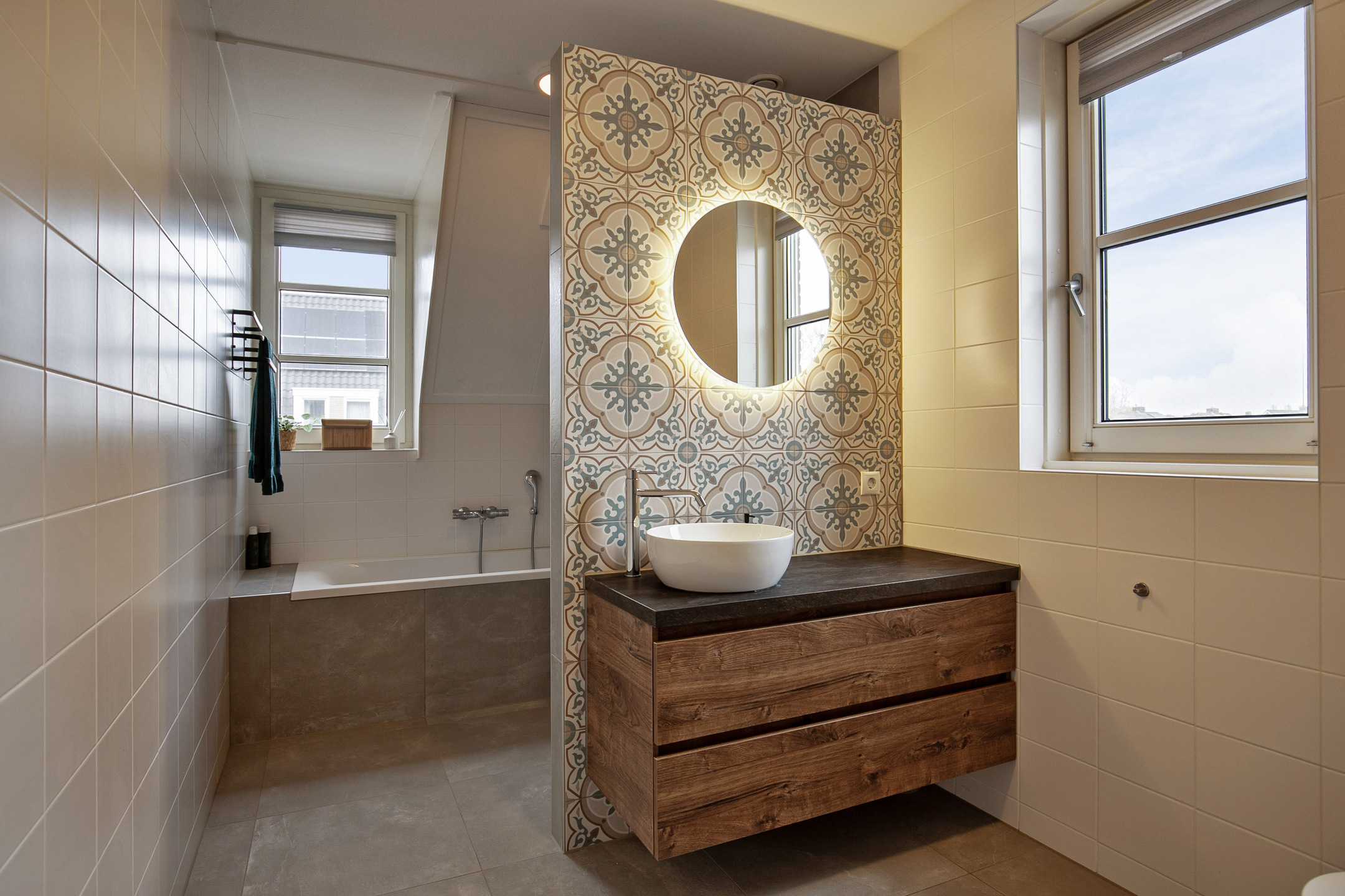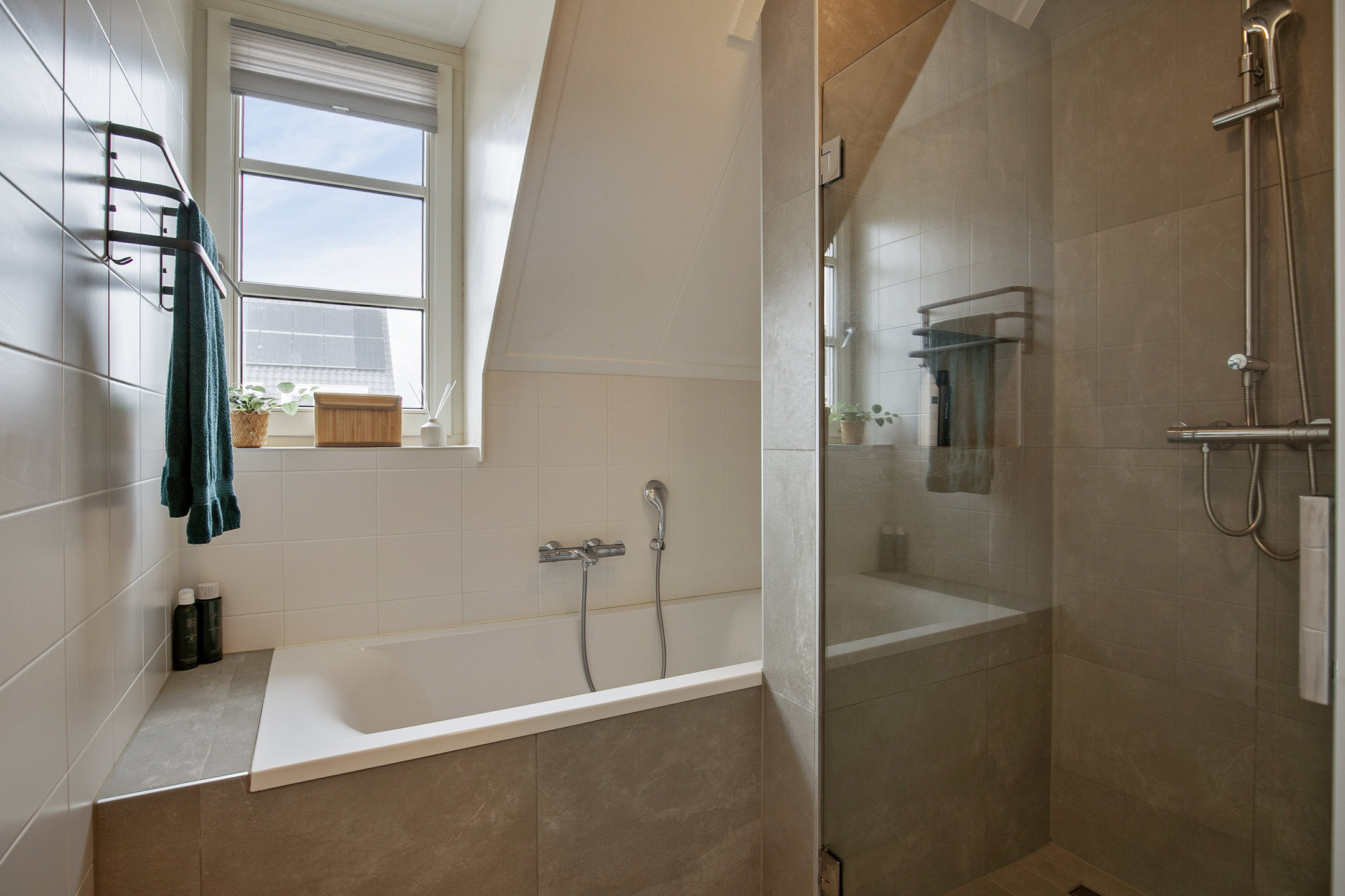 – de moderne en complete badkamer is volledig betegeld en uitgevoerd in een eigentijdse stijl en beschikt over een ligbad, een separate douche, een toilet en een wastafelmeubel met bergruimte, waardoor deze ruimte zowel comfortabel als praktisch is ingericht;