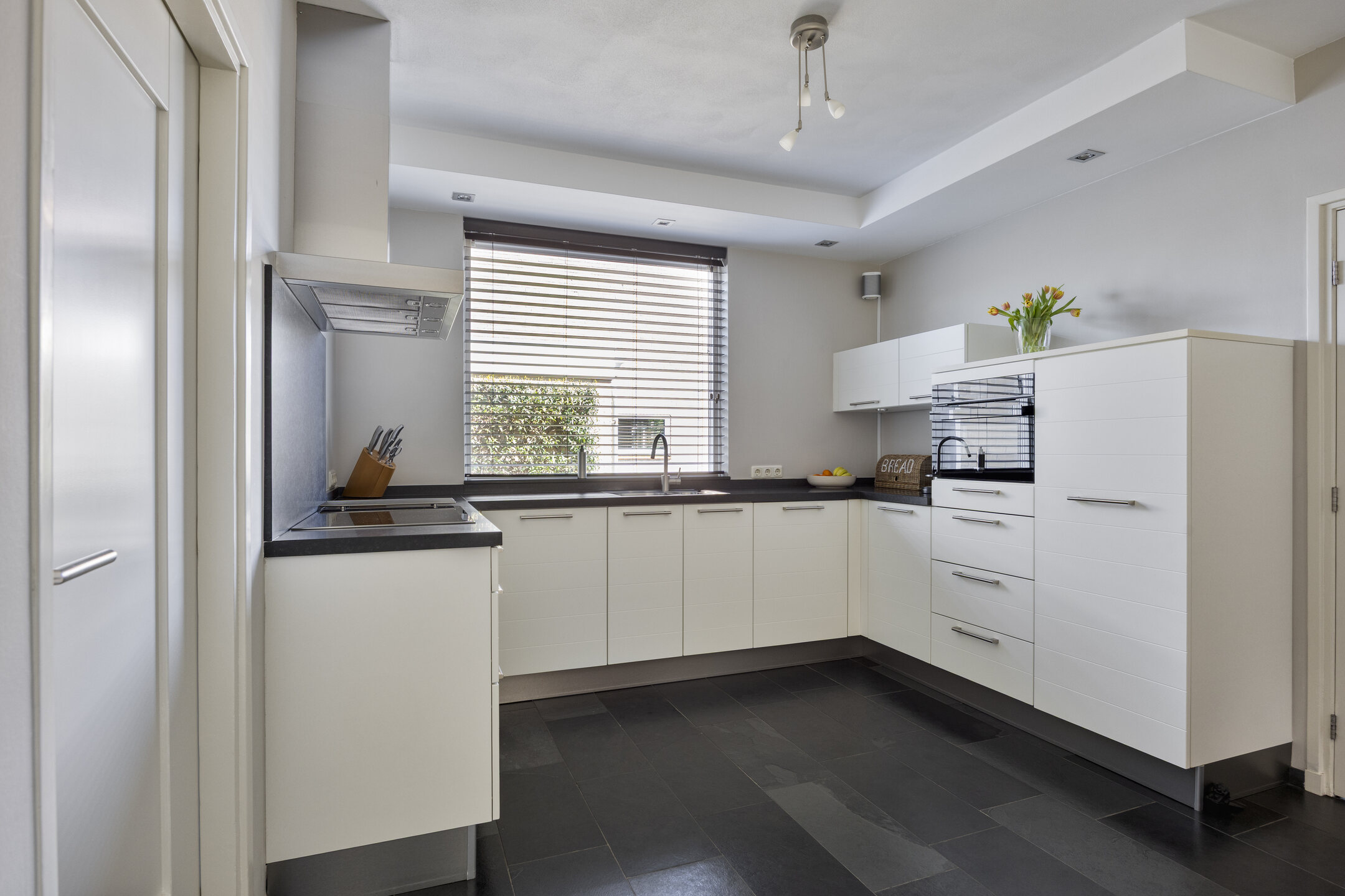 – de keuken is voorzien van comfortabele vloerverwarming en een moderne U-vormige keukeninrichting met granieten werkblad en een ingebouwde inductie kookplaat, afzuigkap, koelkast, combi-stoomoven en een vaatwasmachine;