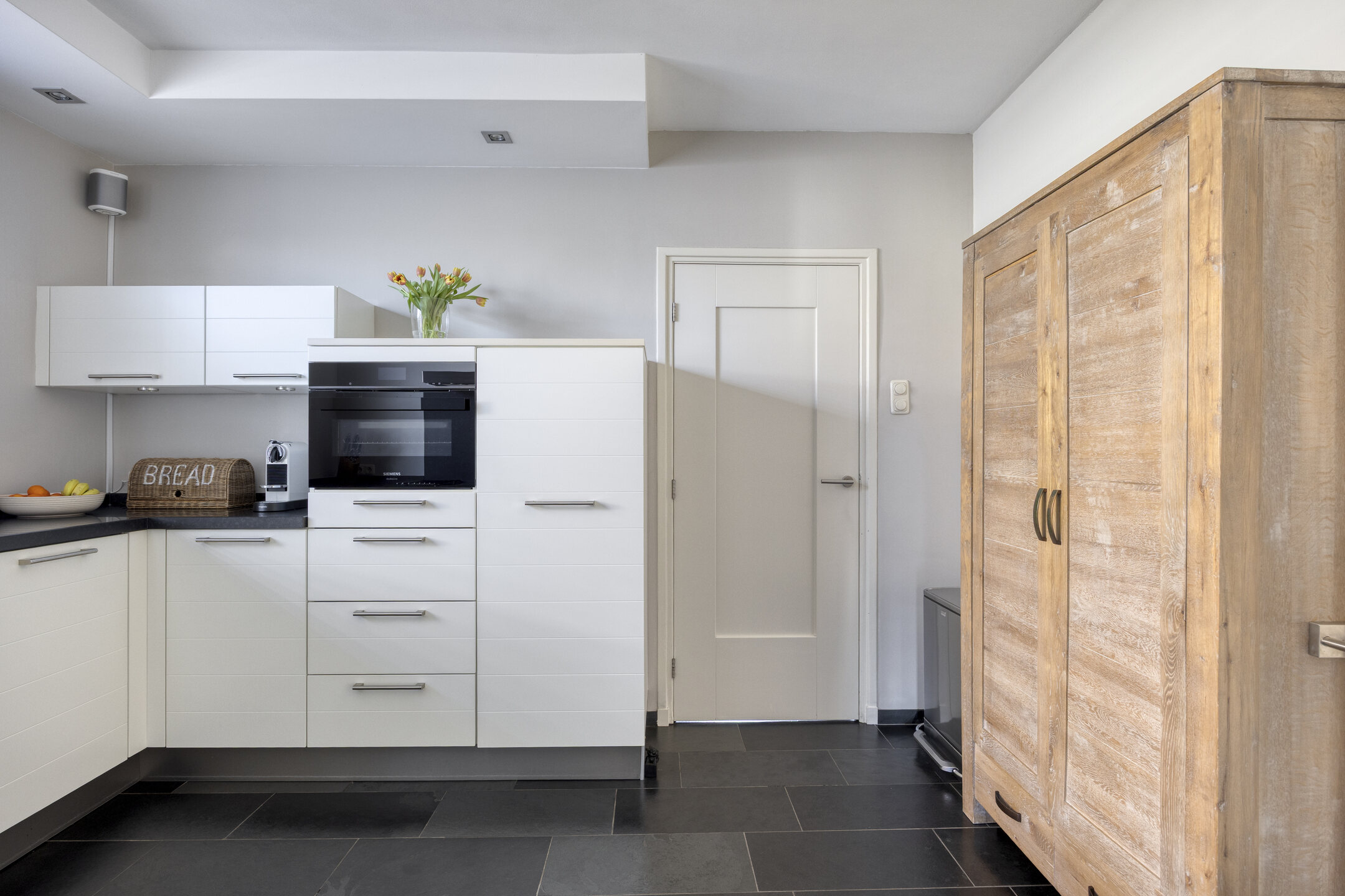 – de woning beschikt over een ruime, uitgebouwde woonkamer met grote raampartijen, strak gestucte wanden en een eikenhouten vloer;