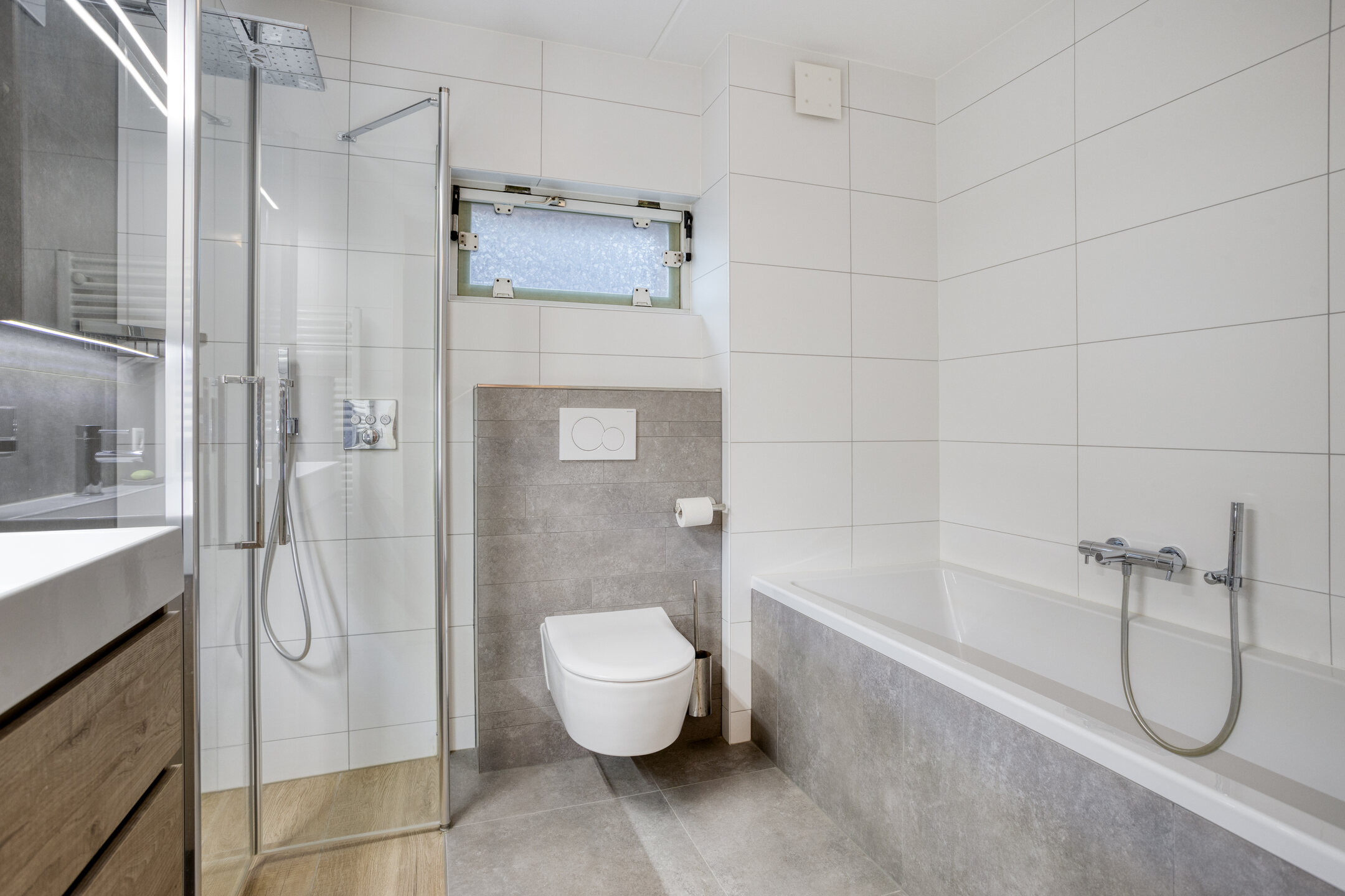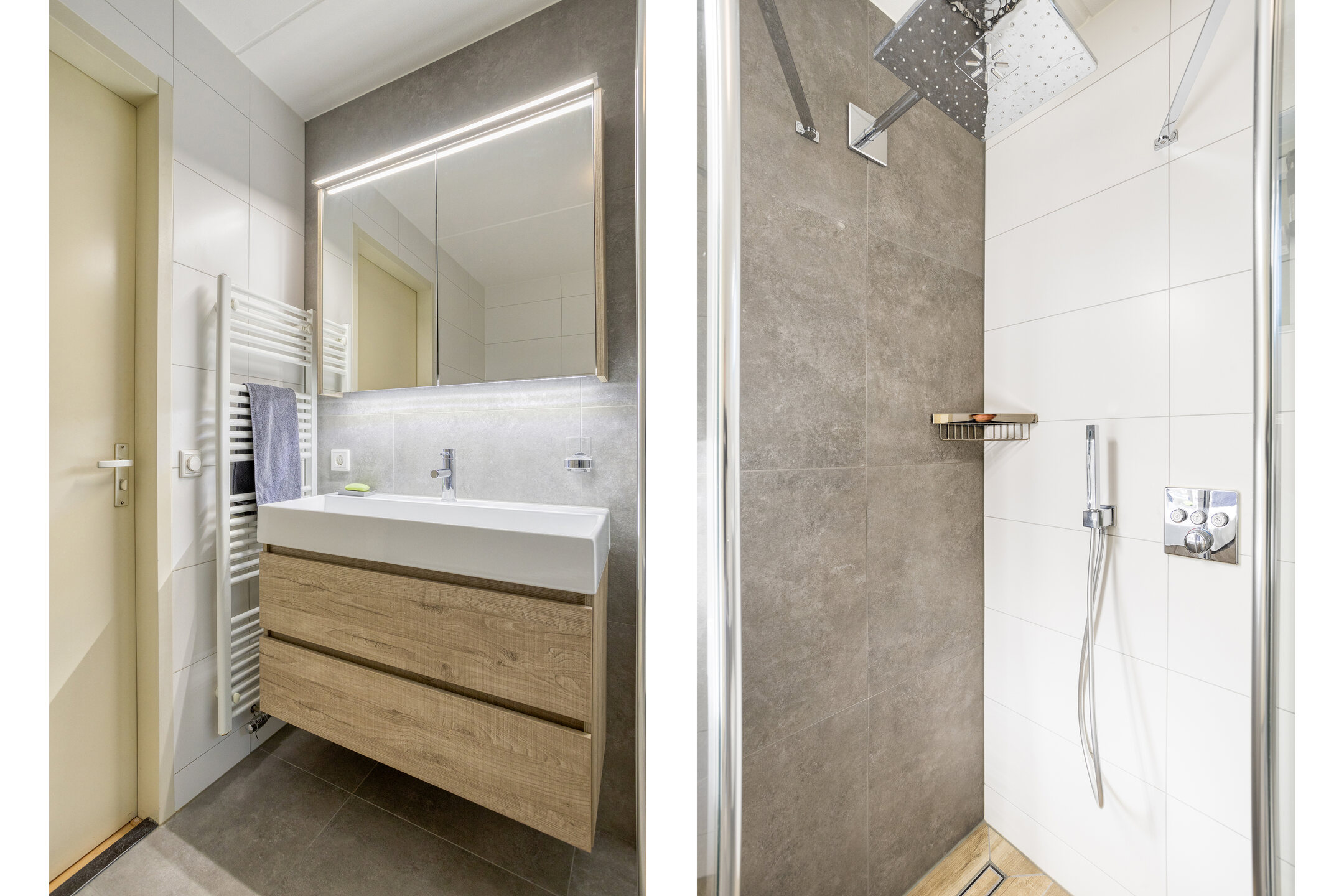 – de moderne badkamer uit 2020 volledig is betegeld en is ingericht met een inloopdouche met glazen wand, een ligbad, een zwevend toilet en een breed wastafelmeubel, wat zorgt voor een eigentijdse en complete uitstraling;