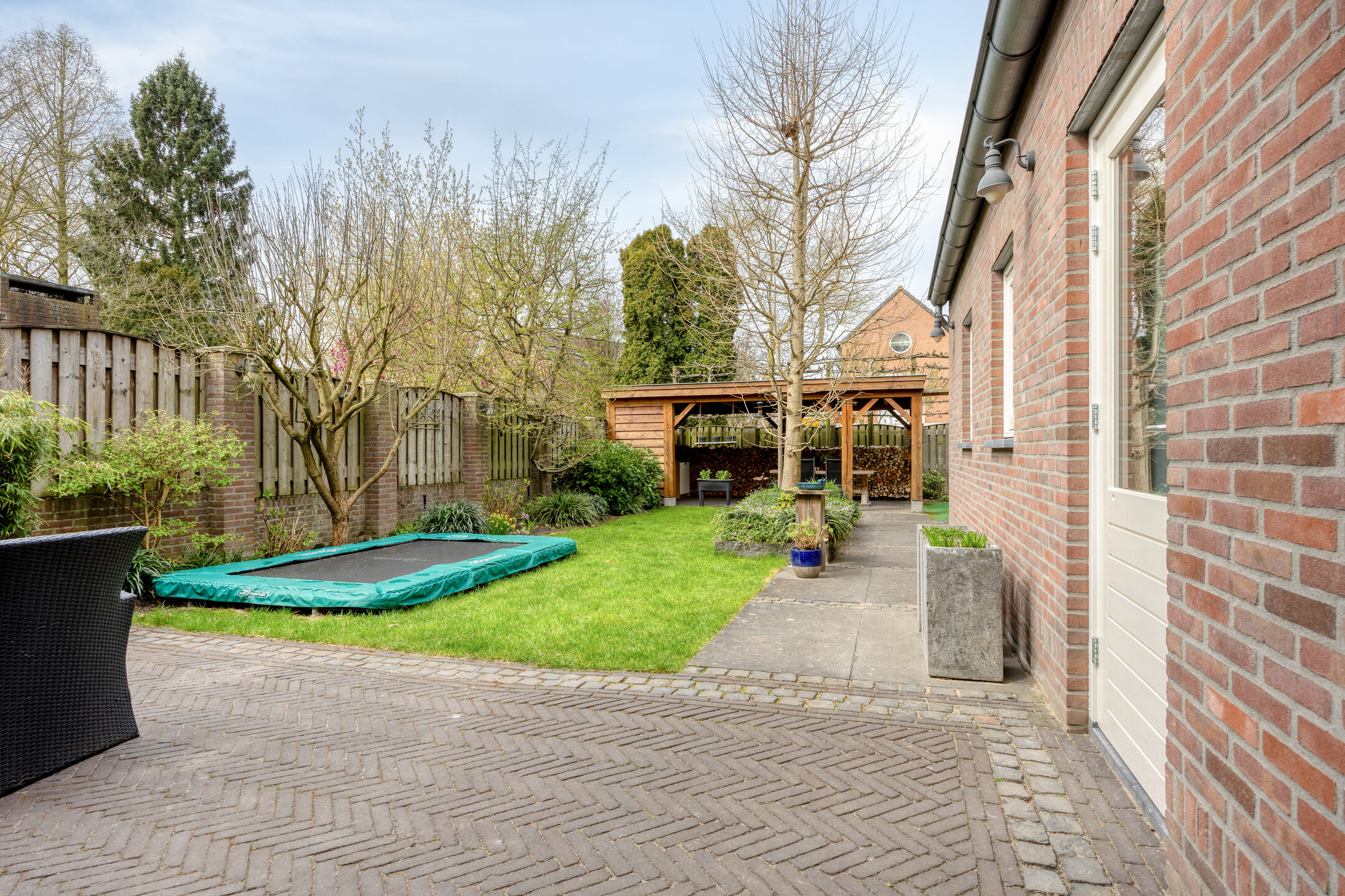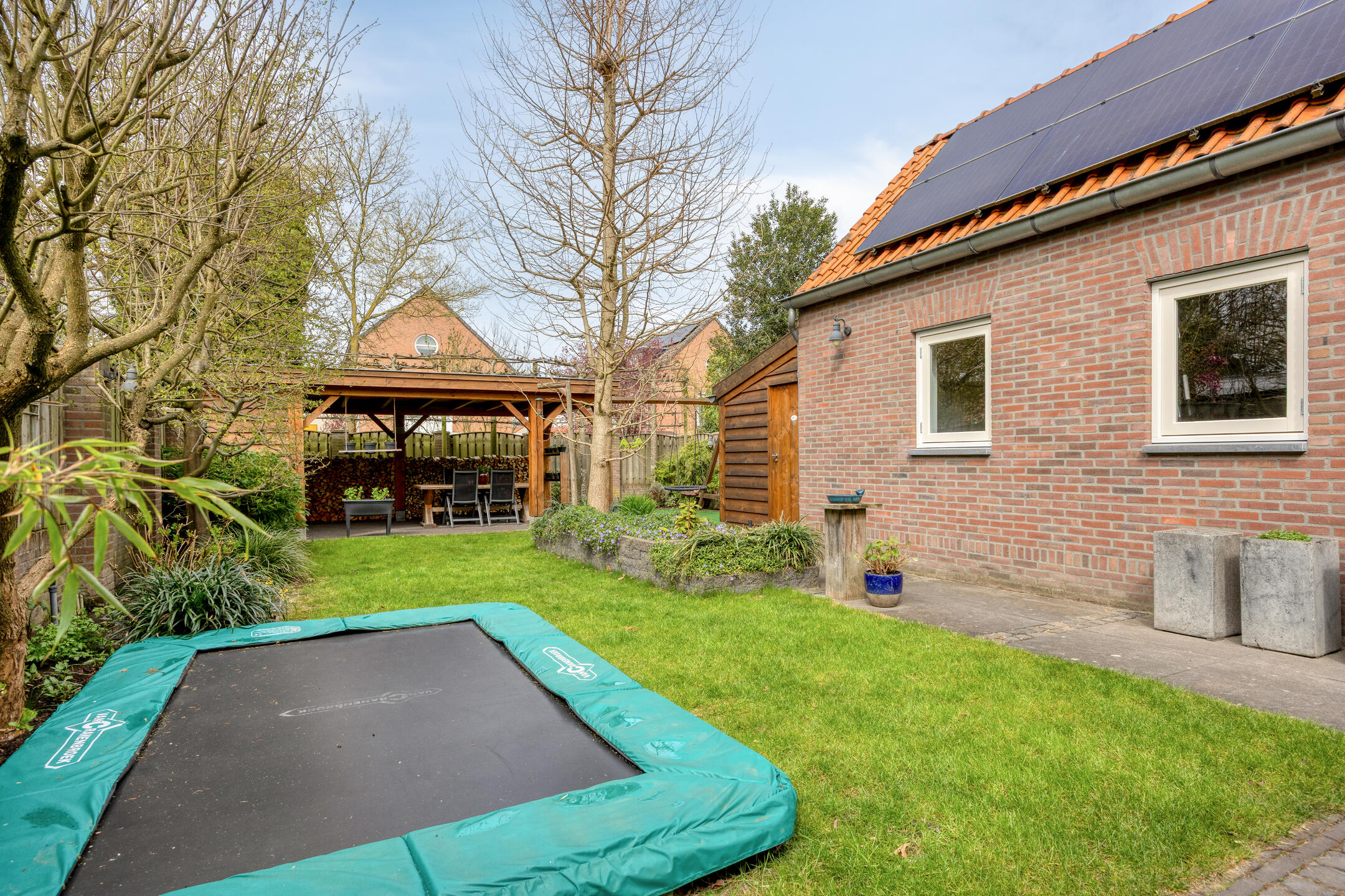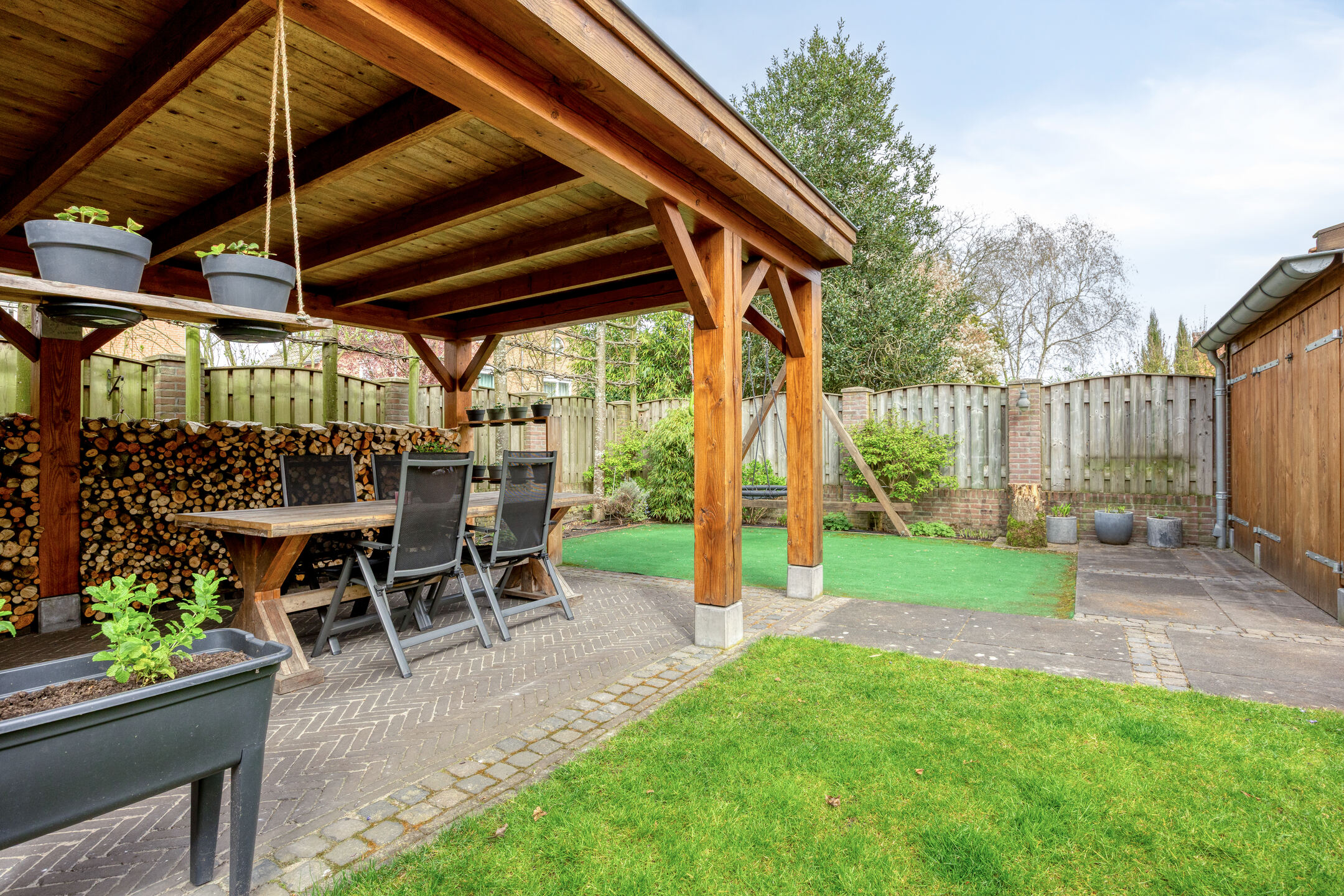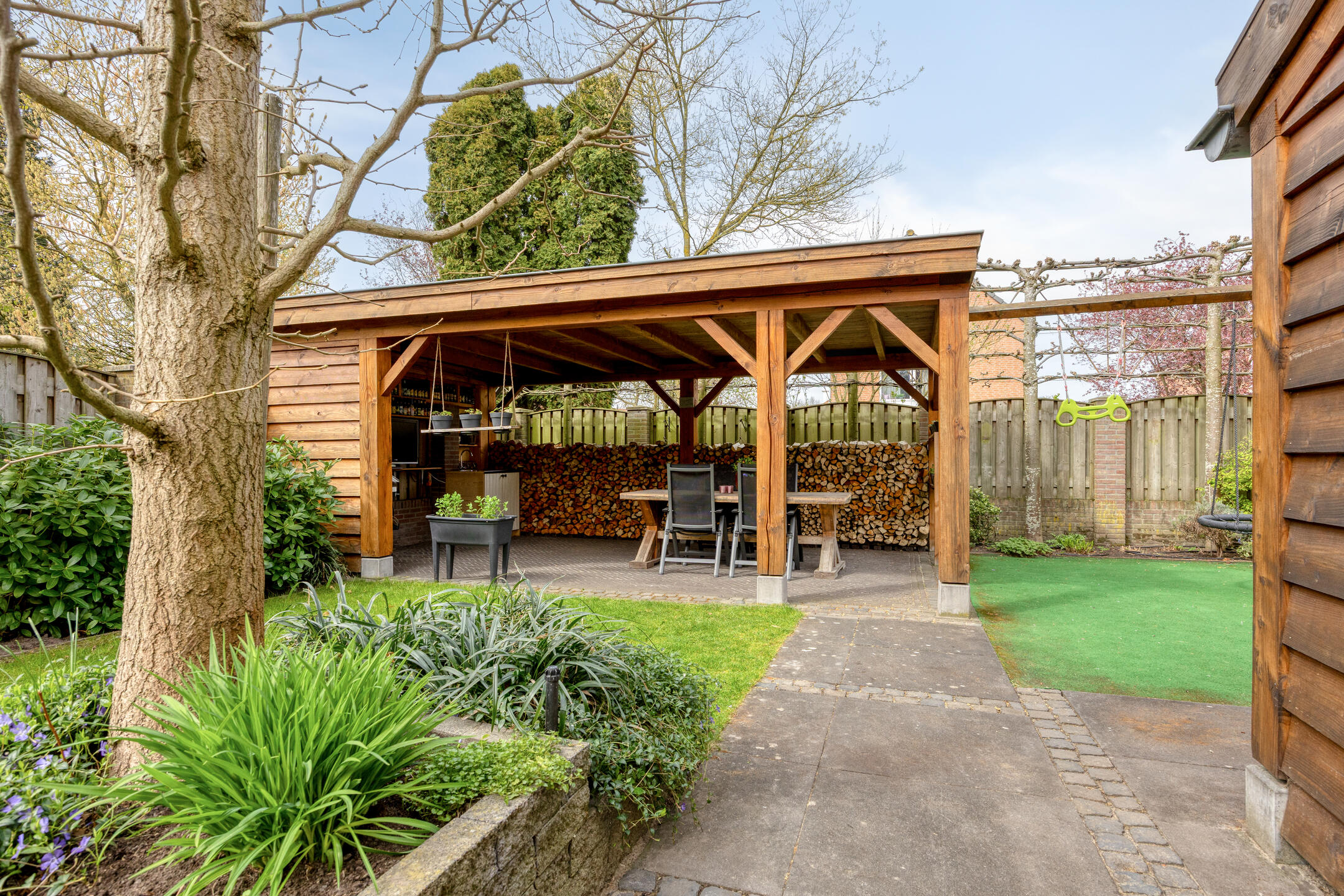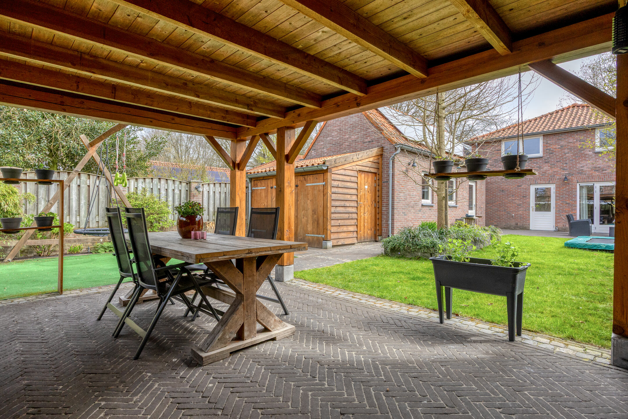– de overkapping achter in de tuin een fijne plek biedt om het hele jaar door buiten te zitten. Hier is ook een wastafel met koud kraanwater te vinden;