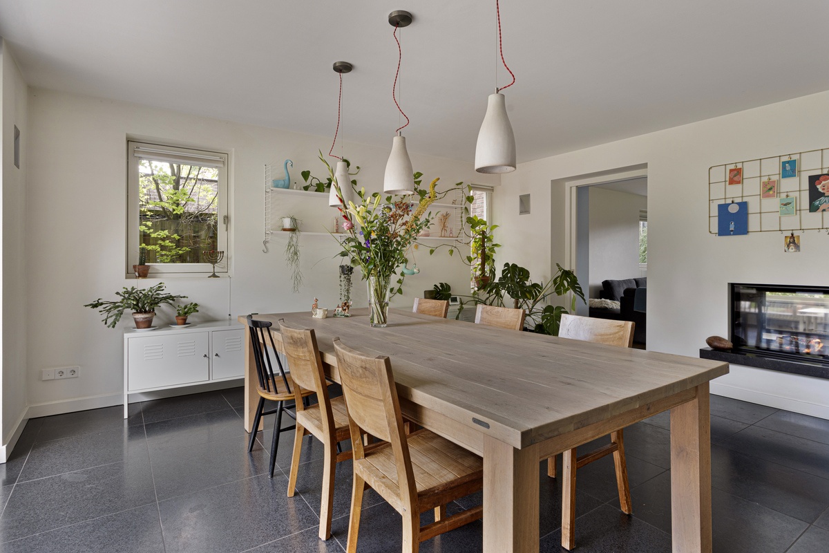 – er een sfeervolle (doorkijk) houthaard aanwezig is tussen de woonkamer en de keuken;