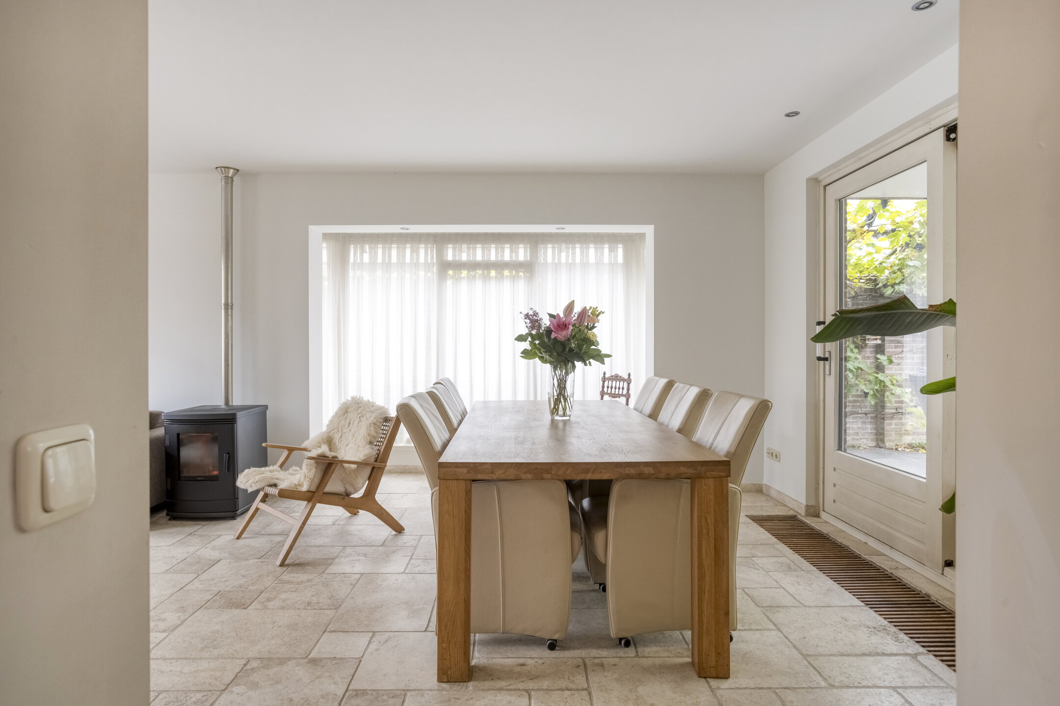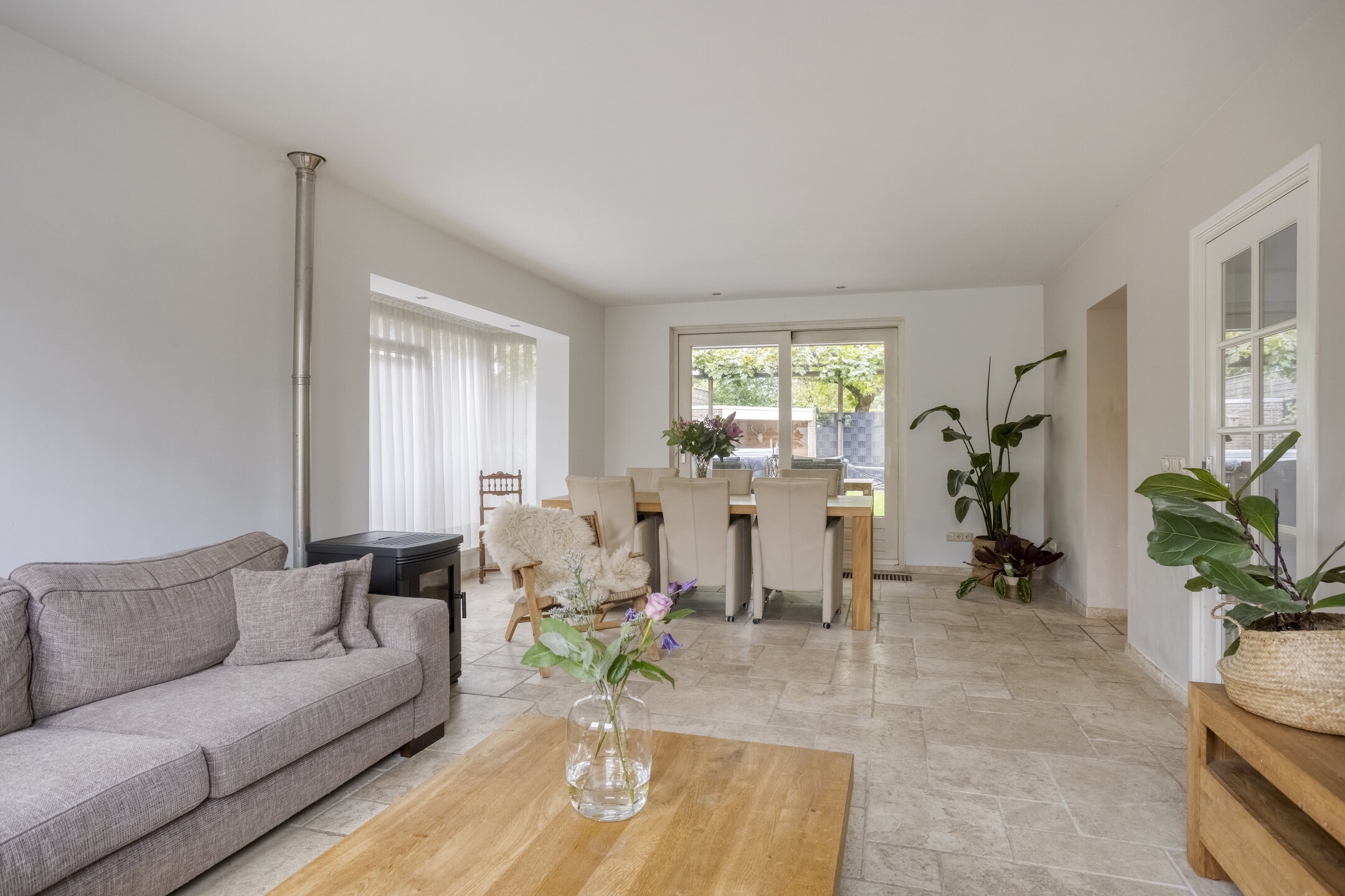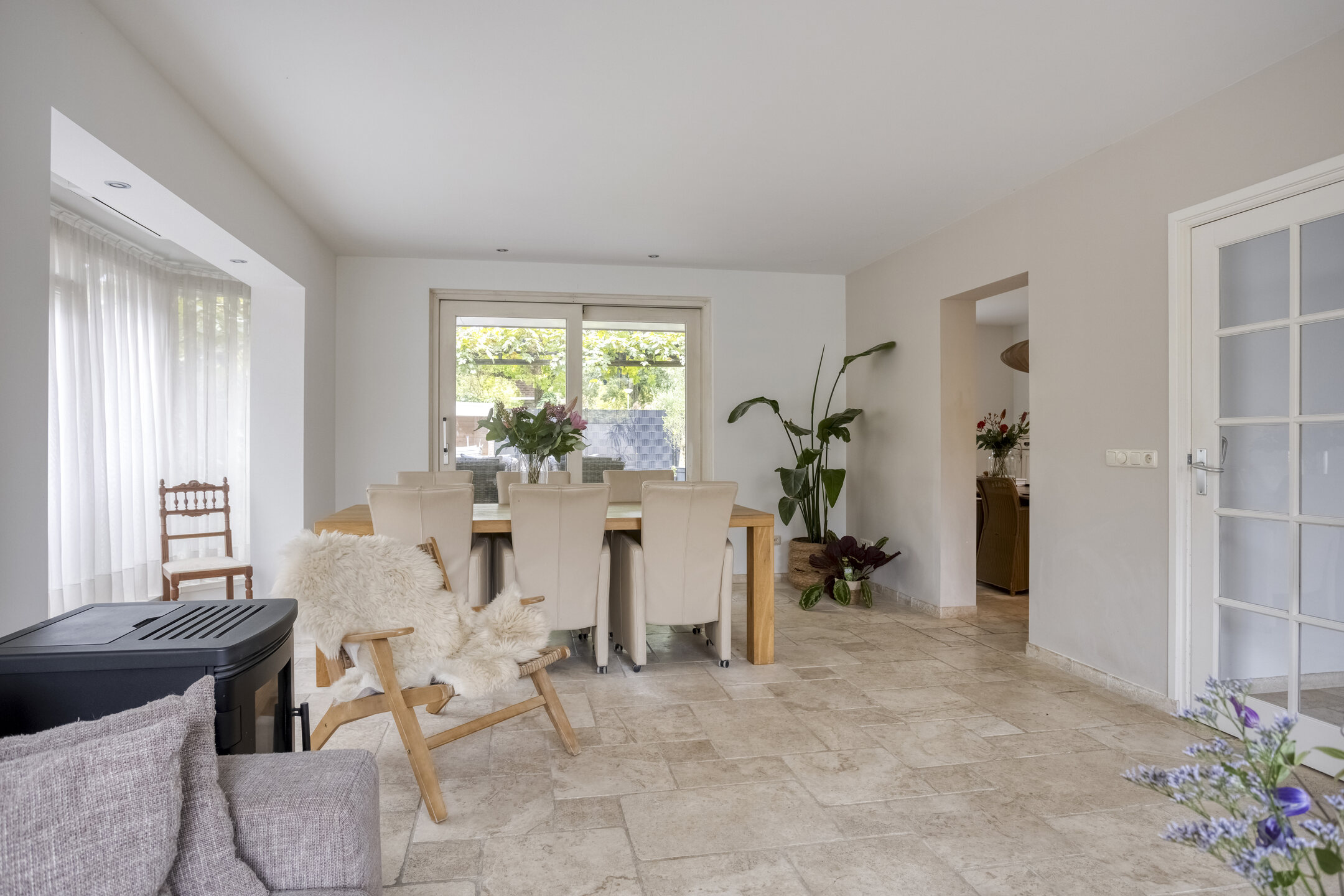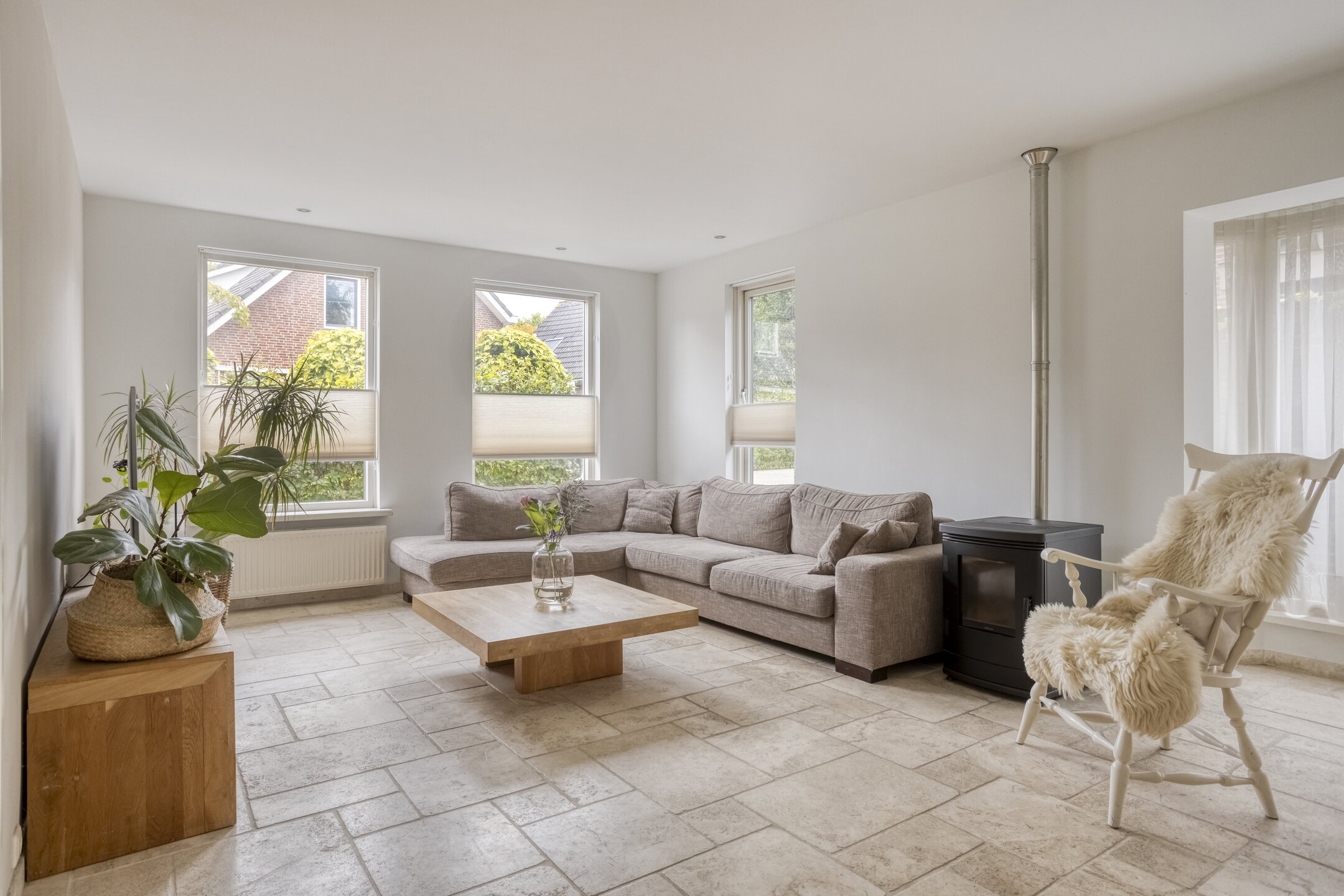 – de woonkamer is voorzien van vloerverwarming, een pelletkachel, strak gestucte plafonds met inbouwspots en een grote schuifpui naar de achtertuin;