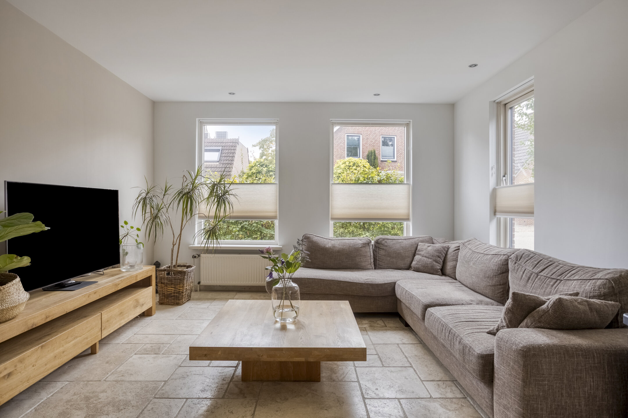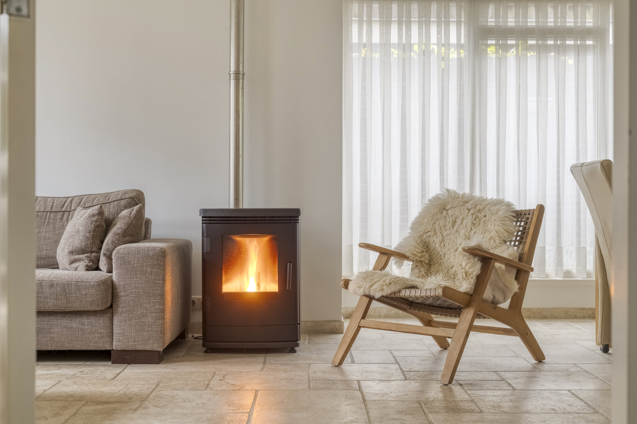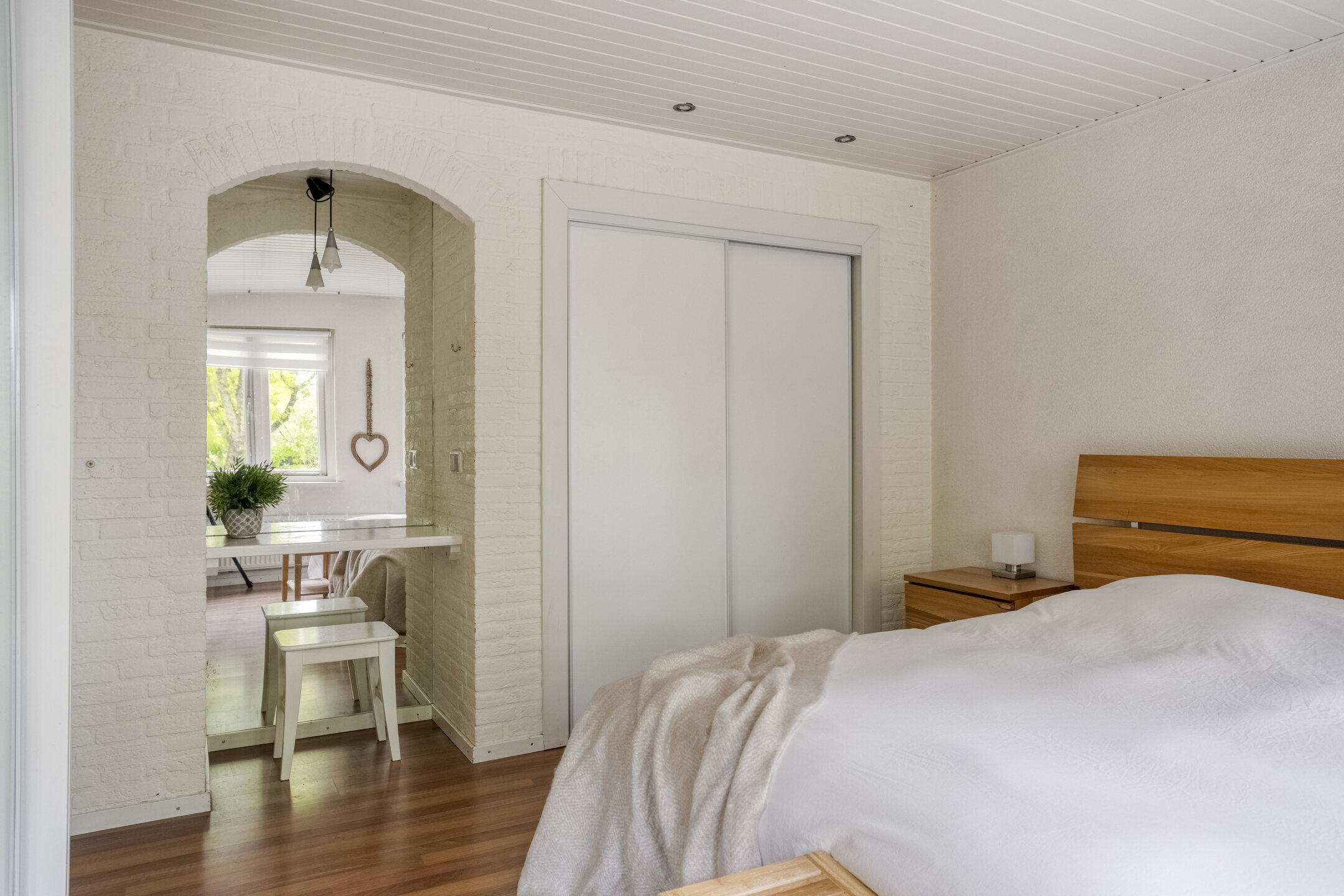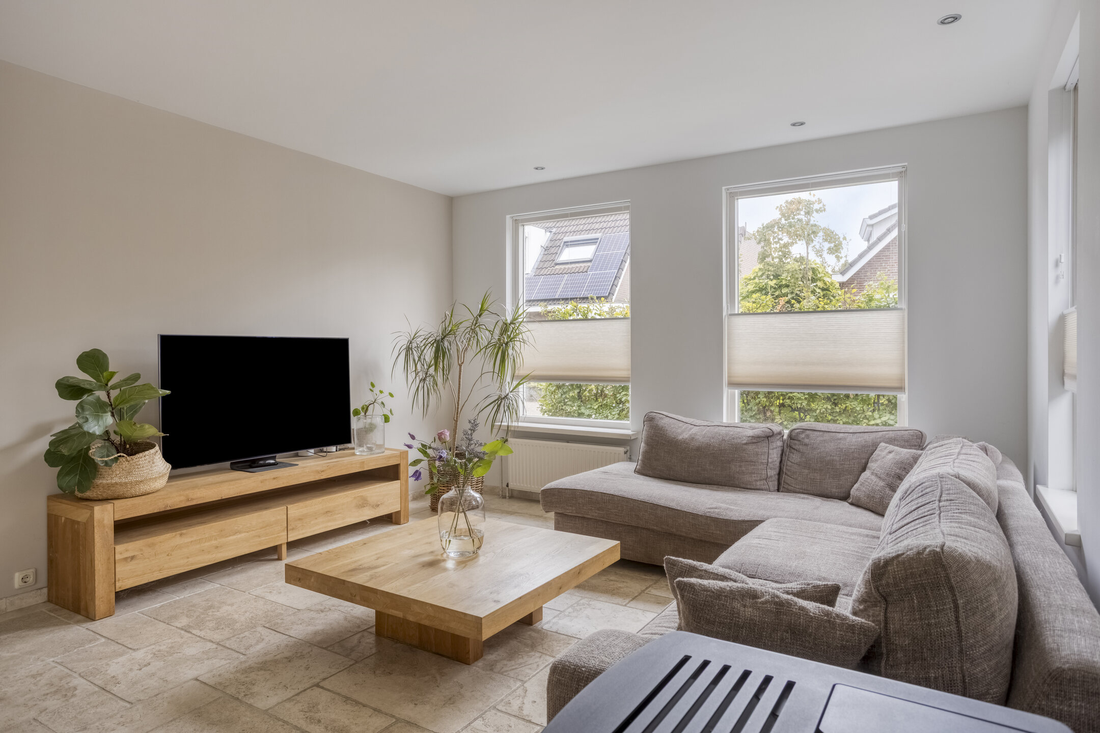 – de woonkamer is voorzien van vloerverwarming, een pelletkachel, strak gestucte plafonds met inbouwspots en een grote schuifpui naar de achtertuin;