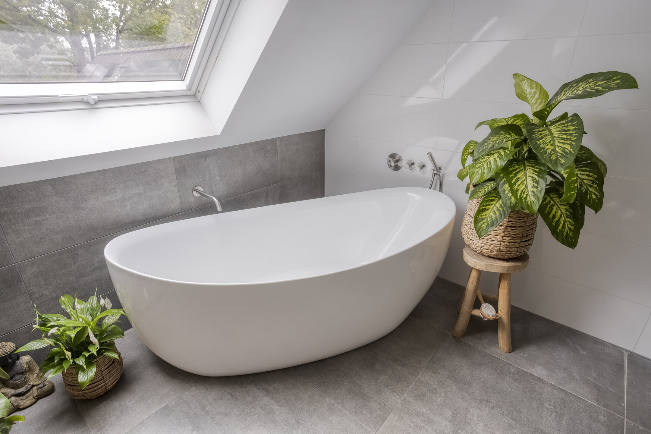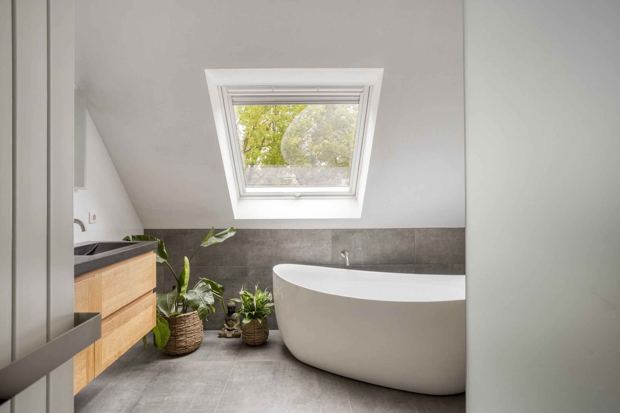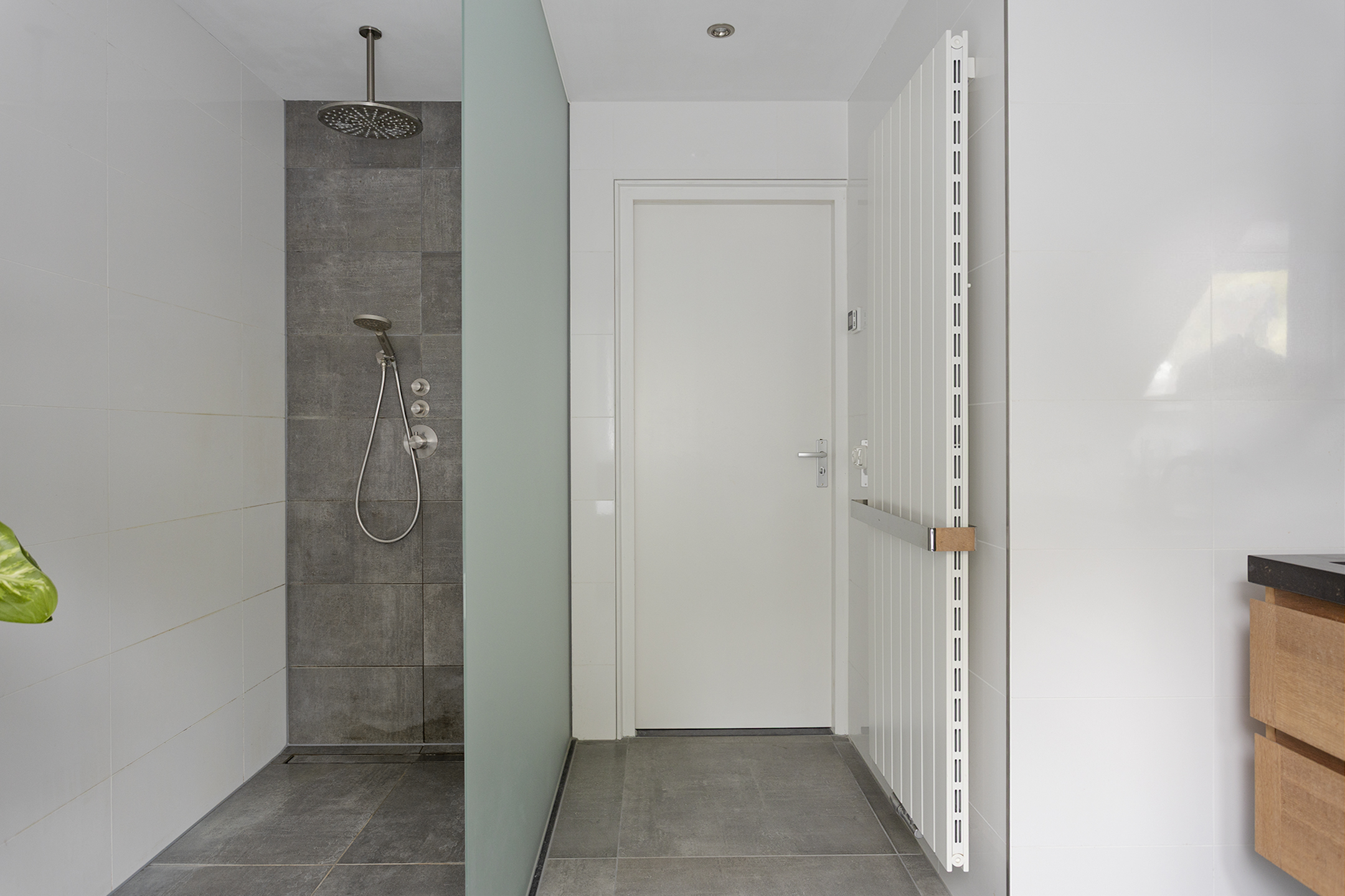 - Badkamervoorzieningen Ligbad, dubbele wastafel, wastafelmeubel, inloopdouche, vloerverwarming