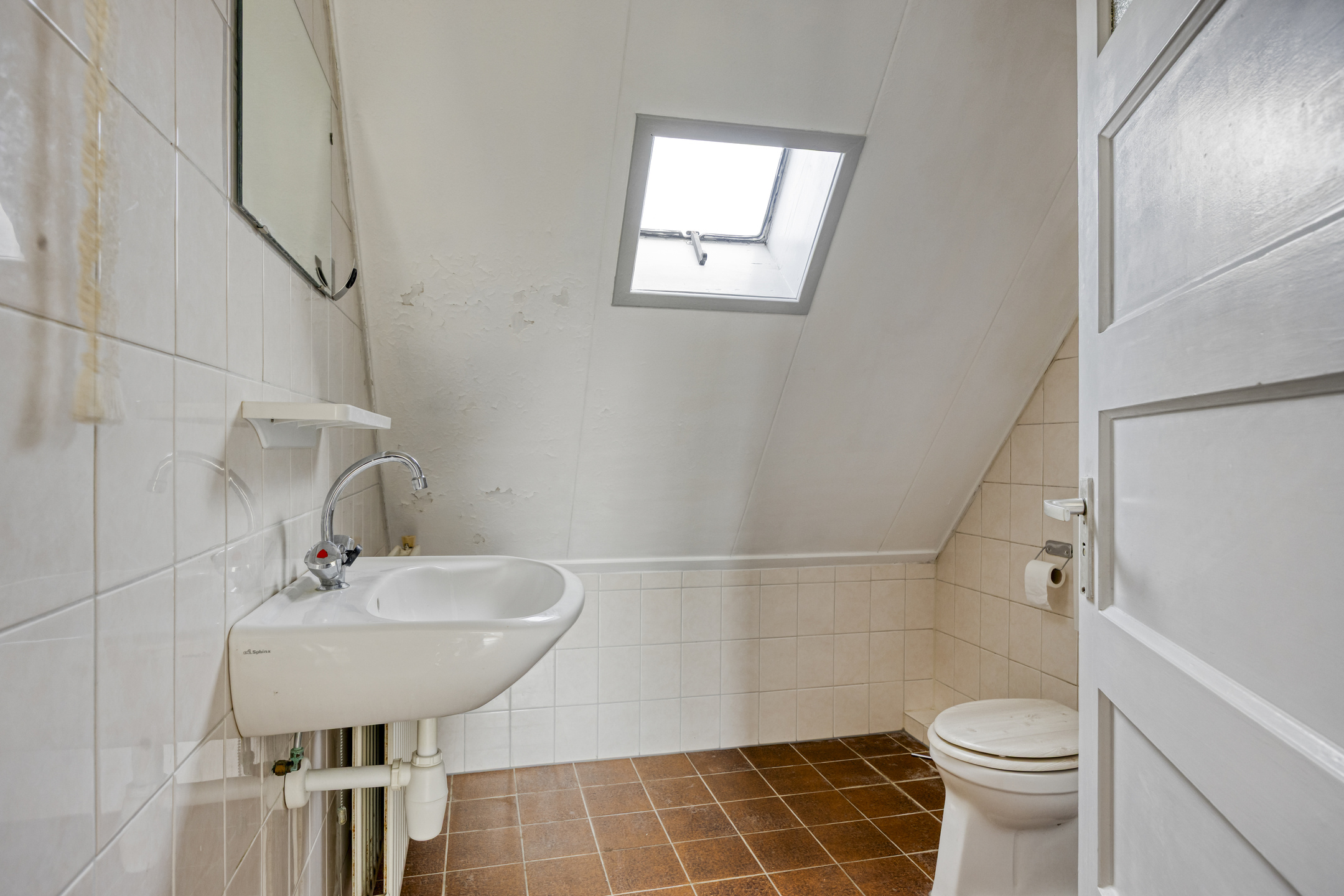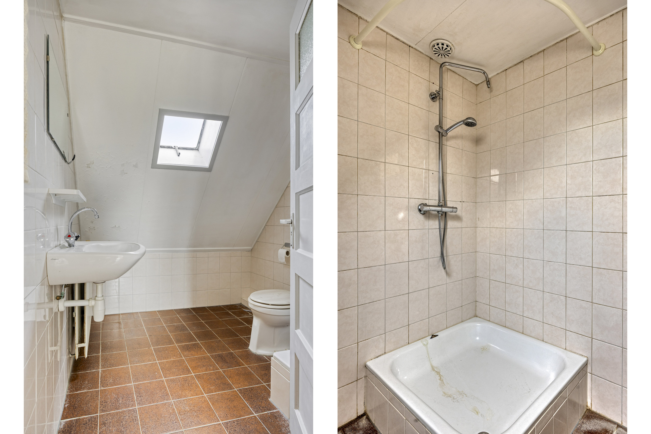 – de volledig betegelde badkamer op de verdieping is ingericht met een douche, toilet en wastafel;