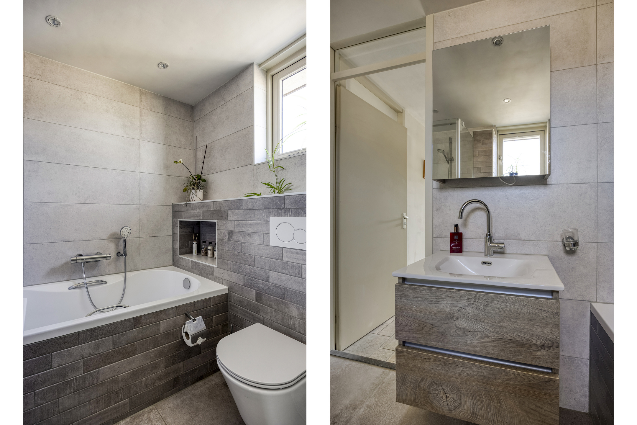– de moderne badkamer uit 2021 volledig is betegeld en is voorzien van een ligbad, inloopdouche, tweede toilet, wastafelmeubel en een verlaagd plafond met verlichting;